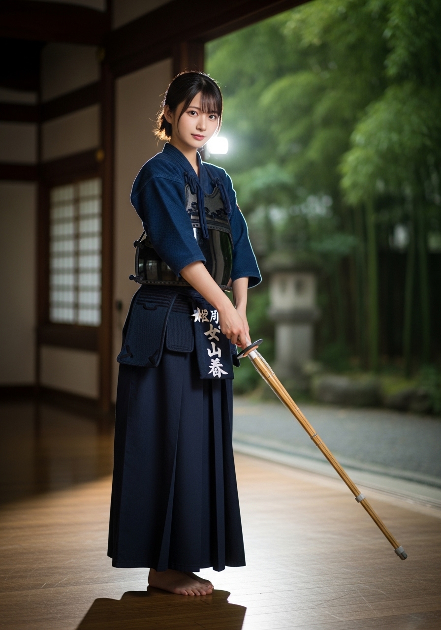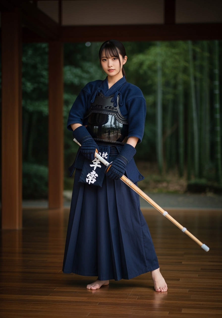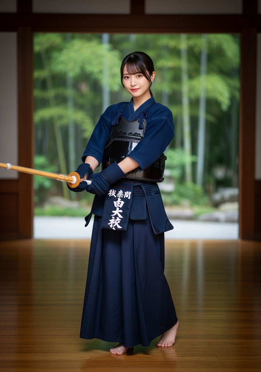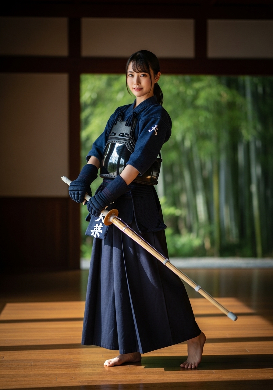 Framing: 剣道着の縦のラインとポーズのダイナミズムを強調する縦長の構図、または中央に配置し対称性を強調。