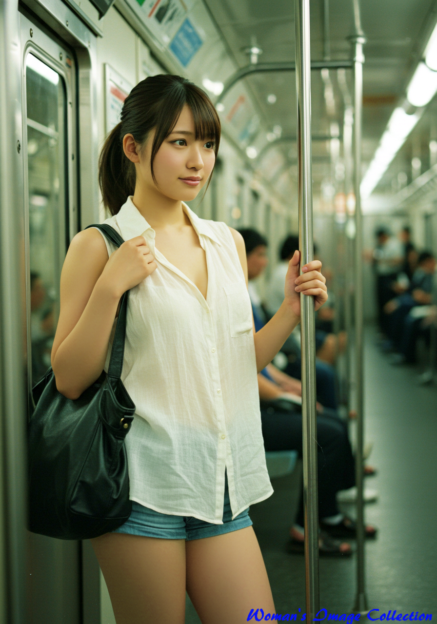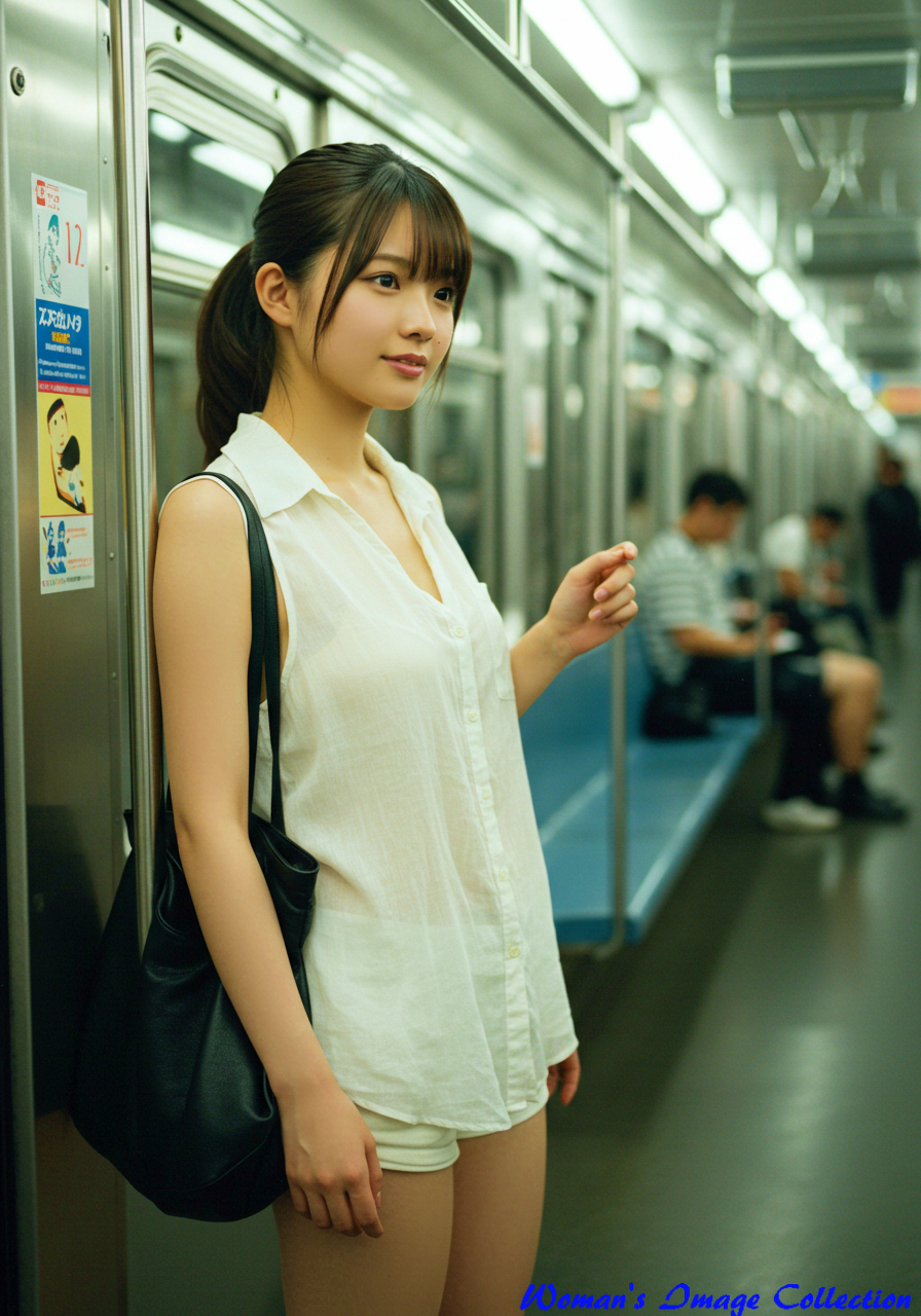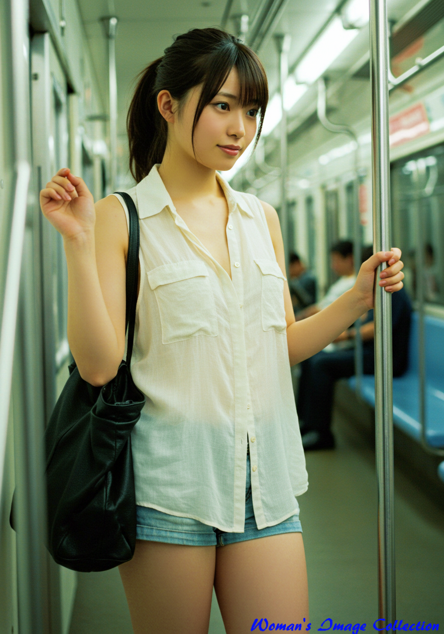 Subject: Type: 女性 Gender / Species: 足がとても長く豊満な白い肌のかわいい美人な日本人女性 Age / Condition: 20代前半、魅惑的なかわいい顔立ちと豊満な体型。巨乳。 Features: 無造作に結んだダークブラウンのポニーテール。 シースルーバングが顔にかかっている。 憂いを帯びた、にこやかな表情。 肩に黒い革製のショルダーバッグをかけている。 Clothing / Equipment: 白またはオフホワイトの麻のノースリーブのシアーシャツ。前が開いていて、デコルテラインと大きな胸の谷間が見える。生地は薄くシワがある。 シャツの前が開いていて大きな胸が目立つ。巨乳。ショーツ Emotion / Pose: 地下鉄のつり革の近くに立ち、窓の外を見つめるようにわずかに目を下に向けた、静かで思慮深いポーズ。 Setting: Location Type: 地下鉄 Specific Location: 地下鉄の車内。 Background Details: 窓の外は明るくぼかされ、車内の反射する金属のポールや座席が見える。 背景の人影は完全にぼかされ、人物に焦点を合わせている。 照明は蛍光灯で、全体的にローキーな雰囲気。 Style: Art Style: ノスタルジックなフィルム写真、シネマティックポートレート Artist / Photographer: 荒木経惟 Genre: スナップ写真、ポートレート、ノスタルジー Medium: 高感度フィルムで撮影された写真、フィルムグレイン Lighting & Atmosphere: Lighting Type: 車内の蛍光灯と窓からの弱い自然光。光と影のコントラストは強く、特に顔の影が感情を強調している。 Time of Day: 夕方、または曇りの日 Color Palette: くすんだグリーン、イエロー、グレー。全体的に彩度が低く、ローコントラスト色調。 Mood / Atmosphere: 孤独、内省、静けさ、親密、ノスタルジック。 Composition & Angle: Shot Type: クローズアップ(バストアップ) Angle: アイレベルまたはわずかなハイアングル。 Perspective: 極めて浅い被写界深度。顔にシャープな焦点を合わせ、背景を大きくぼかす。 Framing: 縦長の構図。顔とデコルテがフレームの主要な部分を占める。 Quality & Details: Resolution: フィルムスキャン特有の解像感 Realism: 非常にリアル。衣服のシワ、肌の質感、粒子感とわずかな色収差を再現。 Modifiers: 傑作、最高品質、フィルムグレイン、ヴィンテージ写真、エモい、ドキュメンタリー写真風Quality & Details: Resolution: 超高解像度、16K、プロ仕様のデジタル一眼レフで撮影されたような本物の写真のディテール Realism: 超リアル、フォトグラフィック、肌の質感、衣装の織り目、汗の微細な光沢まで再現。 Modifiers: 傑作、最高品質、映画のワンシーンのような、複雑なディテール、超精密な描写、完璧なライティングと構図、ヴォリュームのある光 Negative Prompt:低画質、ぼやけた、奇形、不自然な手、変なポーズ、変な顔、変な目、ブレている、不自然なポーズ、余分な指や手、歪んだ顔、汚れ 、裸体、子供、アニメ、漫画、3D Makeup: 繊細でナチュラルなメイクの美しい女性。 ふっくらとしたやや膨らんだ唇に、くっきりとしたキューピッドボウ。 自然なピーチピンクのリップスティックが唇を彩る。 豊かな瞳は優しいアイライナーとソフトなブラウンのアイシャドウで強調されている。