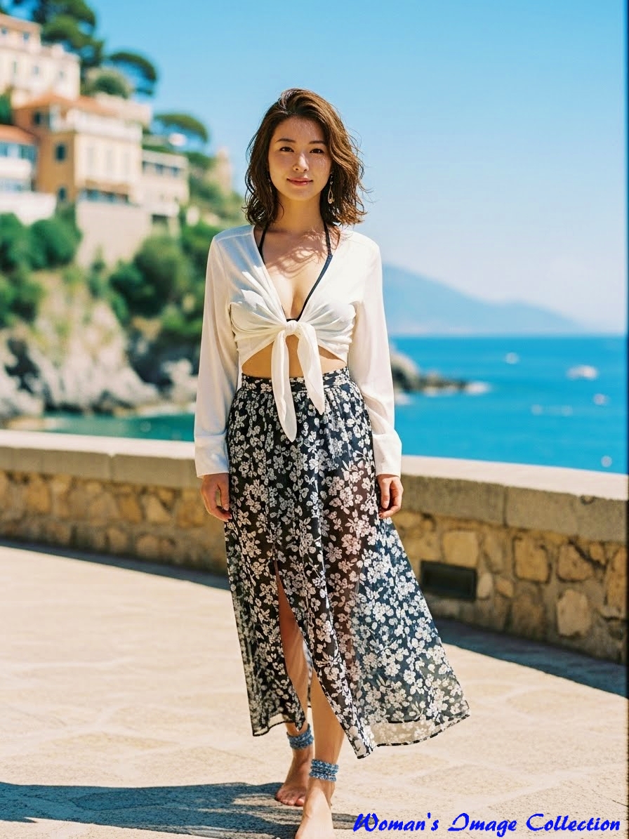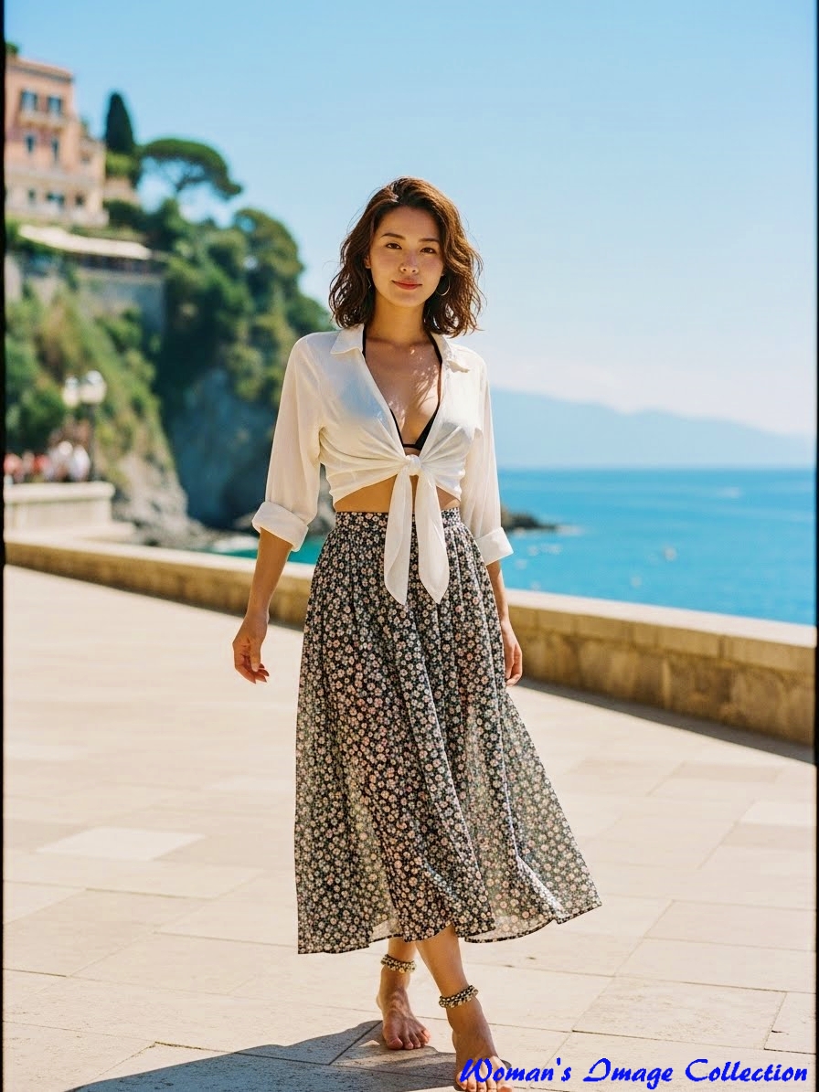 服装 (ビキニの水着, 前で結んだ白いシルクのブラウス, 大胆な胸元の露出, アンクレット, 裸足),