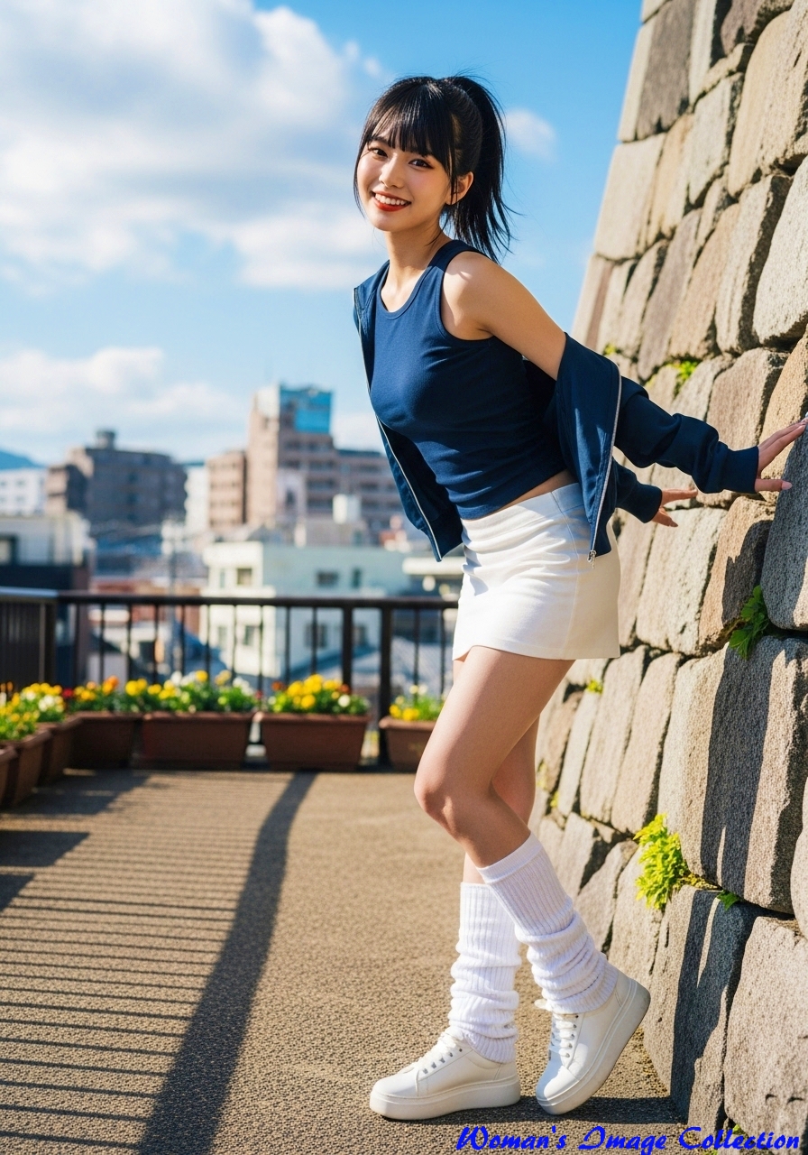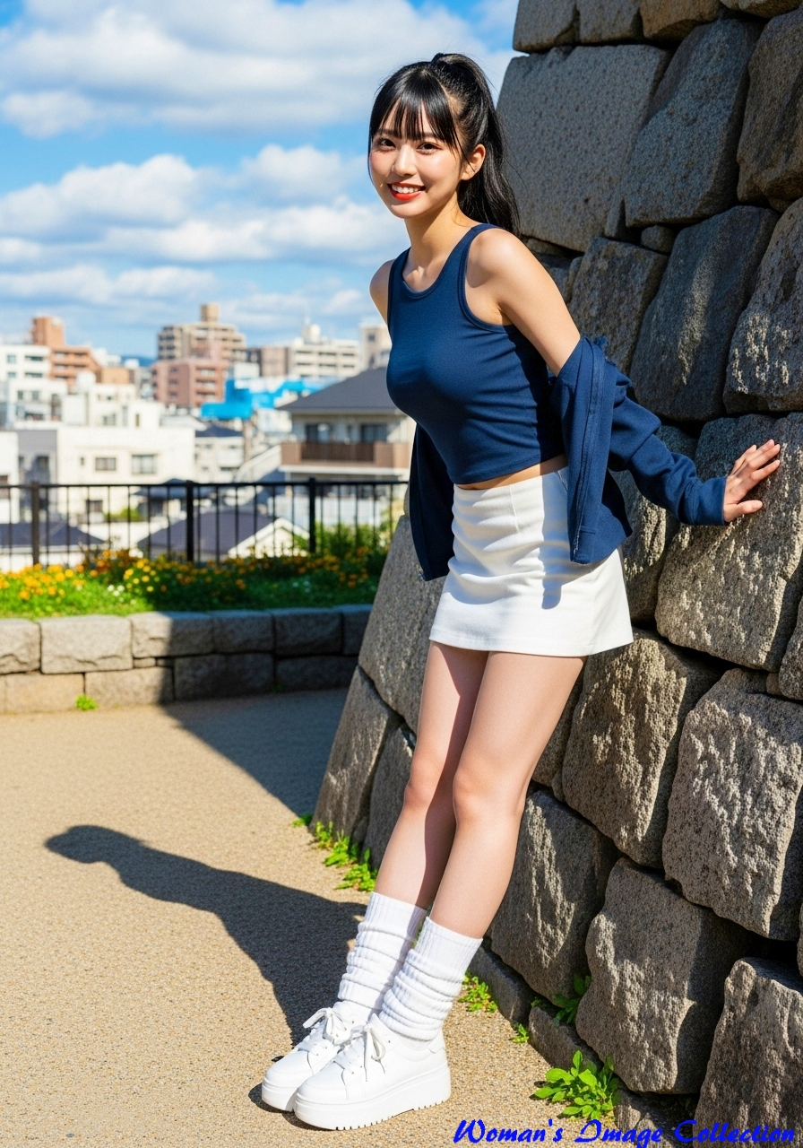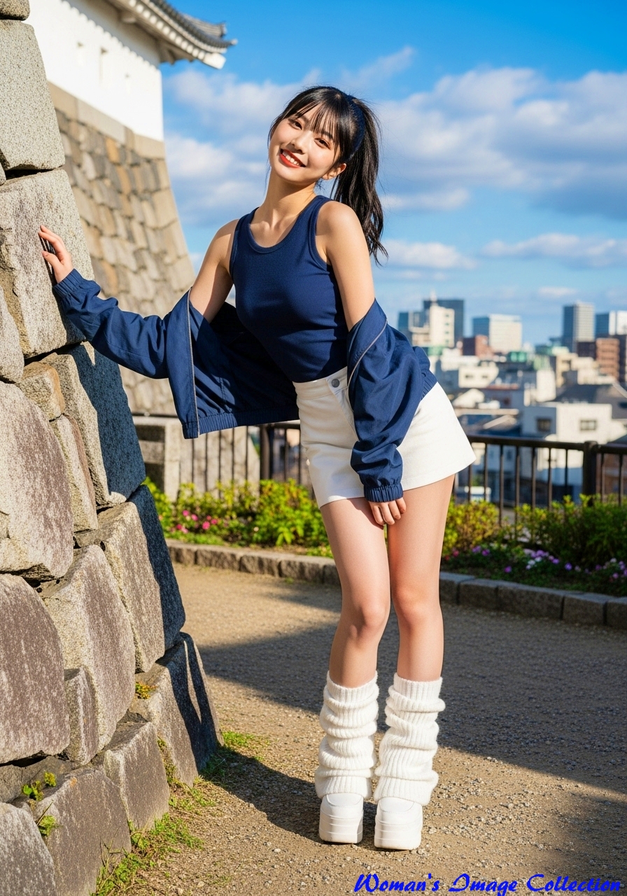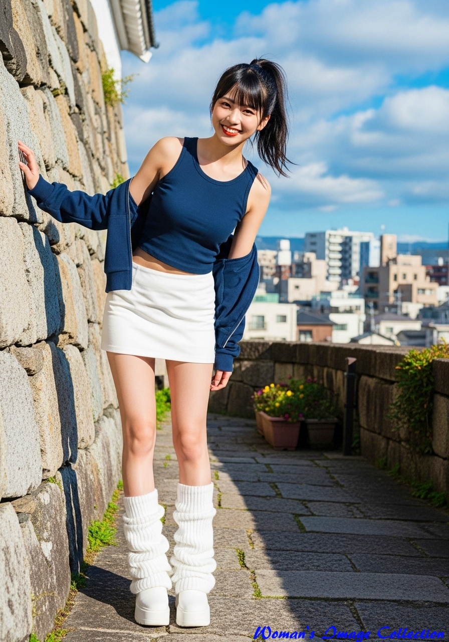 Emotion / Pose: カメラに向けられた明るい笑顔。日本の城の石垣にもたれかかるように立っているポーズ。片手を石垣に置いており、脚はクロスせず、まっすぐ立っている状態で、脚の長さを強調