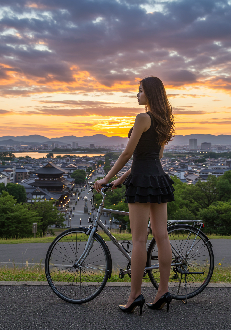 ロードバイクの傍らに立ち丘の上から眼下の古都を眺めている女性のプロンプトです。背景は夕暮れ時のオレンジ色た古都と川。服は黒のノースリーブのトップスとプリーツのミニスカート。