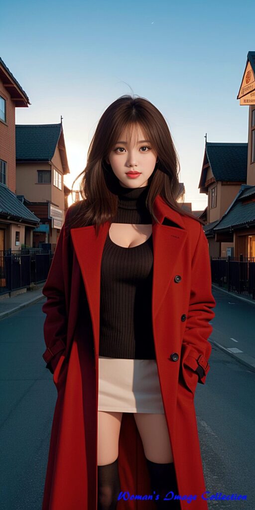 この画像は、夕方の柔らかな光に包まれた静かな街並みを背景に、エレガントで都会的な女性が立つ姿を捉えています。夕陽の光が赤みを帯びたコートを引き立て、暖かみのあるシーンを演出しています。この写真は、ファッションの美しさと街の雰囲気が絶妙に融合した一瞬を見事に表現しています。