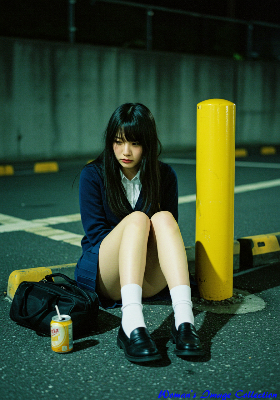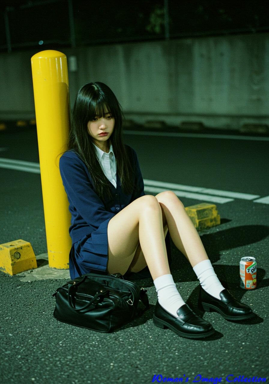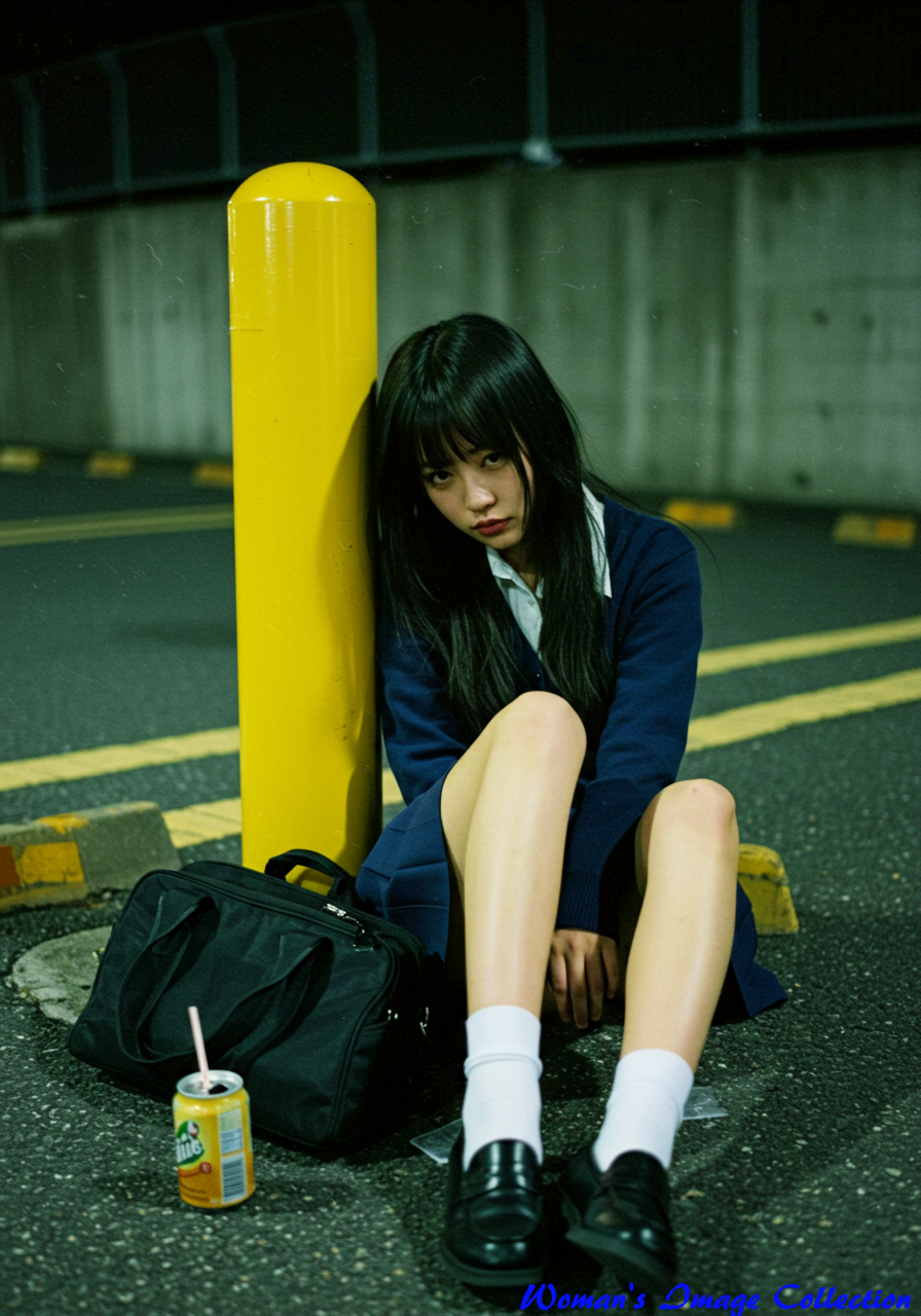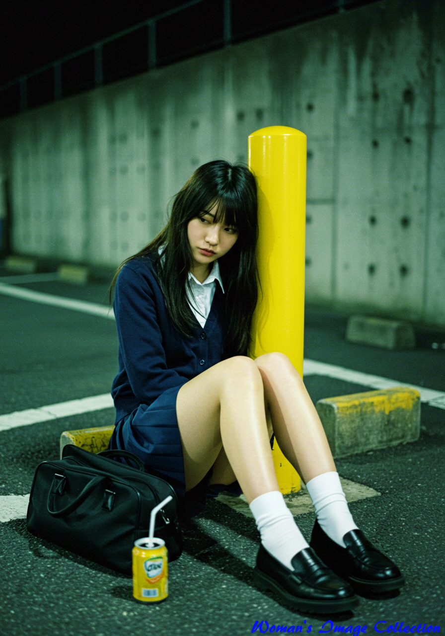 Subject: Type: 女性 Gender / Species: 足がとても長く豊満な白い肌のかわいい美人な日本人女性 Age / Condition: 10代後半から20代前半の、憂いを帯びた顔立ちと豊満な体型。 Features: 黒髪で、顔が隠れるほどの長い前髪と全体的に無造作なヘアスタイル。 顔は下を向いており、表情は隠れているか、疲れたような、または物思いにふけるような曖昧な状態。 隣に黒いバッグが置かれている。 Clothing / Equipment: 濃紺のカーディガン。 白い襟のブラウス。 濃紺のミニ丈のプリーツスカート。 白いルーズソックス(非常に厚手でたるんでいる)と黒のローファー。 近くにジュースの空き缶が置かれている。 Emotion / Pose: アスファルトの地面に座り込み、膝を曲げ、身体を丸めて黄色いパイプにもたれている。 疲労感と孤独を感じさせる、無防備なポーズ。 Setting: Location Type: 屋外(都市) Specific Location: 夜の都市の駐車場。 Background Details: 背景は非常に暗い。黄色いU字型またはパイプ状の車止めが明るく照らされている。 地面は黒い砂利、またはアスファルトで、黄色い駐車ラインのようなものが見える。 背景の壁はコンクリートで、ディテールはほぼ影に沈んでいる。 Style: Art Style: ローファイ・フィルム写真、ノスタルジックなストリートスナップ、低光量下のドキュメンタリー Artist / Photographer: 当時のアマチュア写真家、日常を切り取る写真家 Genre: プライベートポートレート、エモい、ストリート、ノスタルジー Medium: 高感度フィルムで撮影された写真 Lighting & Atmosphere: Lighting Type: 街灯または駐車場灯からの強い黄色い光が、主に黄色いパイプと地面を照らす。 人物は半逆光で、顔は暗い。光と影のコントラストが非常に強い。 Time of Day: 深夜 Color Palette: 濃い影の黒、鮮やかなイエローパイプ、濃紺、ルーズソックスの白。 全体的に彩度が低く、暗く沈んだ色調。 Mood / Atmosphere: 孤独、倦怠感、無気力、アンダーグラウンド、ノスタルジック。 Composition & Angle: Shot Type: 全身のポートレート Angle: アイレベルまたはわずかなハイアングル。 Perspective: 極めて浅い被写界深度。ルーズソックスと空き缶にシャープな焦点を合わせる。 Framing: 垂直構図。黄色いパイプと人物の対比を強調。 Quality & Details: Resolution: フィルム写真特有の解像感 Realism: 非常にリアル。衣服のシワ、靴の光沢、強い粒子感と色被りを忠実に再現。 Modifiers: 傑作、最高品質、フィルムグレイン、ヴィンテージ、ローファイ、親密な瞬間、テクスチャ感、強い影 Negative Prompt:低画質、奇形、不自然な手、変なポーズ、変な顔、変な目、ブレている、不自然なポーズ、余分な指や手、歪んだ顔、汚れ、裸体、しわ、汚れ、明るすぎる照明 Makeup: 繊細でナチュラルなメイクの美しい女性。 ふっくらとしたやや膨らんだ唇に、くっきりとしたキューピッドボウ。 自然なピーチピンクのリップスティックが唇を彩る。 豊かな瞳は優しいアイライナーとソフトなブラウンのアイシャドウで強調されている。