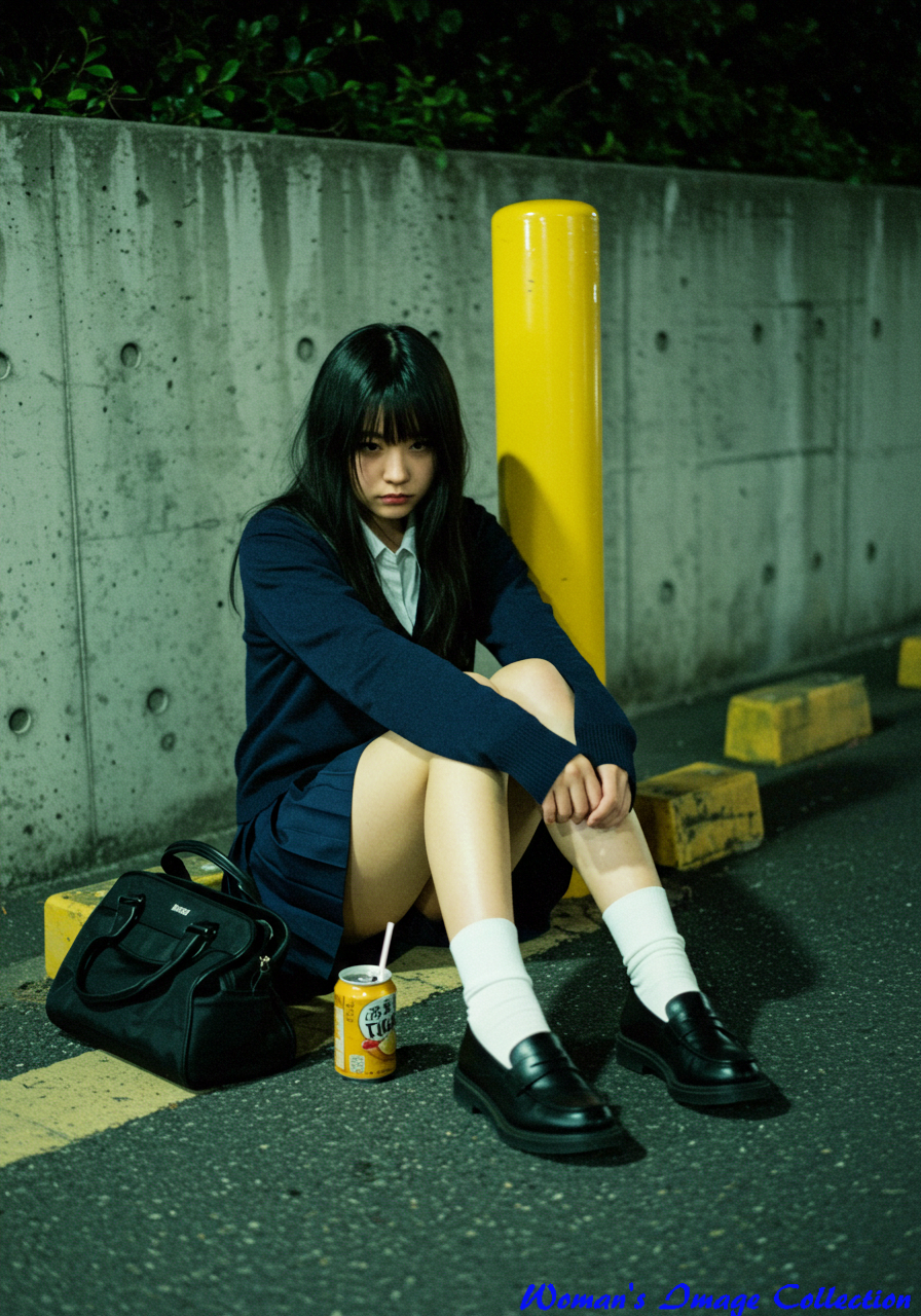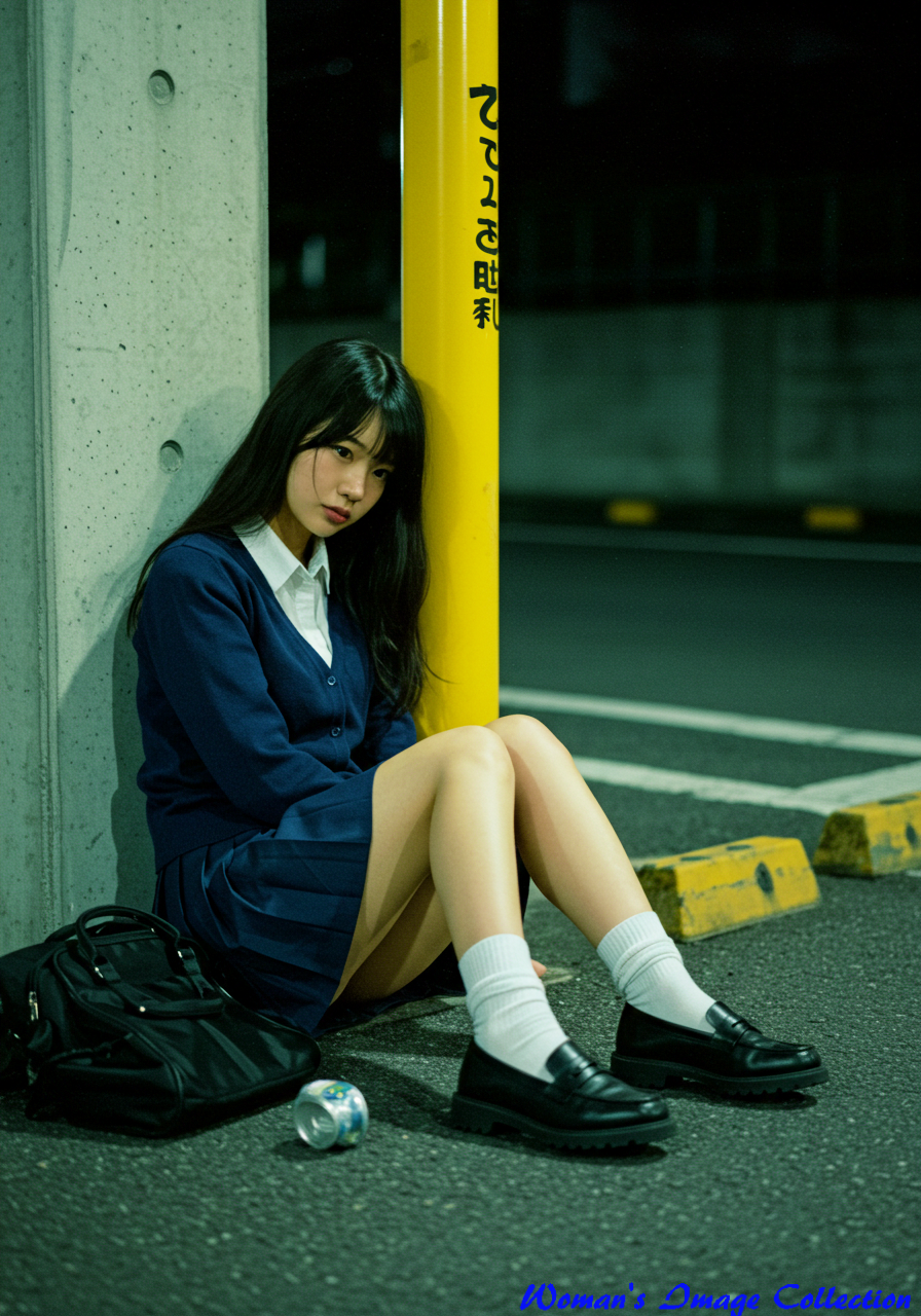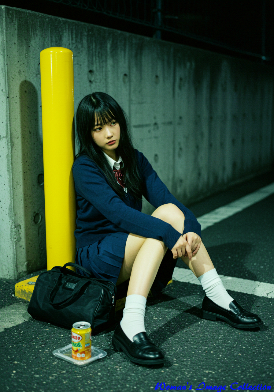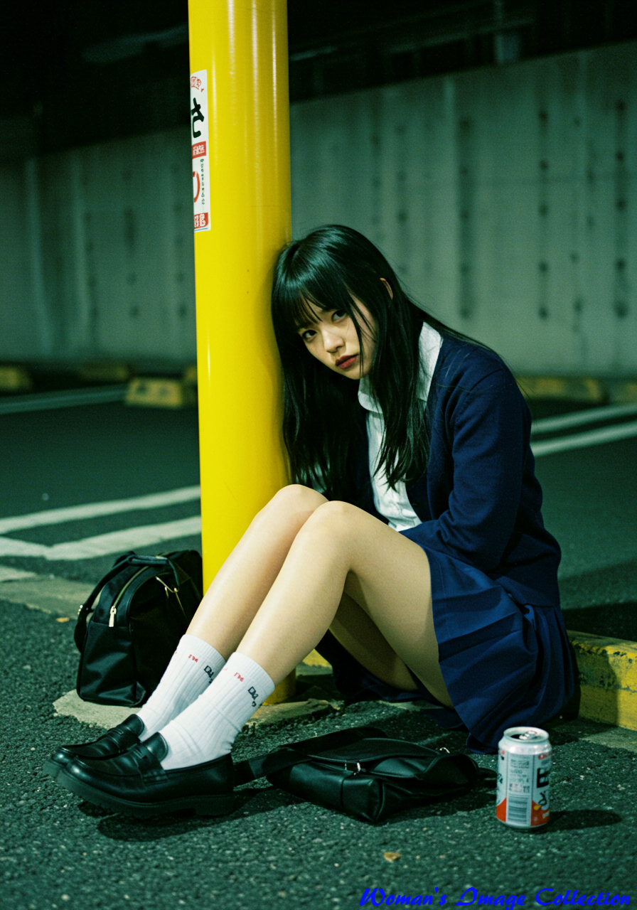 Subject: Type: 女性 Gender / Species: 足がとても長く豊満な白い肌のかわいい美人な日本人女性 Age / Condition: 10代後半から20代前半の、憂いを帯びた顔立ちと豊満な体型。 Features: 黒髪で、顔が隠れるほどの長い前髪と全体的に無造作なヘアスタイル。 顔は下を向いており、表情は隠れているか、疲れたような、または物思いにふけるような曖昧な状態。 隣に黒いバッグが置かれている。 Clothing / Equipment: 濃紺のカーディガン。 白い襟のブラウス。 濃紺のミニ丈のプリーツスカート。 白いルーズソックス(非常に厚手でたるんでいる)と黒のローファー。 近くにジュースの空き缶が置かれている。 Emotion / Pose: アスファルトの地面に座り込み、膝を曲げ、身体を丸めて黄色いパイプにもたれている。 疲労感と孤独を感じさせる、無防備なポーズ。 Setting: Location Type: 屋外(都市) Specific Location: 夜の都市の駐車場。 Background Details: 背景は非常に暗い。黄色いU字型またはパイプ状の車止めが明るく照らされている。 地面は黒い砂利、またはアスファルトで、黄色い駐車ラインのようなものが見える。 背景の壁はコンクリートで、ディテールはほぼ影に沈んでいる。 Style: Art Style: ローファイ・フィルム写真、ノスタルジックなストリートスナップ、低光量下のドキュメンタリー Artist / Photographer: 当時のアマチュア写真家、日常を切り取る写真家 Genre: プライベートポートレート、エモい、ストリート、ノスタルジー Medium: 高感度フィルムで撮影された写真 Lighting & Atmosphere: Lighting Type: 街灯または駐車場灯からの強い黄色い光が、主に黄色いパイプと地面を照らす。 人物は半逆光で、顔は暗い。光と影のコントラストが非常に強い。 Time of Day: 深夜 Color Palette: 濃い影の黒、鮮やかなイエローパイプ、濃紺、ルーズソックスの白。 全体的に彩度が低く、暗く沈んだ色調。 Mood / Atmosphere: 孤独、倦怠感、無気力、アンダーグラウンド、ノスタルジック。 Composition & Angle: Shot Type: 全身のポートレート Angle: アイレベルまたはわずかなハイアングル。 Perspective: 極めて浅い被写界深度。ルーズソックスと空き缶にシャープな焦点を合わせる。 Framing: 垂直構図。黄色いパイプと人物の対比を強調。 Quality & Details: Resolution: フィルム写真特有の解像感 Realism: 非常にリアル。衣服のシワ、靴の光沢、強い粒子感と色被りを忠実に再現。 Modifiers: 傑作、最高品質、フィルムグレイン、ヴィンテージ、ローファイ、親密な瞬間、テクスチャ感、強い影 Negative Prompt:低画質、奇形、不自然な手、変なポーズ、変な顔、変な目、ブレている、不自然なポーズ、余分な指や手、歪んだ顔、汚れ、裸体、しわ、汚れ、明るすぎる照明 Makeup: 繊細でナチュラルなメイクの美しい女性。 ふっくらとしたやや膨らんだ唇に、くっきりとしたキューピッドボウ。 自然なピーチピンクのリップスティックが唇を彩る。 豊かな瞳は優しいアイライナーとソフトなブラウンのアイシャドウで強調されている。