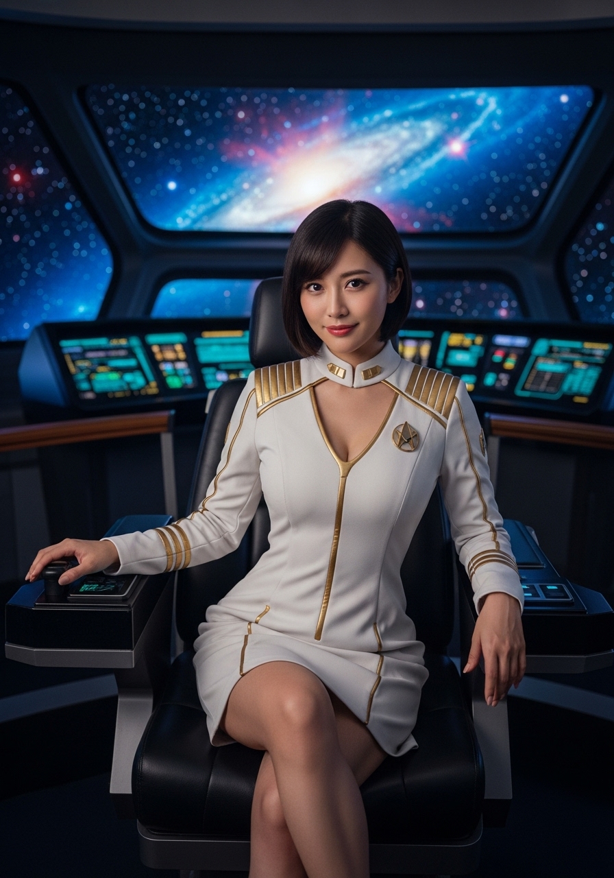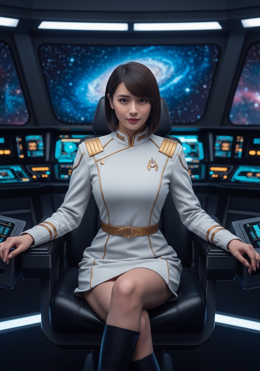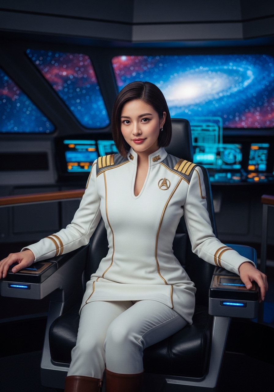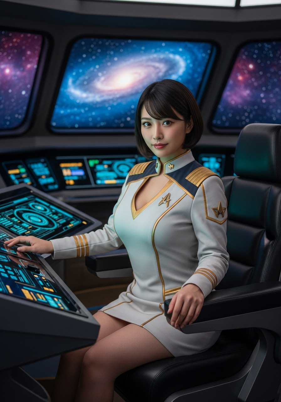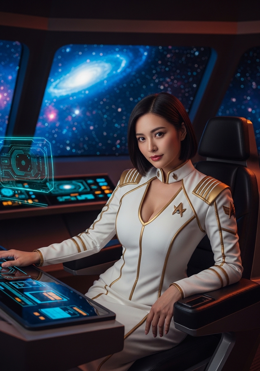 Background Details: 主役の艦長と制服を際立たせる、目立つSF的な光とディテール。ホログラフィックな表示、青や緑に光る未来的なコンソール。背景の宇宙は、女性の周りに光の輪郭を作る。
