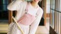 コスメ (ナチュラルで透明感のあるメイク, ピンク系のリップとチーク, パッチリとした瞳, 自然な濡れた肌),