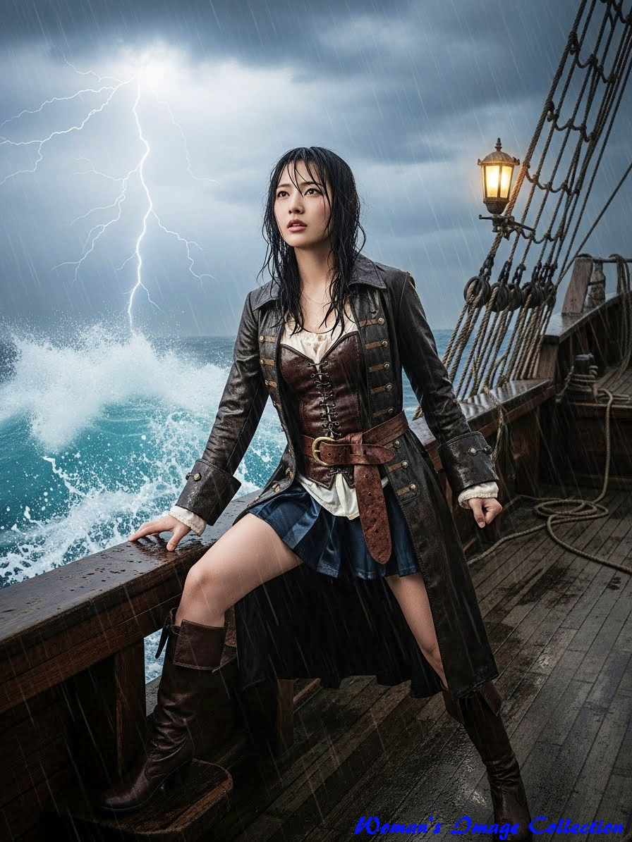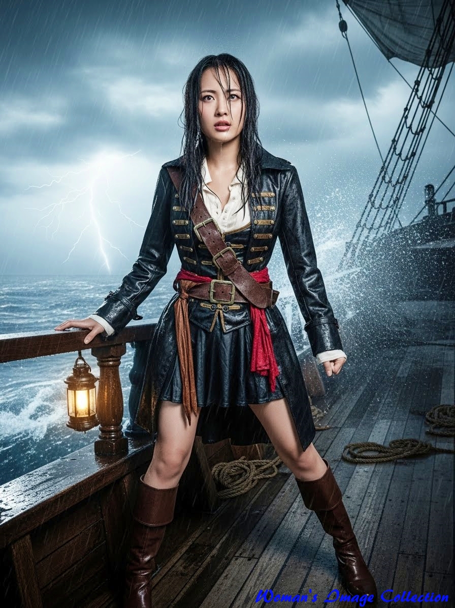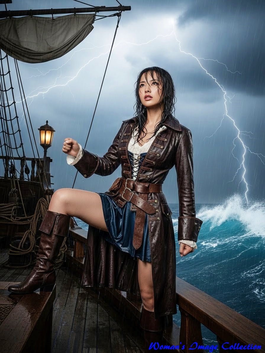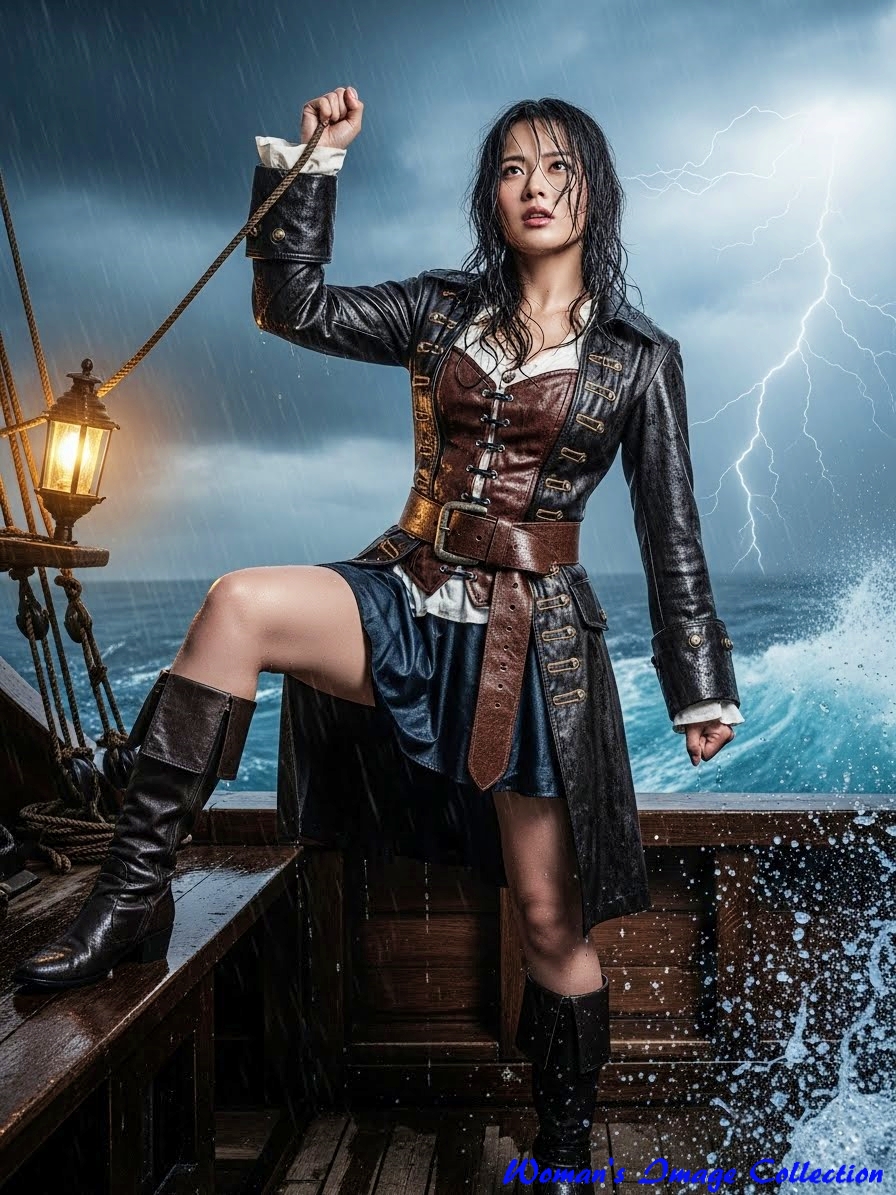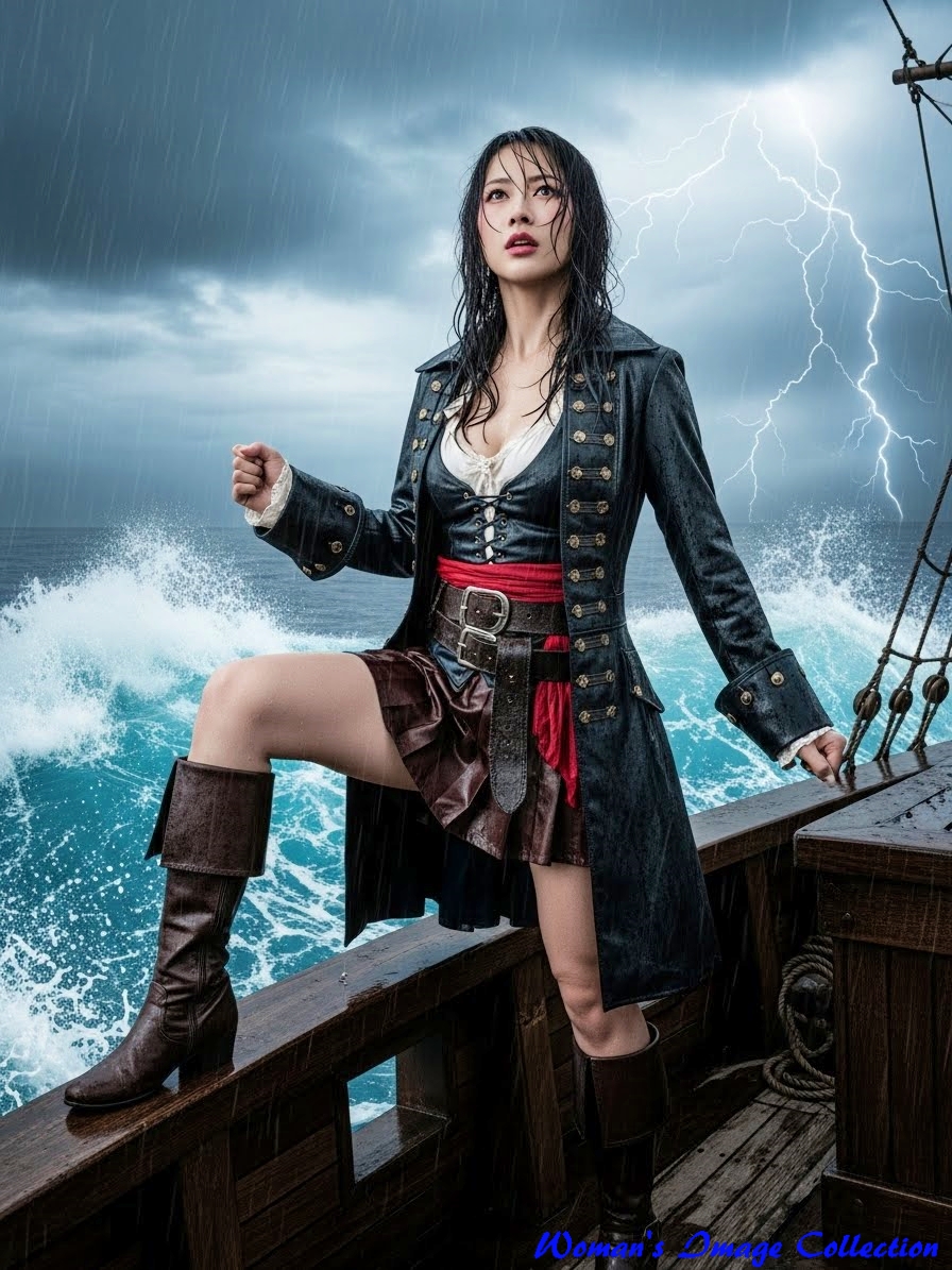 嵐の中で、指揮をとる女海賊のプロンプトを作ってみました。