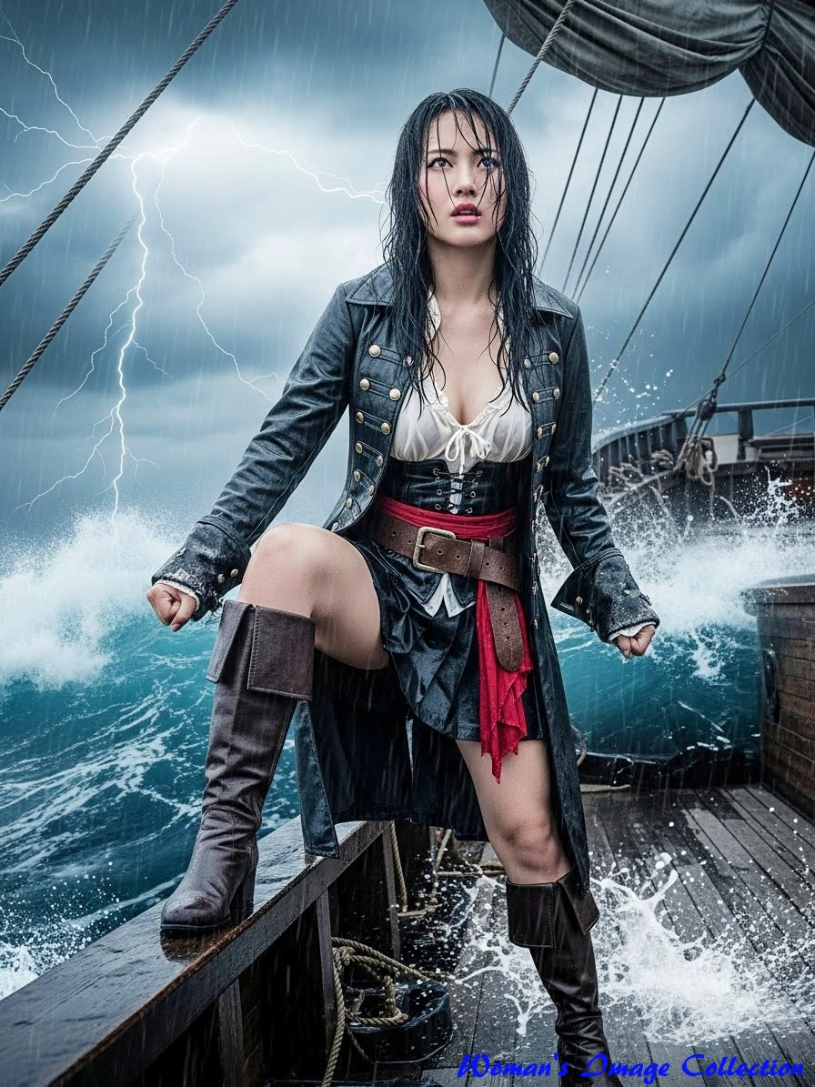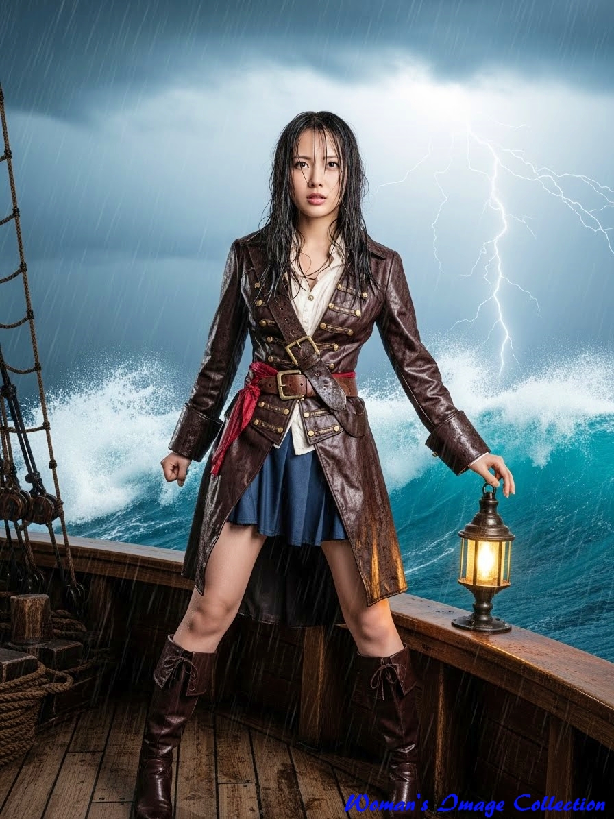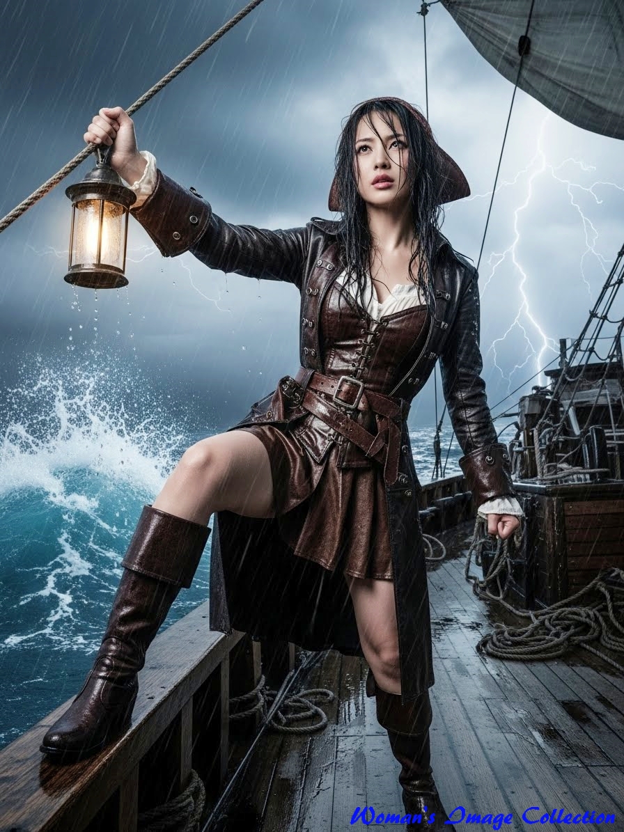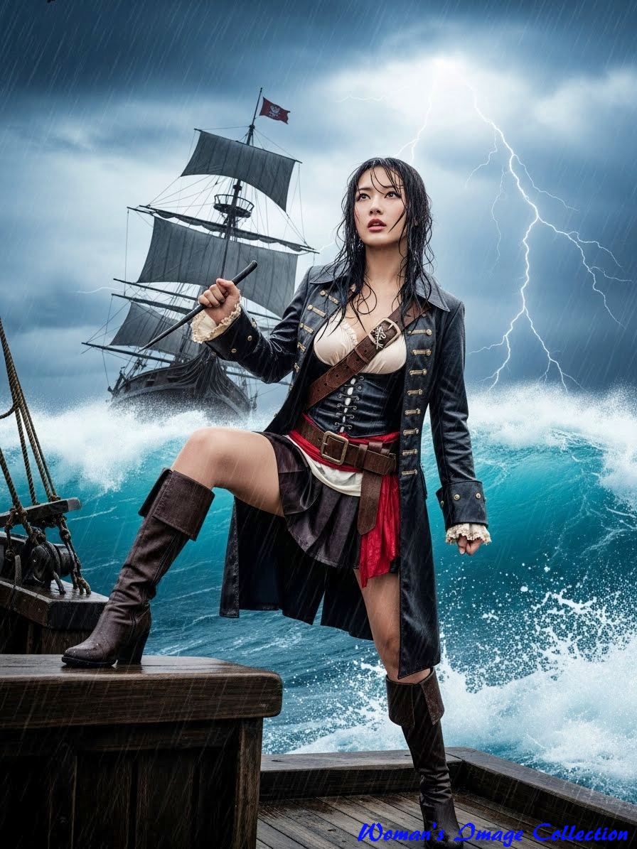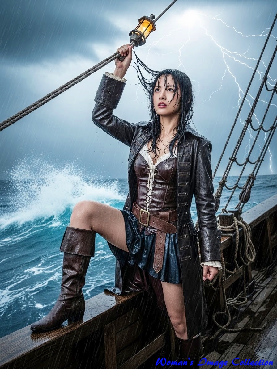 嵐の中で、指揮をとる女海賊のプロンプトを作ってみました。