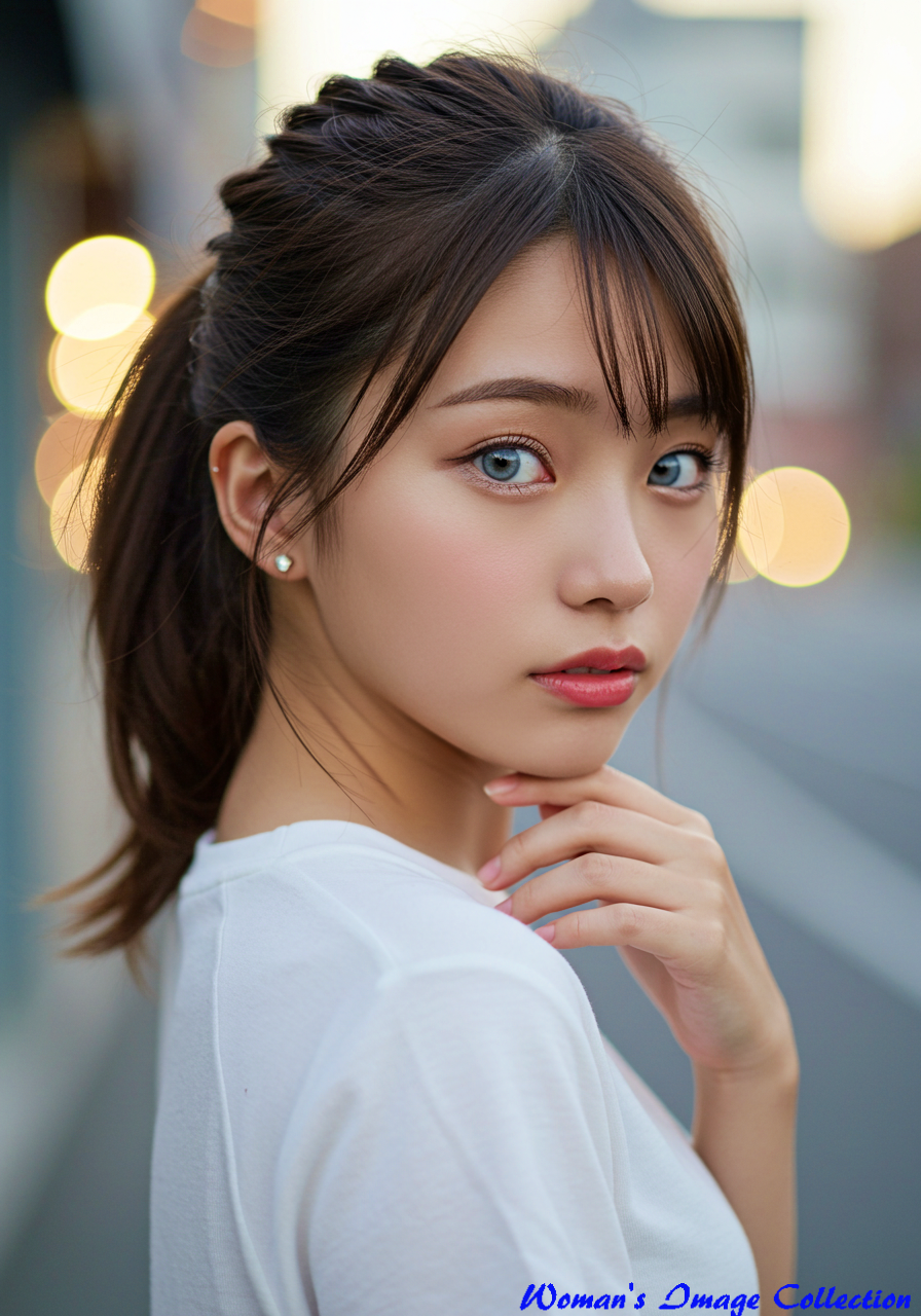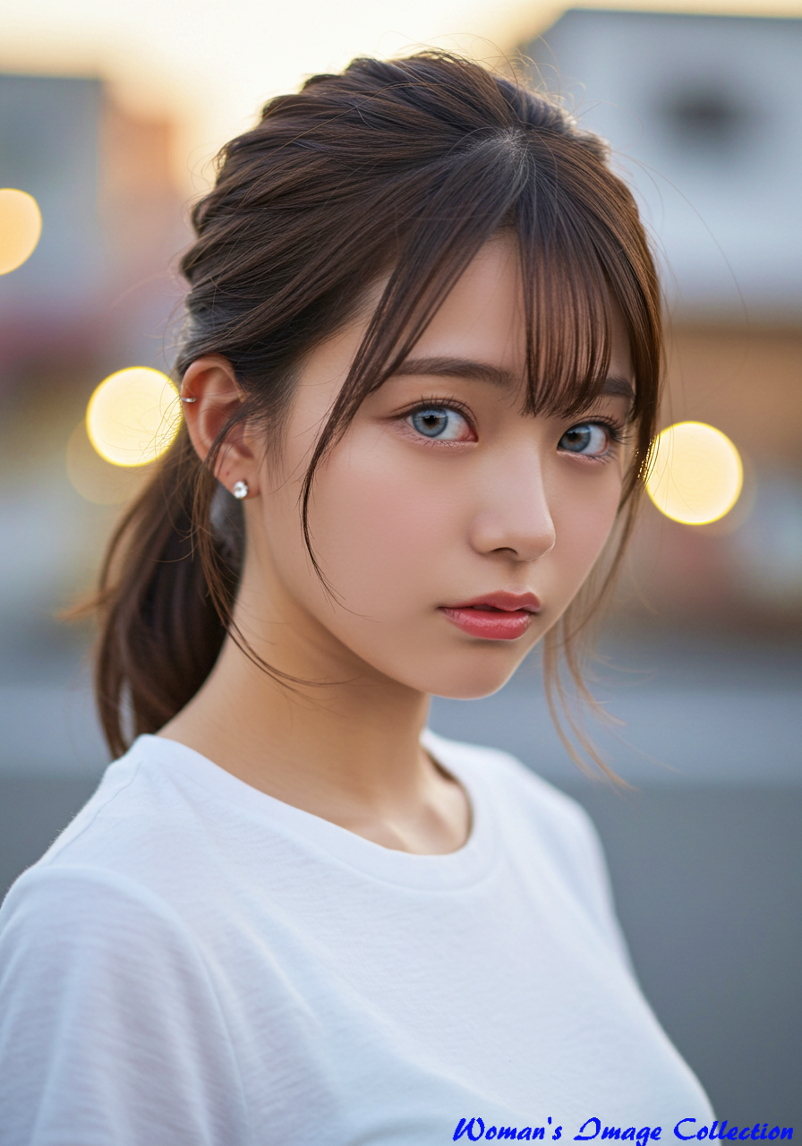 Subject: Type: Person Gender / Species: Female, Japanese Age / Condition: 10s to early 20s (young, youthful) Features: - fair skin, rosy lips, captivating gaze - large, expressive eyes with light greyish-blue irises - delicate features - soft, smooth skin texture Clothing / Equipment: A simple white t-shirt, delicate sparkling earring on the right ear Emotion / Pose: - a soft, gentle smile or a neutral, contemplative expression - with a straight back, pulling her chin down slightly and looking down a little Hair: - medium-brown hair - pulled back into a high ponytail - loose wisps and strands framing her face and neck - a few strands gently blown by a breeze - natural hair texture Setting: Location Type: Urban or natural outdoor setting Specific Location: N/A Background Details: - soft, blurred background (bokeh) - warm-toned circular light reflections, suggesting golden hour - shallow depth of field Style: Art Style: Photorealistic, cinematic portrait photography Artist / Photographer: N/A Genre: Portrait Medium: Digital photograph Lighting & Atmosphere: Lighting Type: Soft, natural light (golden hour) Time of Day: Golden hour (sunset or sunrise) Color Palette: Warm tones, soft pastels, natural skin tones Mood / Atmosphere: Soft, dreamy, intimate, and gentle Composition & Angle: Shot Type: Medium close-up Angle: Eye-level or slightly low angle to emphasize her expression Perspective: N/A Framing: Rule of thirds Quality & Details: Resolution: Ultra high resolution, 8k Realism: Hyper-realistic Modifiers: - masterpiece, top quality, cinematic, professional photo - best quality, hyperdetailed, incredibly detailed - charming, cute, lovely, adorable Negative Prompt: - low resolution, blurry, distorted, mutated hands and fingers - ugly, bad anatomy, deformed, extra limbs, bad eyes - plastic, cartoon, unnatural, disfigured, malformed