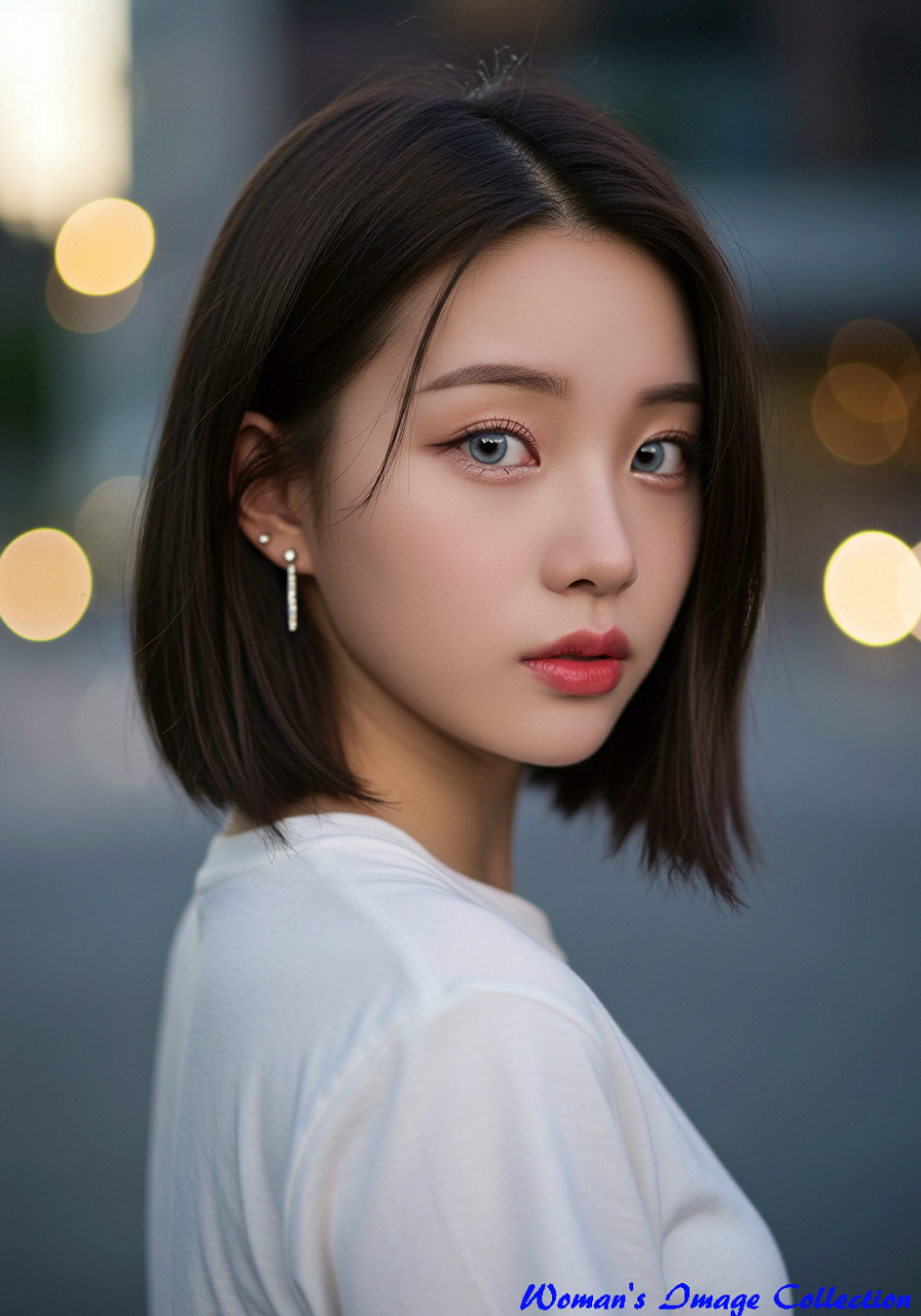 Subject: Type: Person Gender / Species: Female Age / Condition: 10s to early 20s (young, youthful) Features: - fair skin, rosy lips, captivating gaze - large, expressive eyes with light greyish-blue irises - delicate features - soft, smooth skin texture Clothing / Equipment: A simple white t-shirt, delicate sparkling earring on the right ear Emotion / Pose: - a soft, gentle smile or a neutral, contemplative expression - looking directly over her shoulder at the viewer Setting: Location Type: Urban or natural outdoor setting Specific Location: N/A Background Details: - soft, blurred background (bokeh) - warm-toned circular light reflections, suggesting golden hour - shallow depth of field Style: Art Style: Photorealistic, cinematic portrait photography Artist / Photographer: N/A Genre: Portrait Medium: Digital photograph Lighting & Atmosphere: Lighting Type: Soft, natural light (golden hour) Time of Day: Golden hour (sunset or sunrise) Color Palette: Warm tones, soft pastels, natural skin tones Mood / Atmosphere: Soft, dreamy, intimate, and gentle Composition & Angle: Shot Type: Medium close-up Angle: Eye-level or slightly low angle to emphasize her expression Perspective: N/A Framing: Rule of thirds Quality & Details: Resolution: Ultra high resolution, 8k Realism: Hyper-realistic Modifiers: - masterpiece, top quality, cinematic, professional photo - best quality, hyperdetailed, incredibly detailed - charming, cute, lovely, adorable Negative Prompt: - low resolution, blurry, distorted, mutated hands and fingers - ugly, bad anatomy, deformed, extra limbs, bad eyes - plastic, cartoon, unnatural, disfigured, malformed