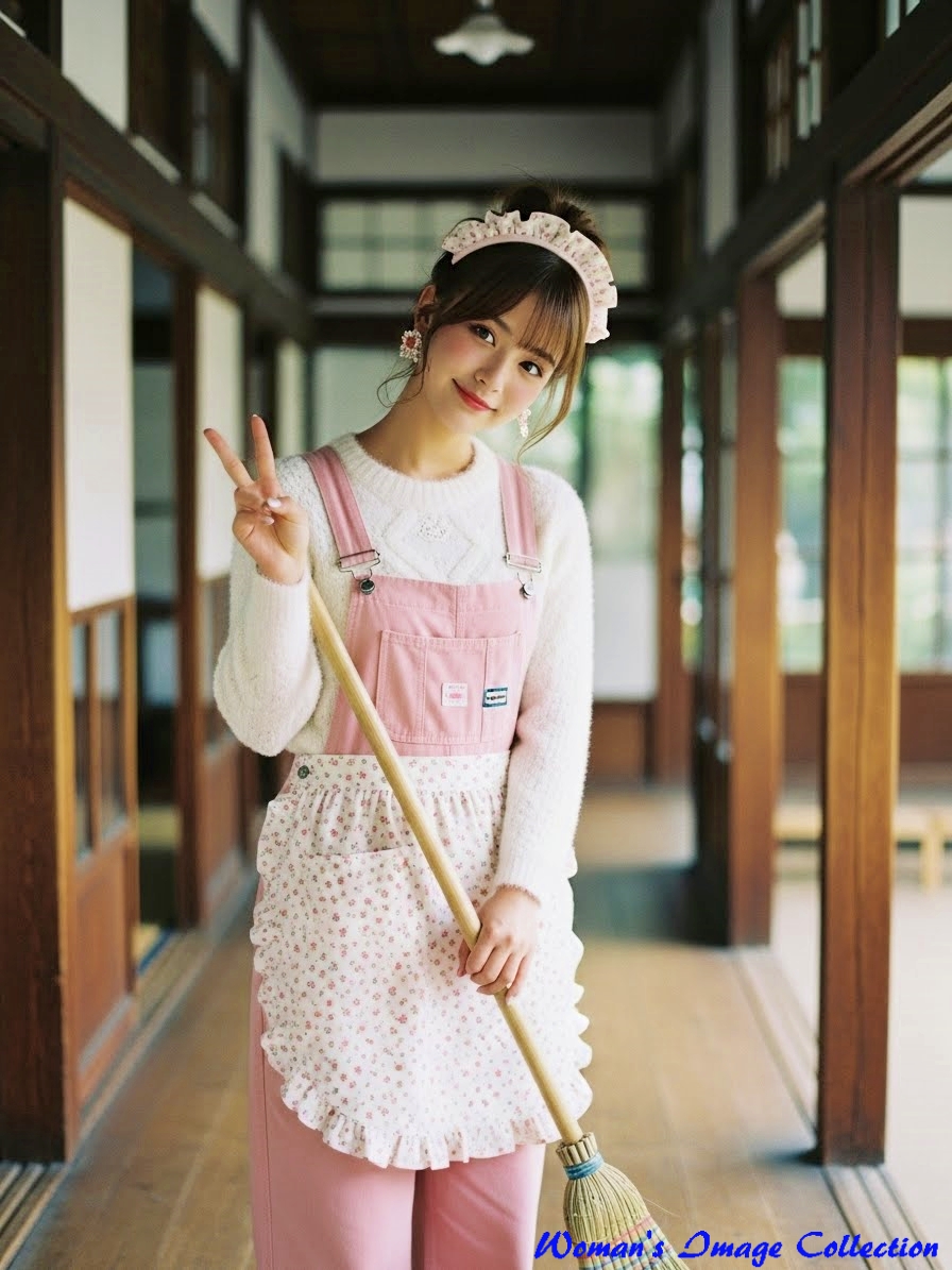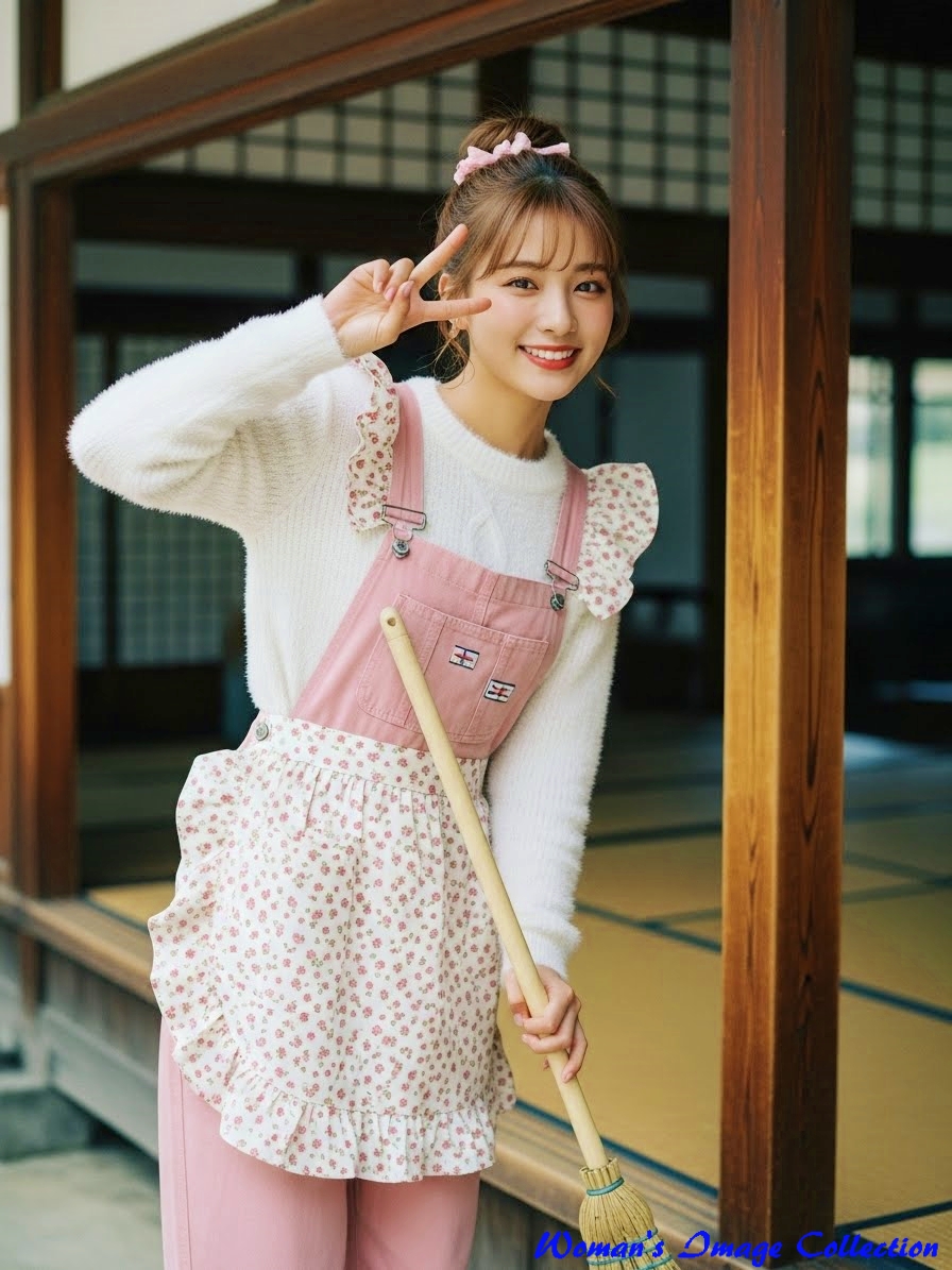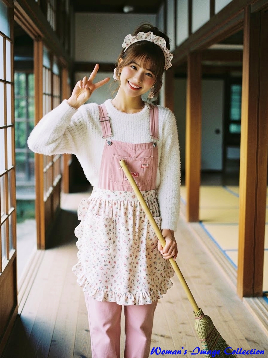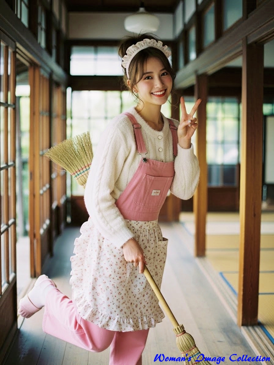 服装 (現代風のかわいい作業スタイル, パステルピンクのオーバーオール, 白いふわふわのニットトップス, フリルや小さな花柄が付いたエプロン),