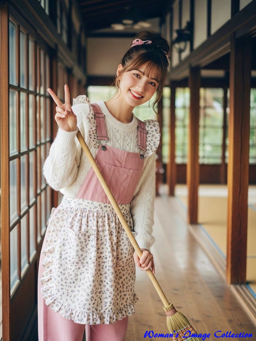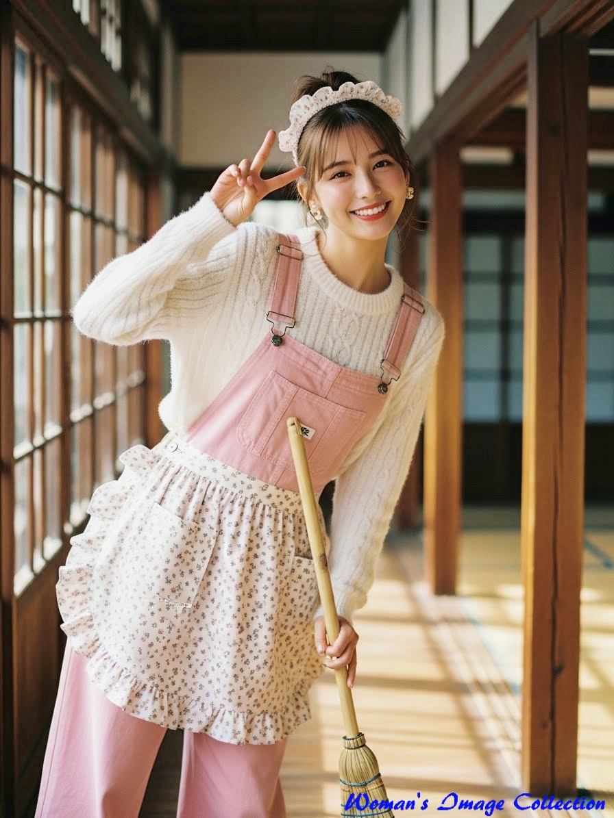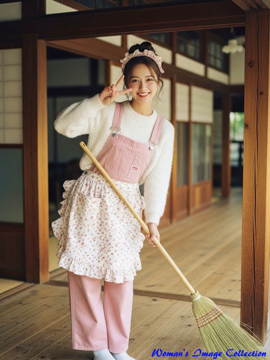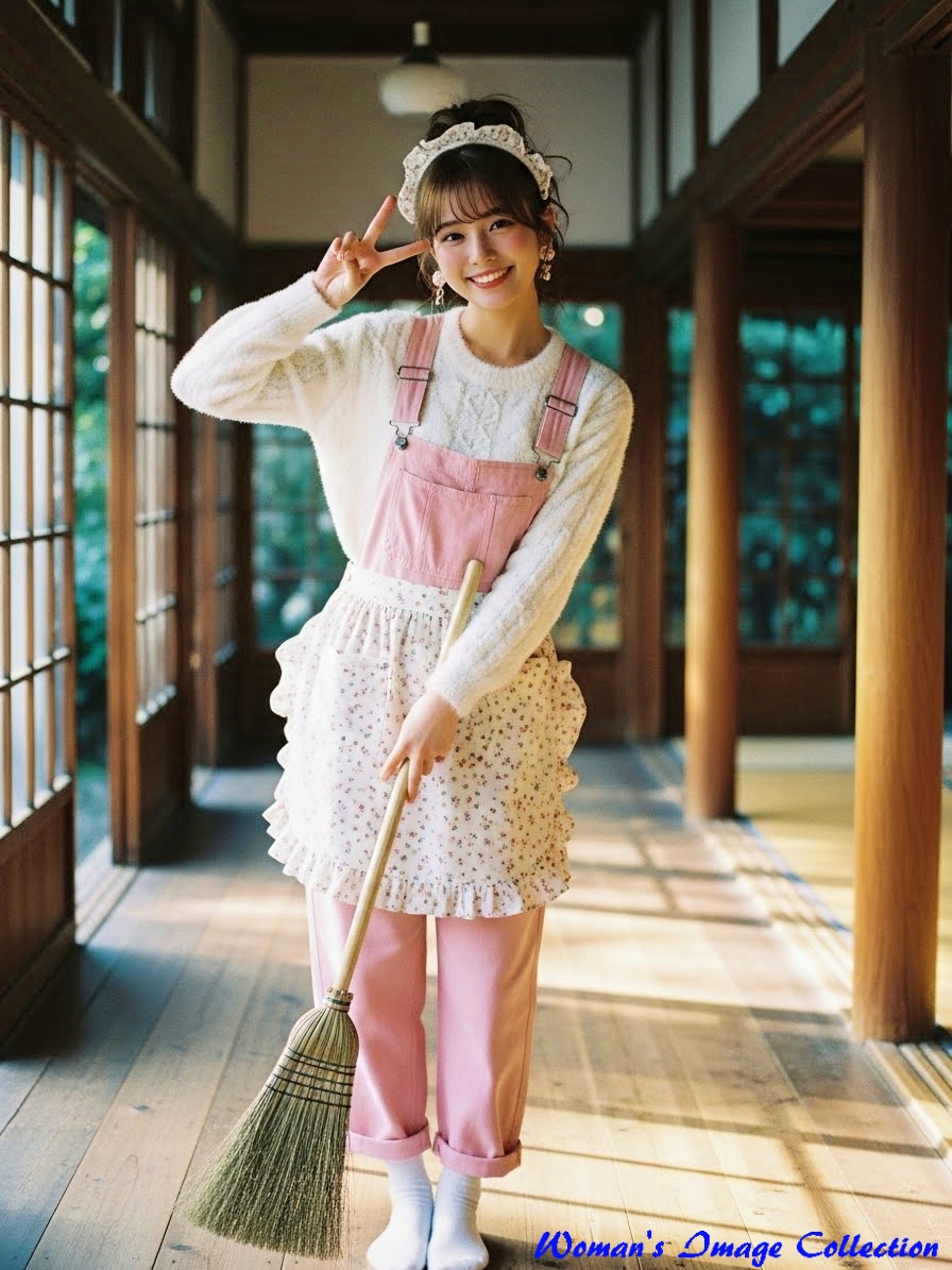 服装 (現代風のかわいい作業スタイル, パステルピンクのオーバーオール, 白いふわふわのニットトップス, フリルや小さな花柄が付いたエプロン),