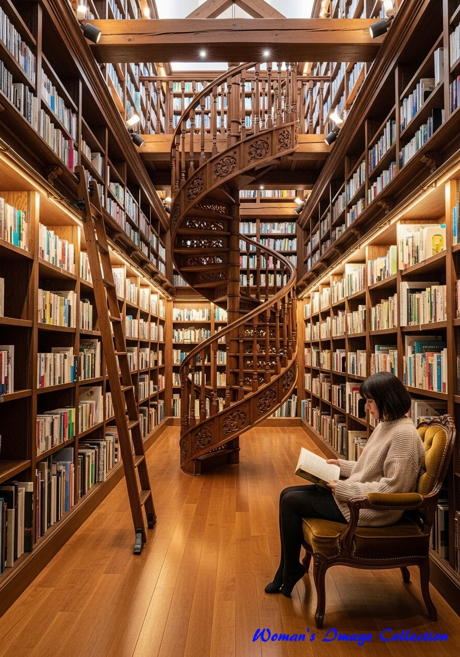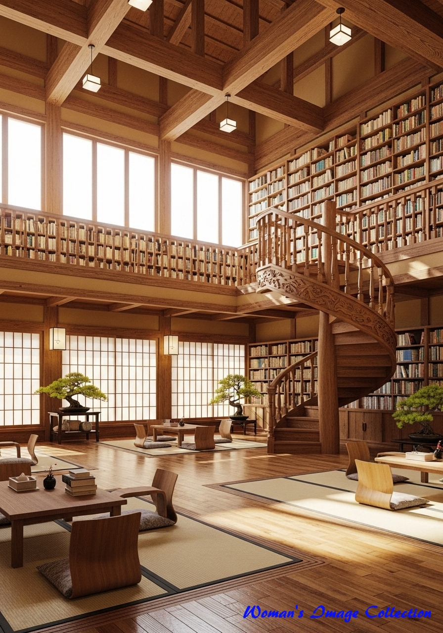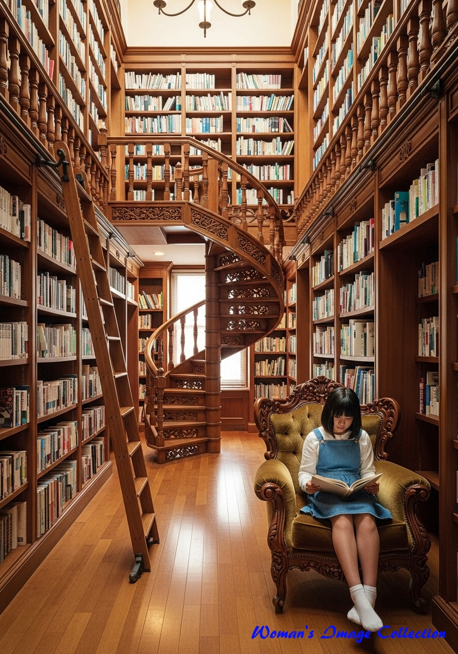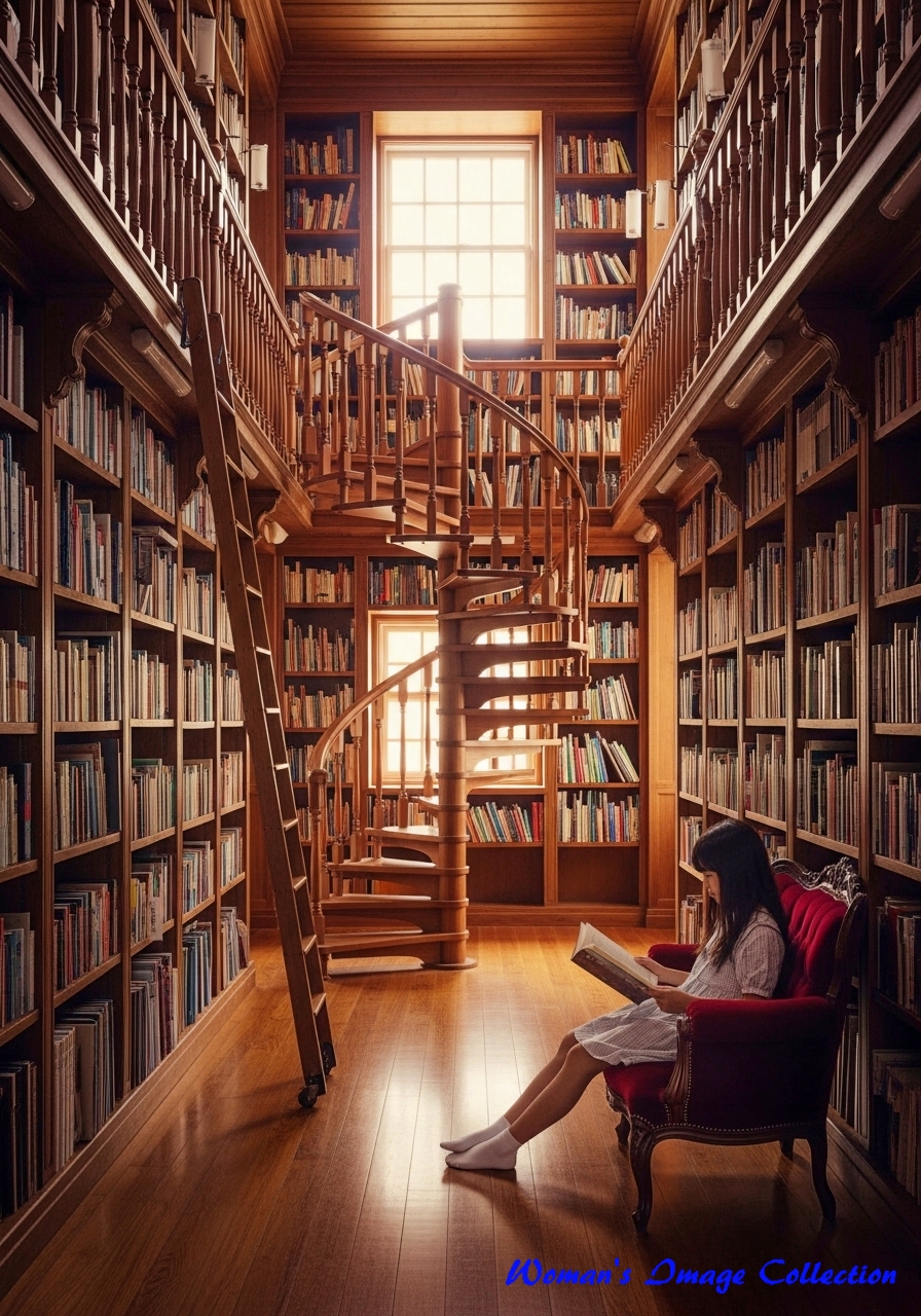 日本建築の書庫、長い廊下の両側に本箱が並ぶ、美しい木製のらせん階段、部屋全体に天井まで多く棚と本が並ぶ、床はきれいに磨かれた木材。木製の梯子がかけられている。本を読むための豪華な椅子が1つ置かれており、少女が横向きに座っている写真。