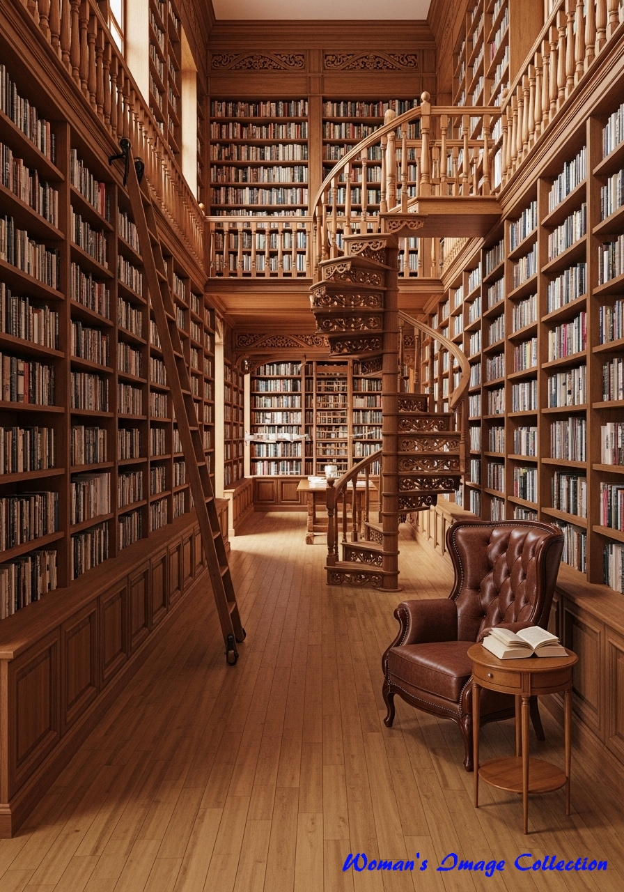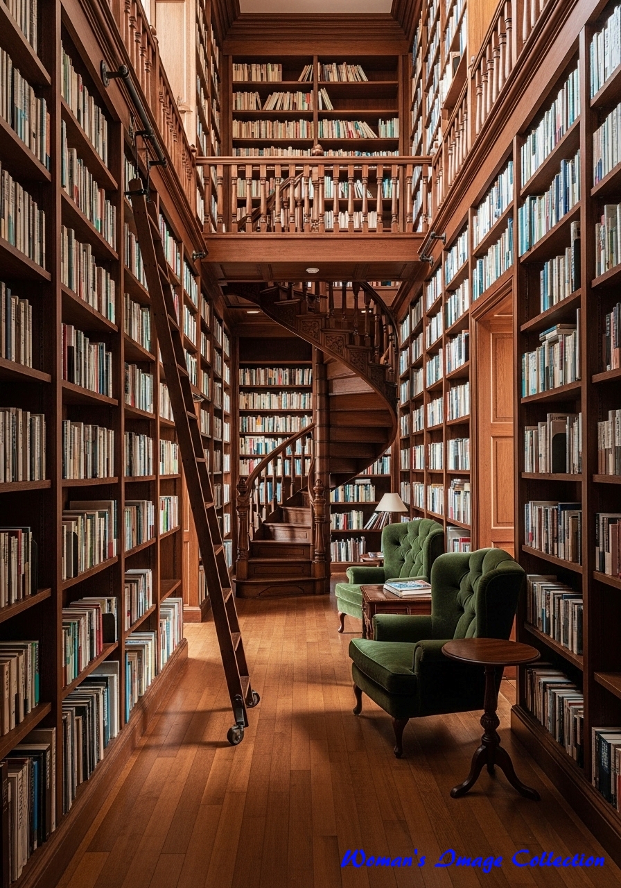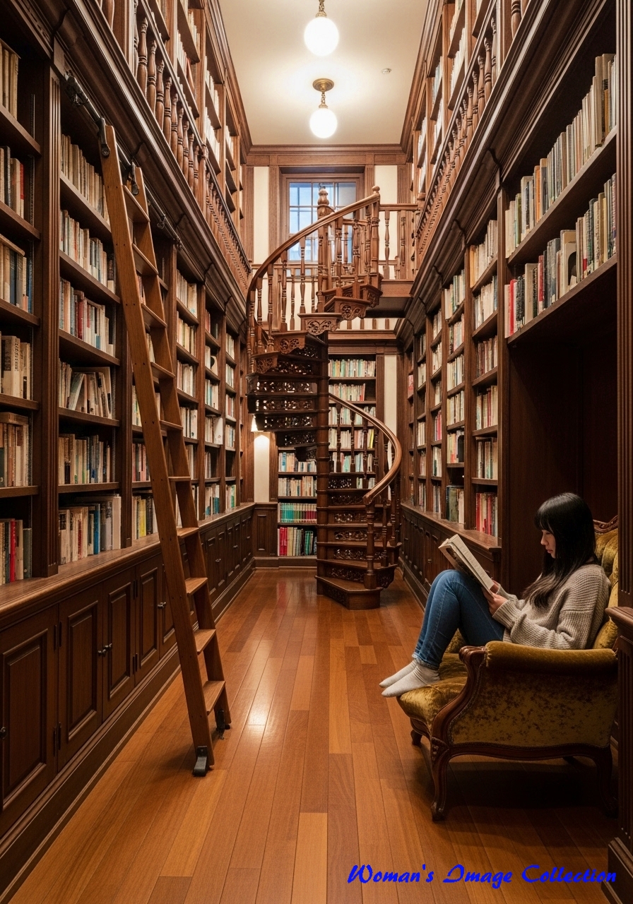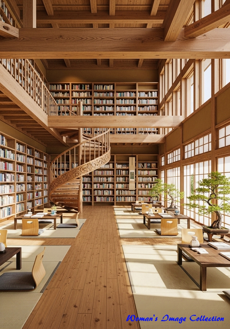 日本建築の書庫、長い廊下の両側に本箱が並ぶ、美しい木製のらせん階段、部屋全体に天井まで多く棚と本が並ぶ、床はきれいに磨かれた木材。木製の梯子がかけられている。本を読むための豪華な椅子が1つ置かれており、少女が横向きに座っている写真。