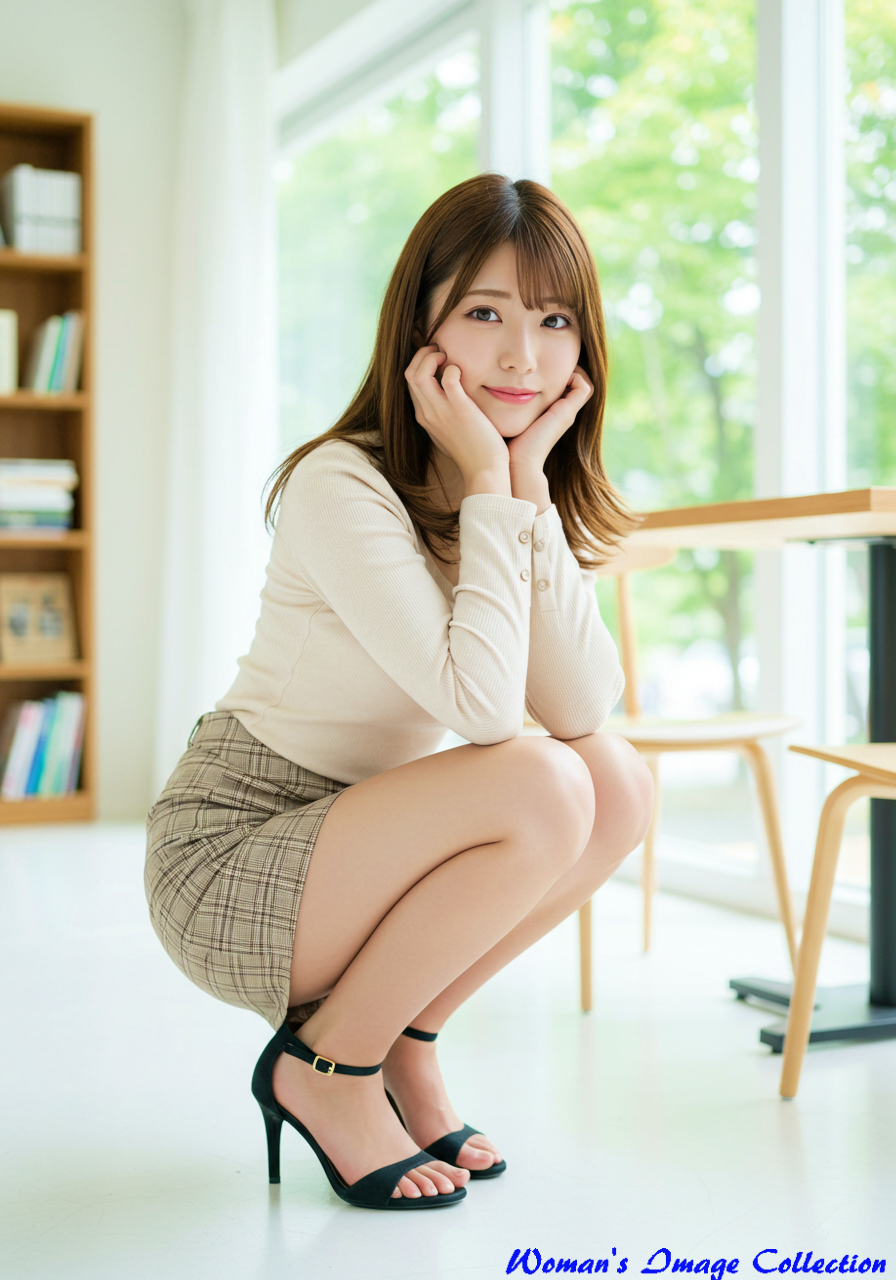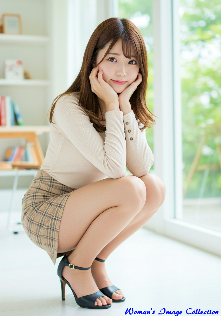 Emotion / Pose: 明るい室内の床にカメラに体を向けてしゃがみ込んでいる。両手を頬に当て、上目遣いでカメラを見つめる。可愛らしく、無邪気なポーズ。