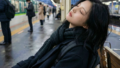 ホテルの自販機で飲み物を買うためにしゃがんでいる女性の横顔