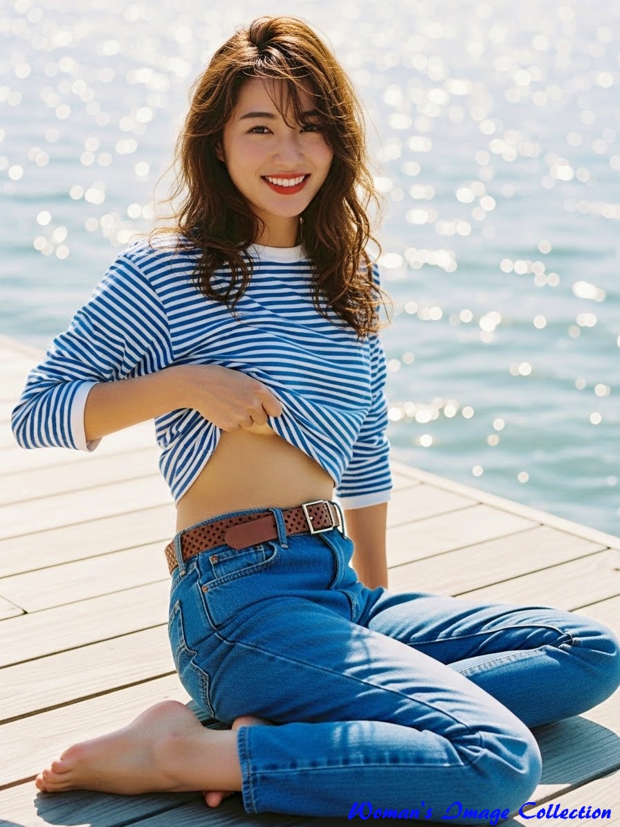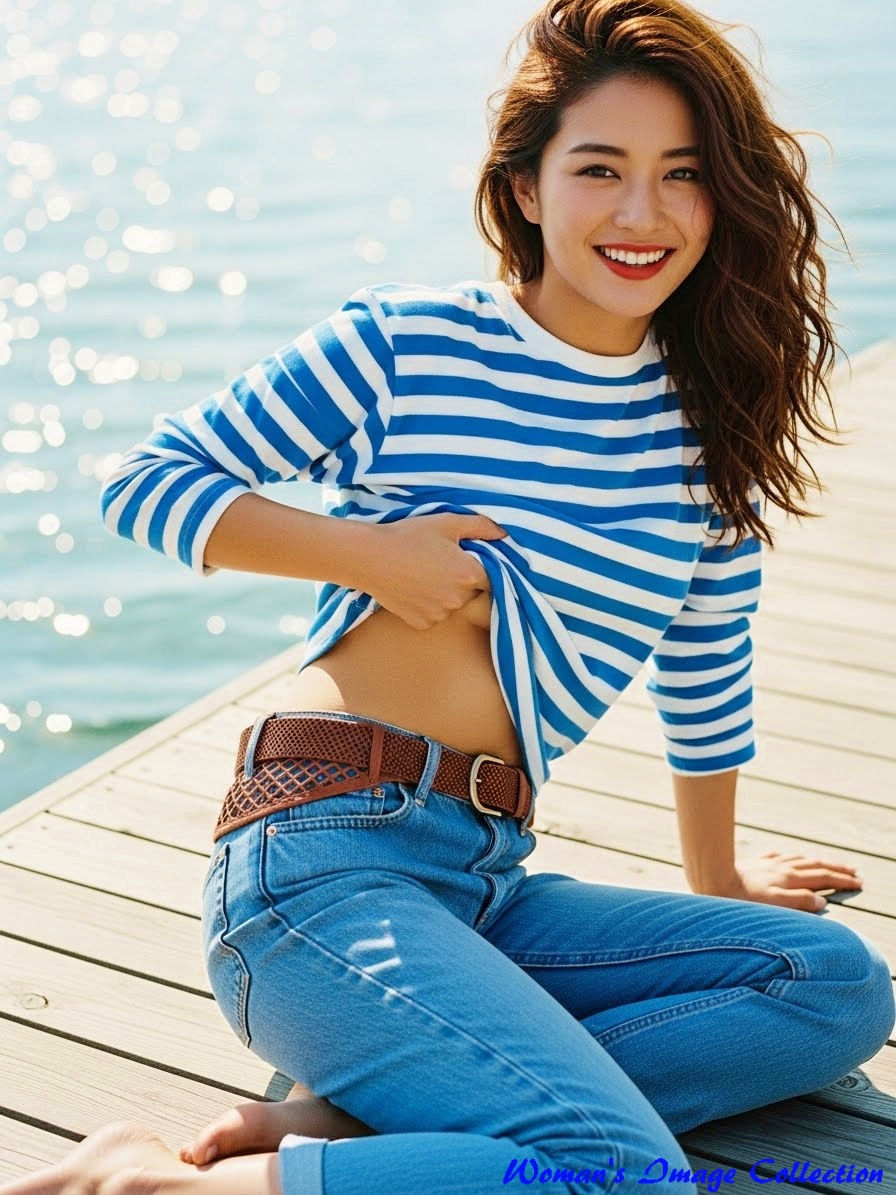 服装 (青と白の太いボーダー柄の長袖Tシャツ, ビンテージの青いデニムジーンズ, 茶色の革のメッシュベルト, 裸足),