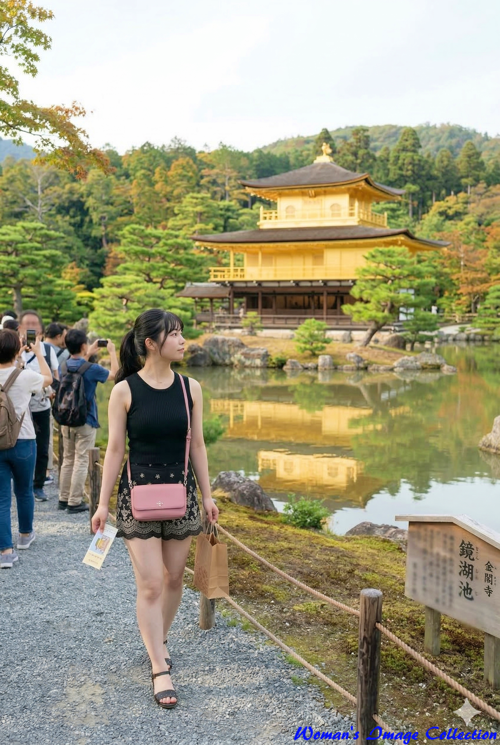 美しい黄金に輝く金閣寺(舎利殿)と、それを映し出す鏡湖池を背景に歩くポートレートです。周囲には写真を撮る観光客の姿もあり、京都を代表する観光地での臨場感あふれる一枚に仕上がっています。