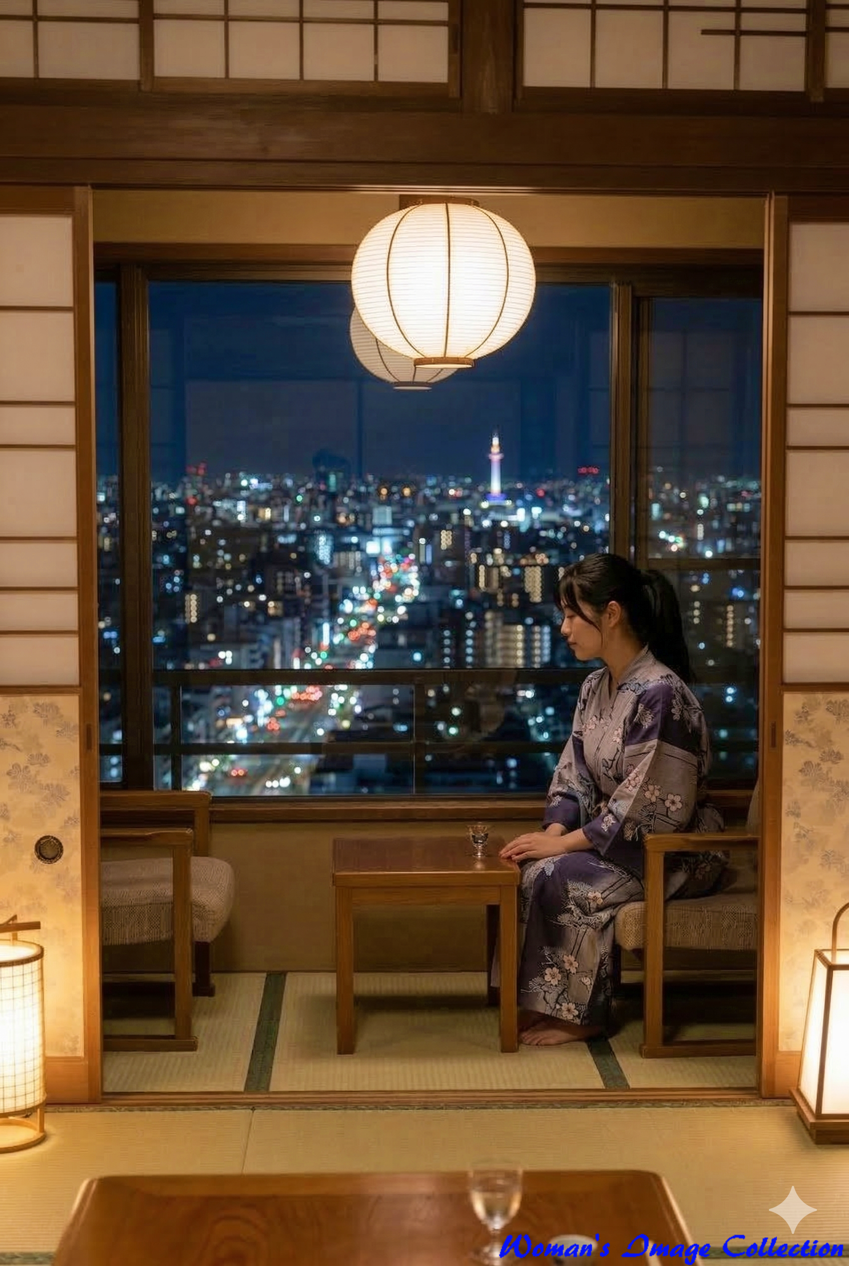 食事後、窓際にある椅子に座り、窓の外の遥か眼下に広がる美しい京都の夜景を眺めている。その眺めている遥か遠方にとても小さく京都タワーが見えている。