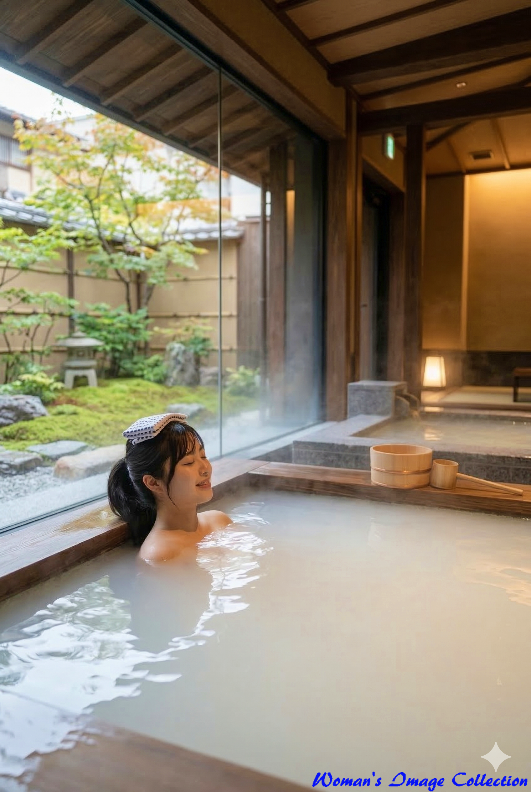 美しい日本庭園をガラス越しに望む客室の露天風呂で、肩までお湯に浸かりリラックスする姿です。頭にタオルを乗せ、目を閉じて温泉を満喫する至福の時間が表現されています。