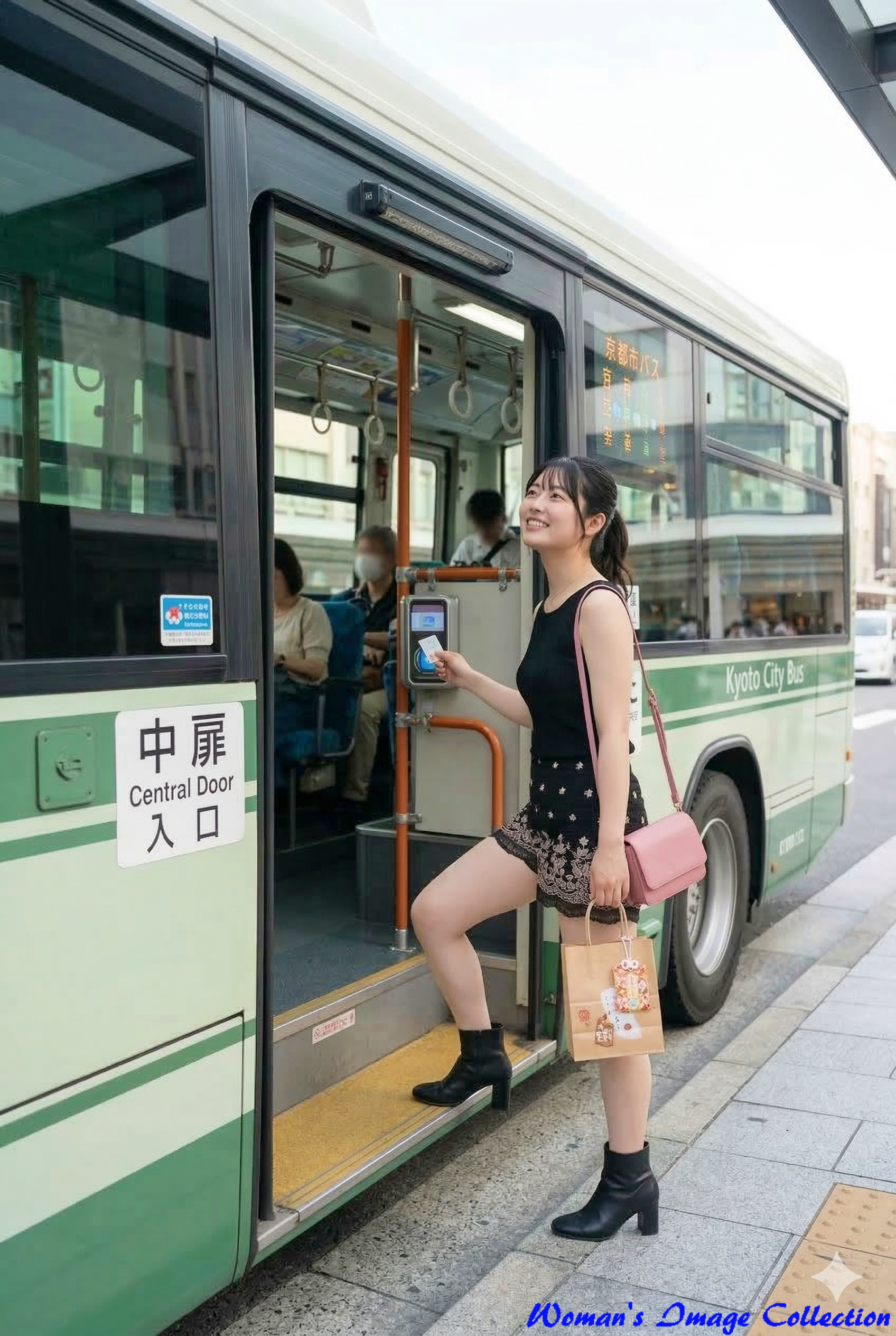 緑色の車体が特徴的な京都市バスの中扉から乗り込む瞬間を捉えています。軽やかな足取りでステップを上がる姿が、日常的な交通機関の利用シーンをリアルに表現しています。