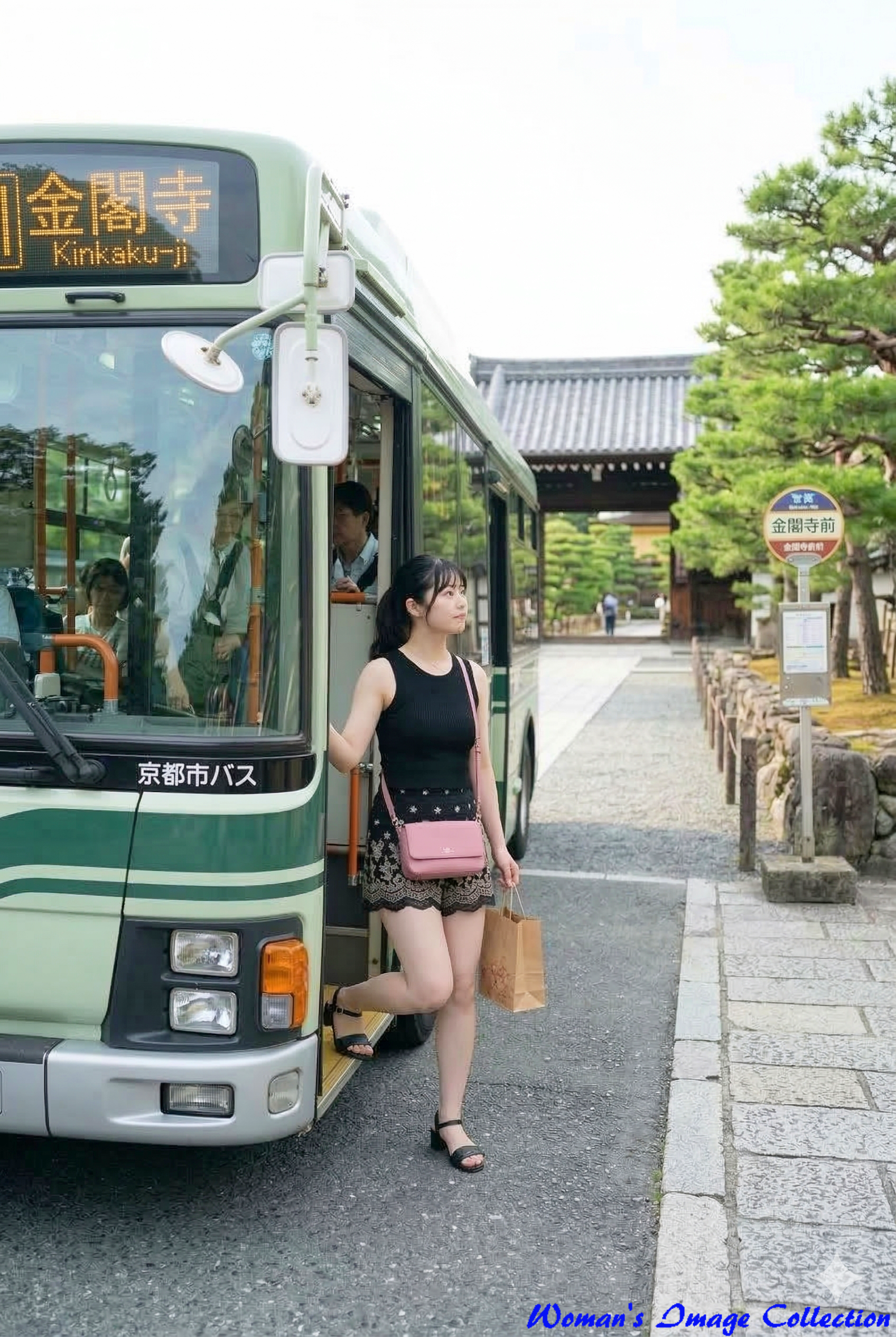 金閣寺前バス停に到着し、バスから降りるシーンです。背景には寺院の入り口や松の木が見え、これから始まる観光への期待感が感じられる構図となっています。