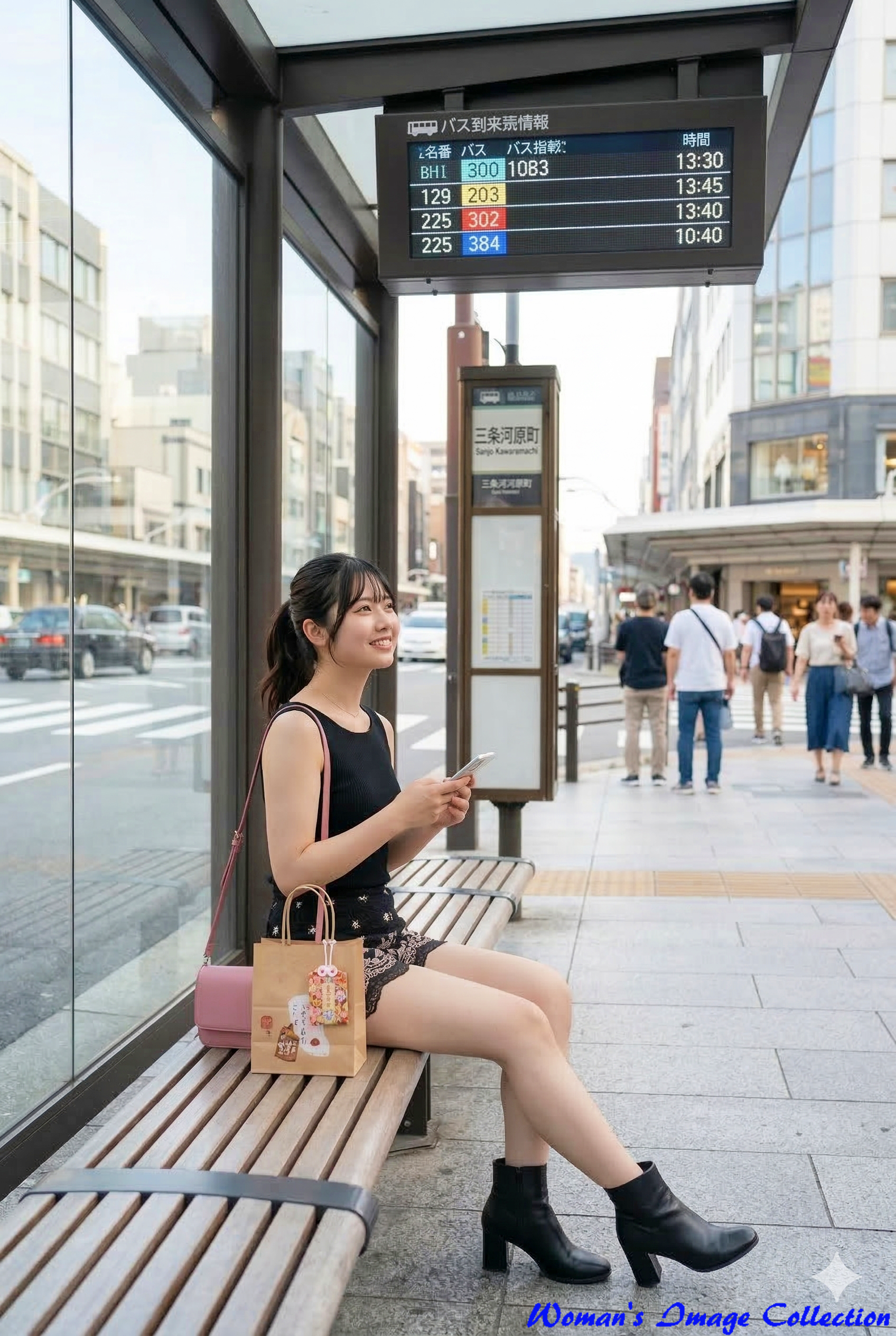ガラス張りの近代的なバス停のベンチに座り、スマートフォンを手にしながら笑顔を浮かべている様子です。横にはお土産の入った紙袋が置かれており、旅行中のリラックスした雰囲気が伝わってきます。三条河原町のバス停でバスを待っている。