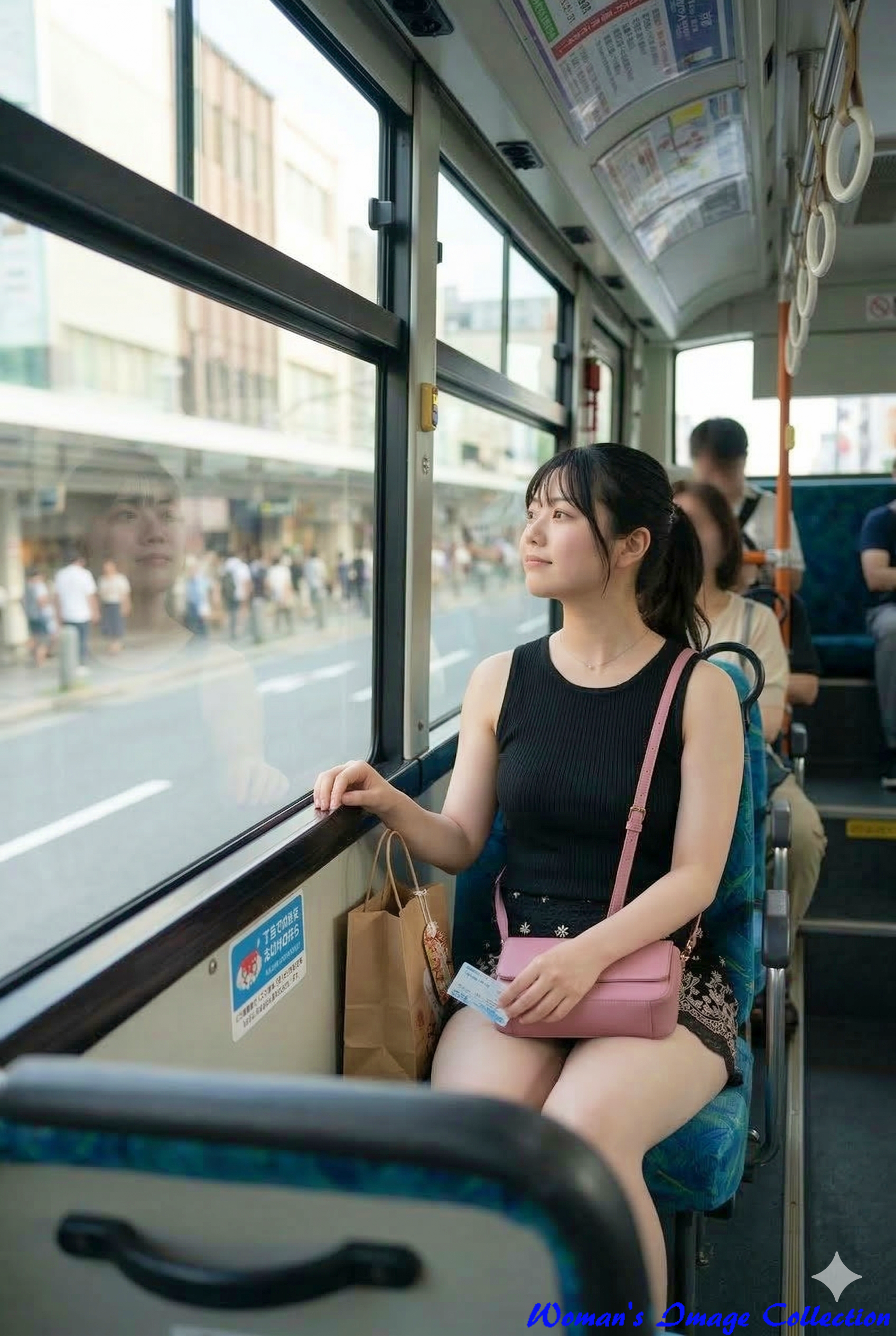 バスの座席に座り、窓の外の景色を静かに眺めている一枚です。窓ガラスには女性の顔が薄く反射しており、移動中の穏やかな時間が表現されています。