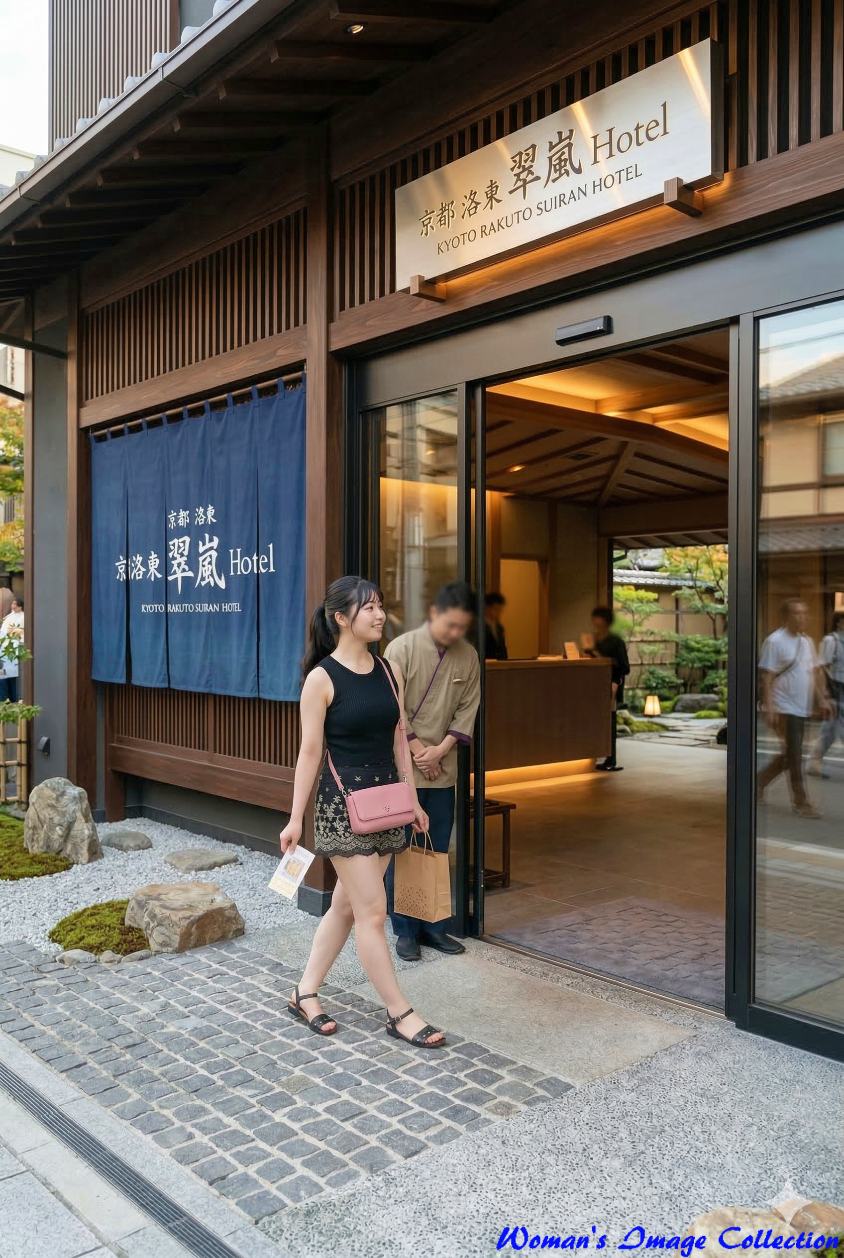 「京都洛東 翠嵐 Hotel」の暖簾が掲げられた趣のある和風ホテルのエントランス前を歩く様子です。和の風情と高級感が漂う空間に、女性の笑顔が華を添えています。