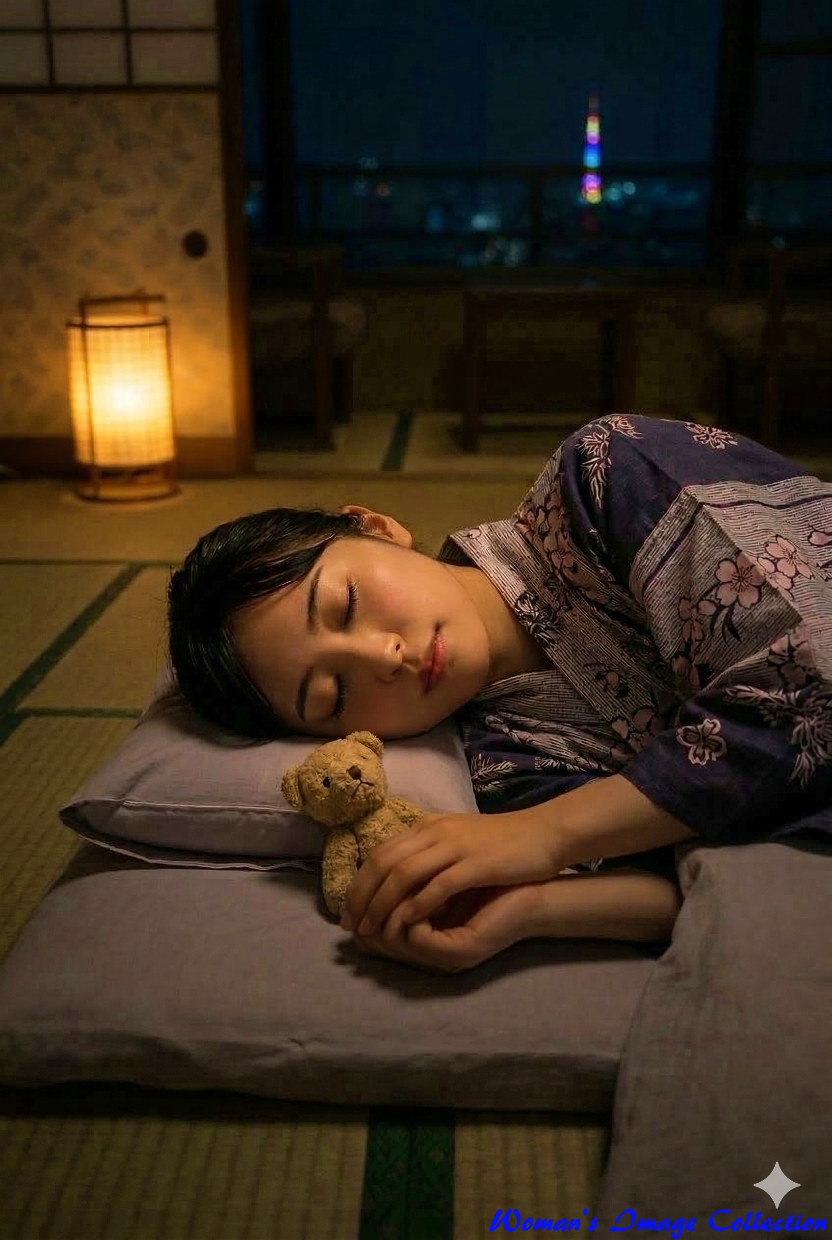 電気を消し布団に入って、静かにかわいく寝ている姿。照明は黄色い常夜灯のみ。