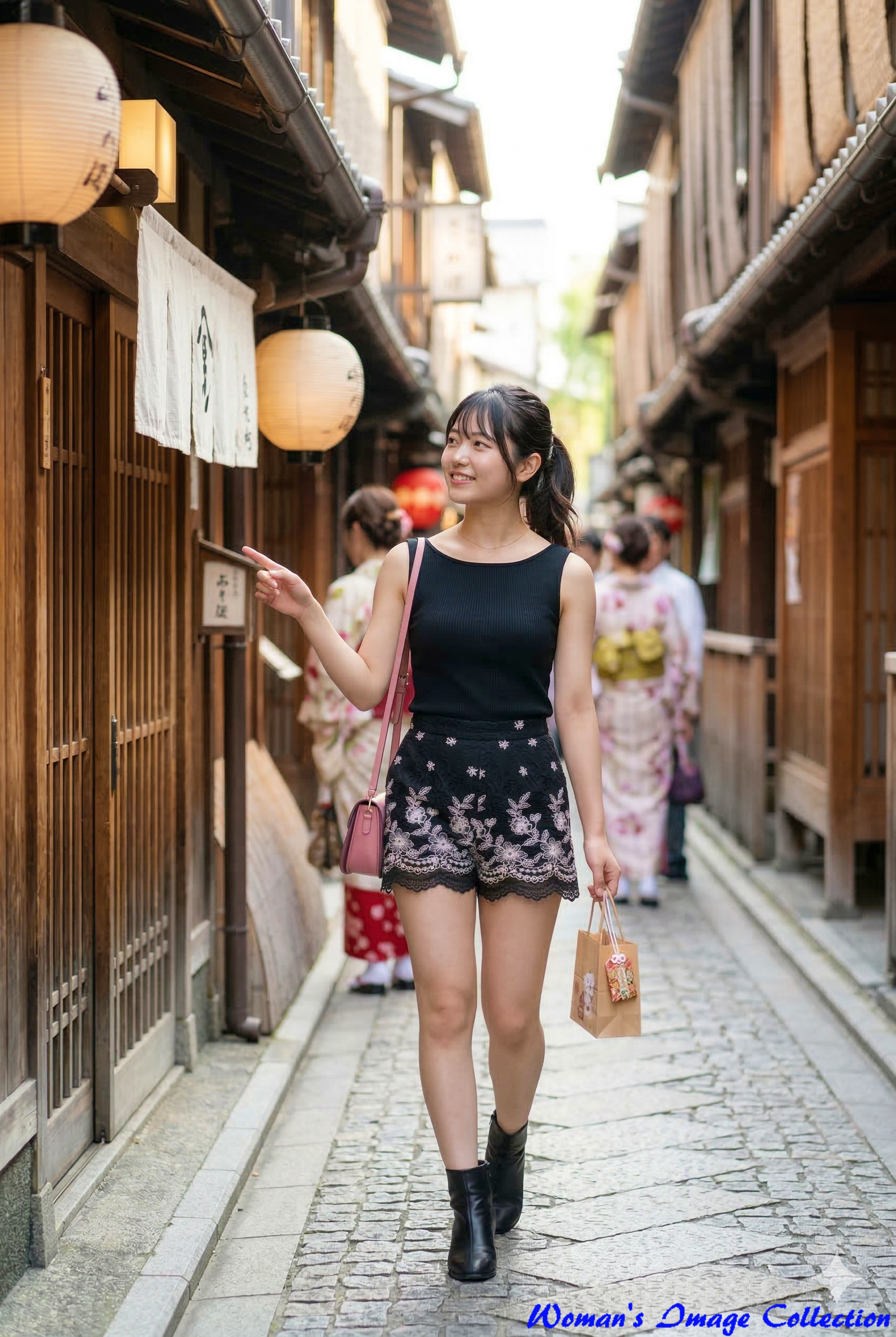 趣のある木造建築や提灯が並ぶ京都の路地を歩く姿です。背景には和服姿の人々も描かれており、歴史ある街並みに現代的なファッションが溶け込んでいます。何かを見つけて楽しそうに指差す仕草が魅力的です。
