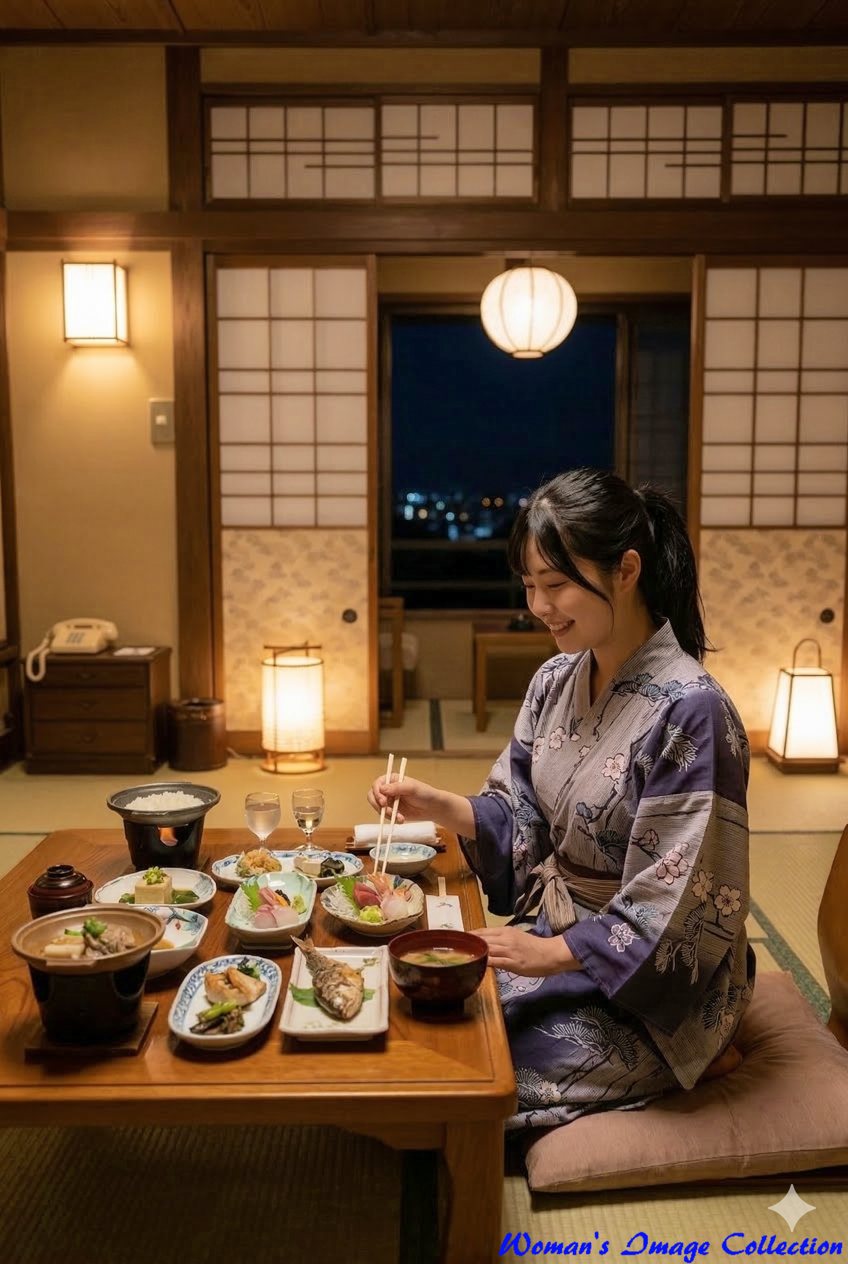 落ち着いた雰囲気の和室で、浴衣に身を包み豪華な夕食を楽しむシーンです。テーブルにはお造りや焼き魚など色とりどりの和食が並べられており、箸を持って微笑む姿から旅行の充実感が伝わります。部屋でホテルの用意したホテルの浴衣に着替えて、部屋で食事をしている。