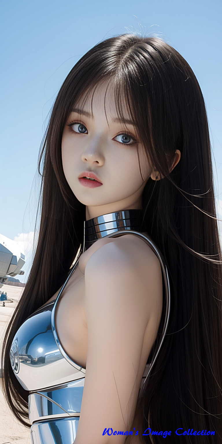 長くストレートに流れるダークヘアが、シルバーの輝きと対照的に映え、まるで彫刻のような美しさを演出しています。また、首元のチョーカー風のシルバーアクセサリーが全体の統一感を強調し、未来的なムードをさらに引き立てています。彼女の鋭くも美しい目線は、強い意志と魅力を感じさせ、見ている人を画像の世界へと引き込むかのようです。