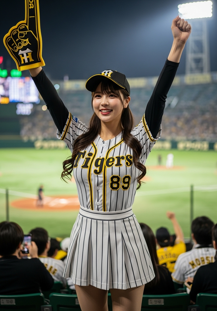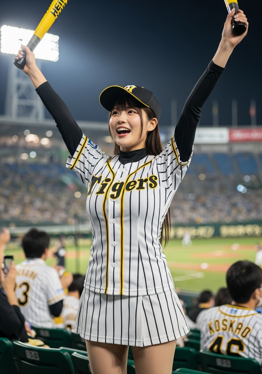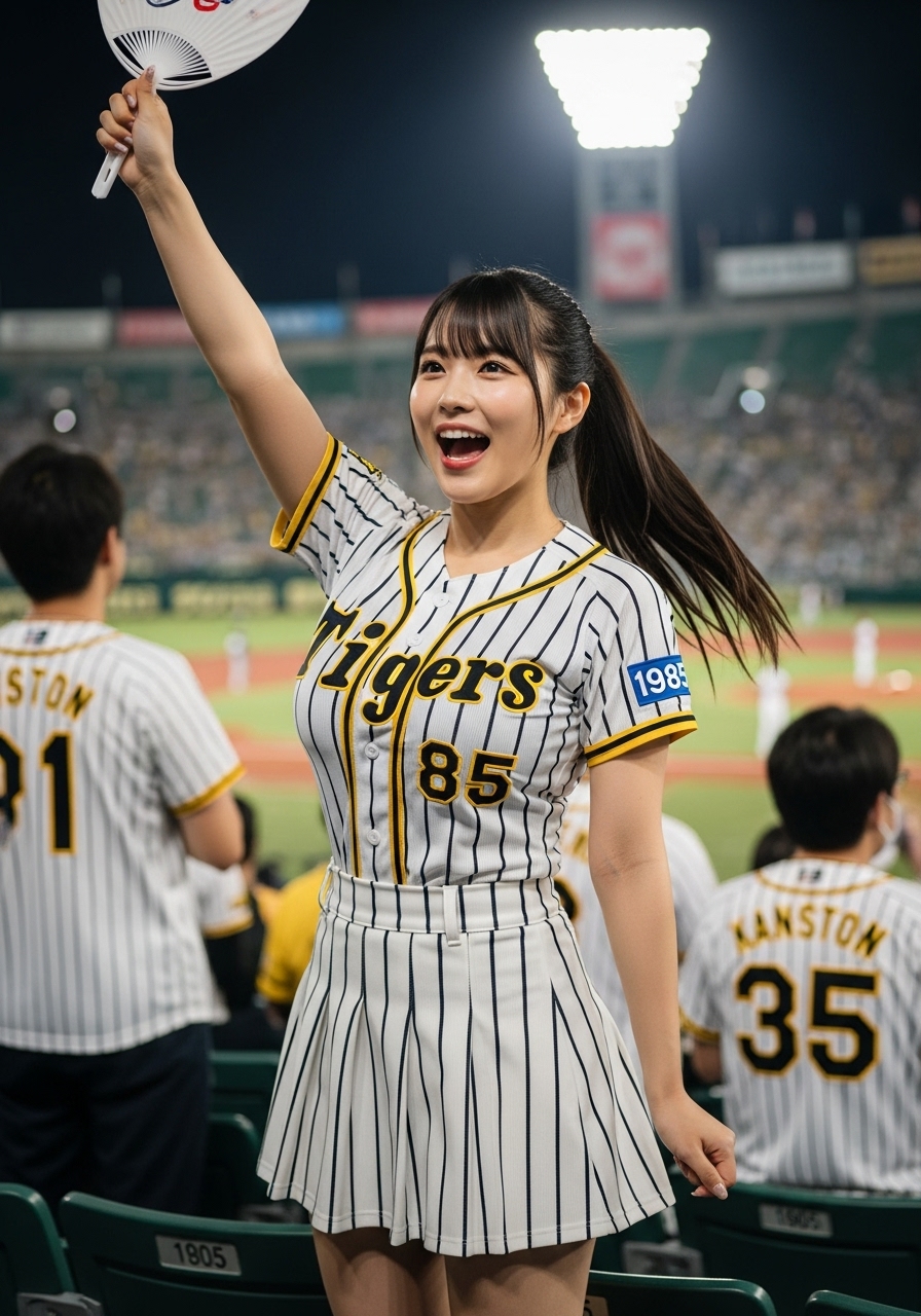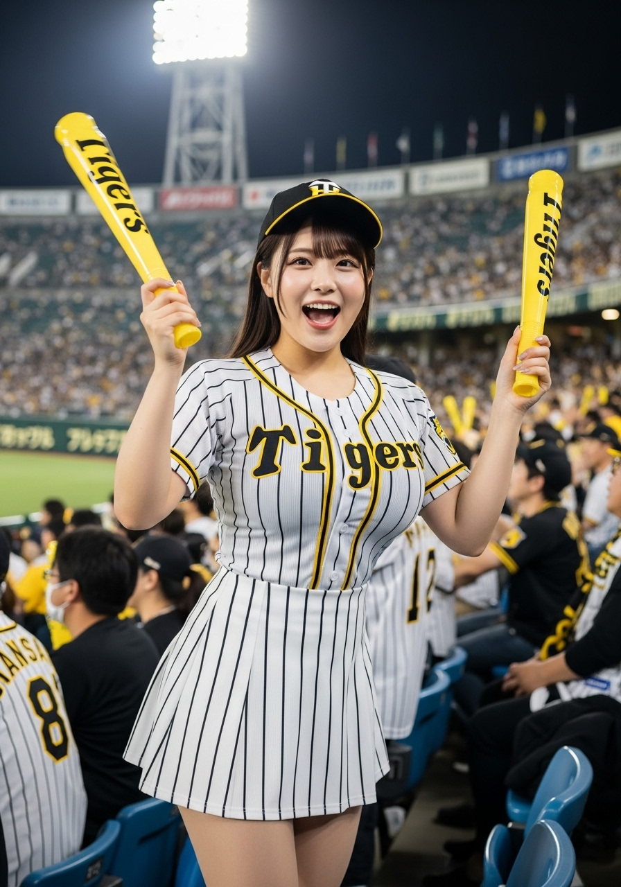 甲子園球場でのナイター試合。アルプススタンドで応援している女性の画像を作ろうと思って作成したプロンプトです。