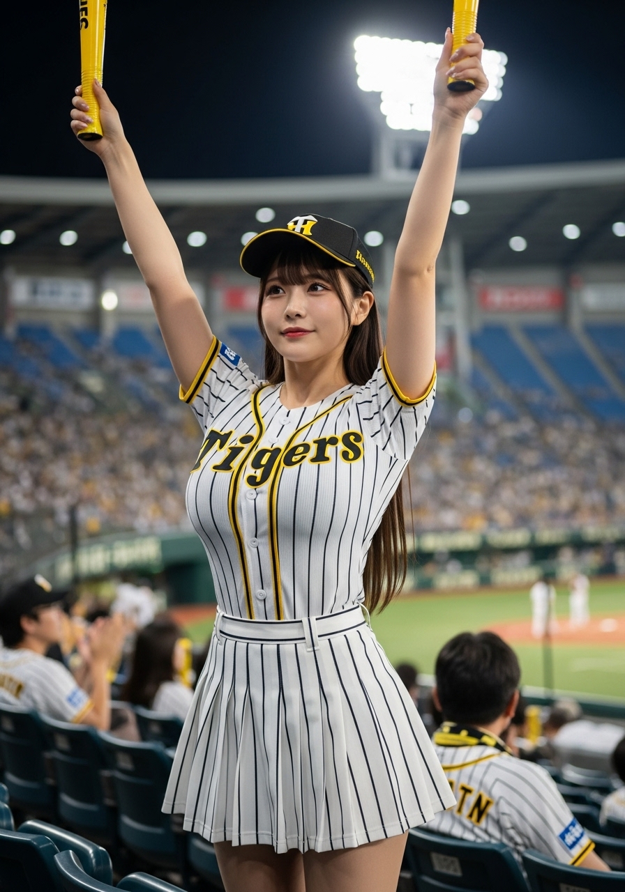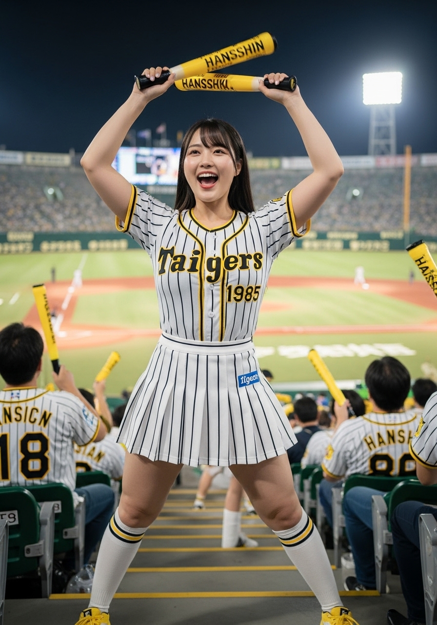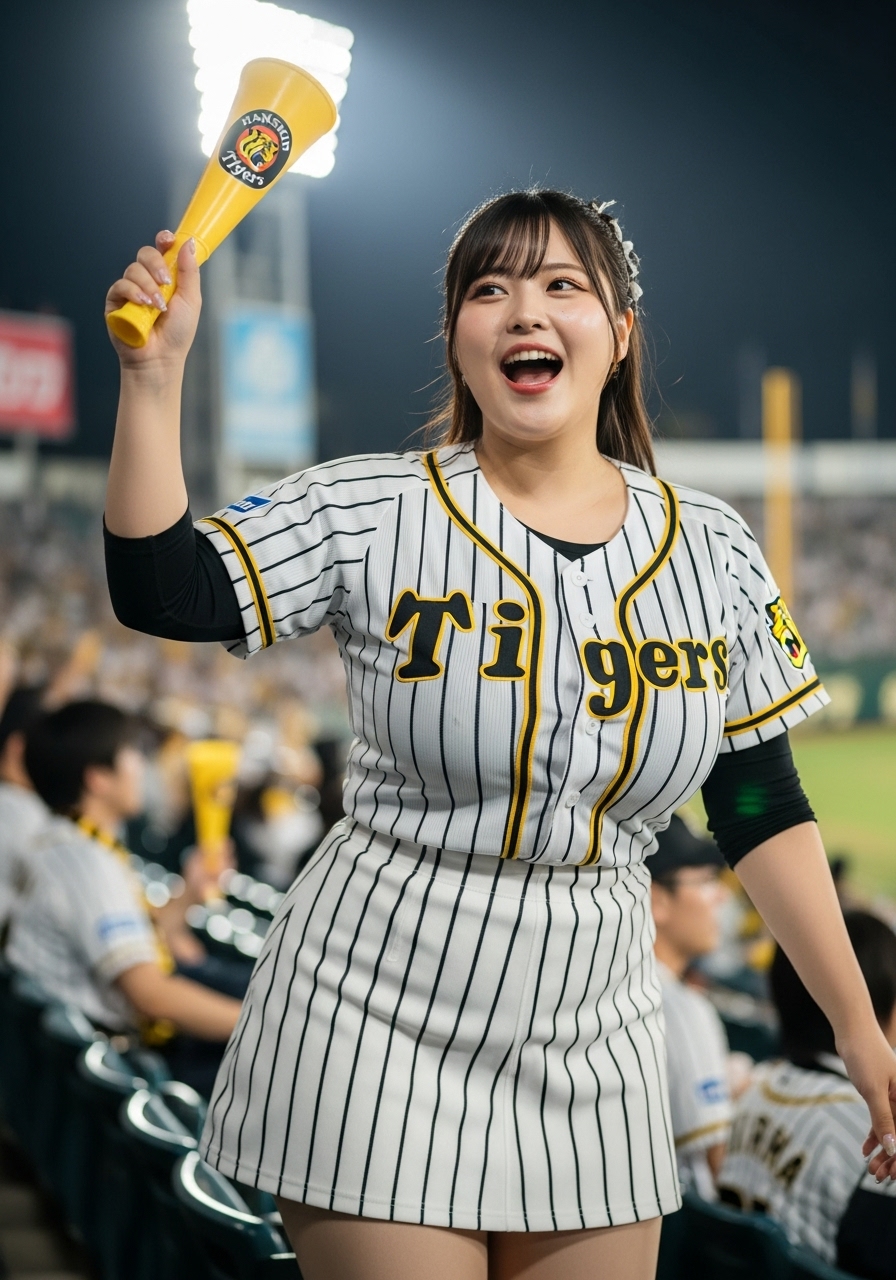 ナイター。豊かな胸元を強調するデザインの阪神タイガースの白の縦縞のユニホームと白の縦縞のミニスカートを着た豊満でグラマラスな体型の若い日本人女性が甲子園球場のスタンドでチアガールをしている