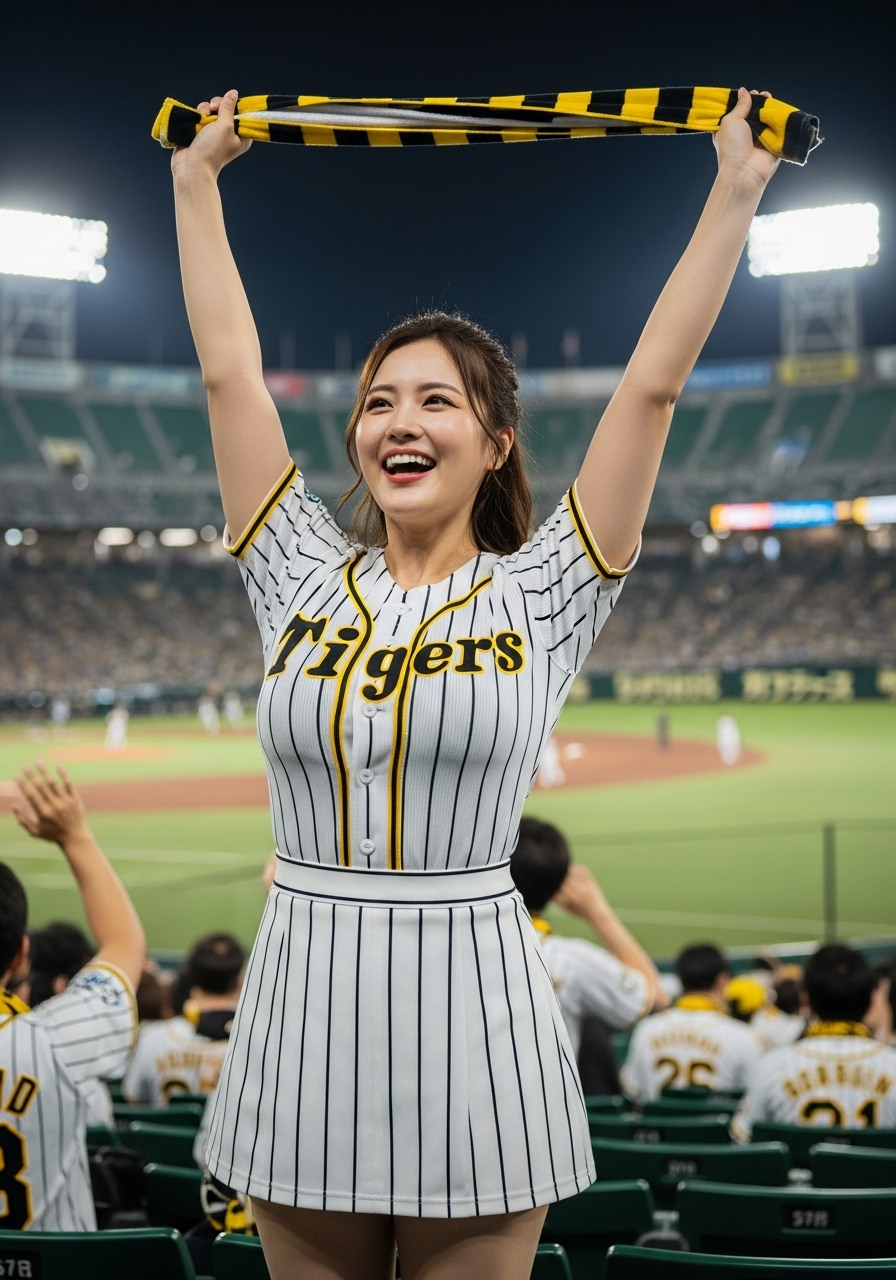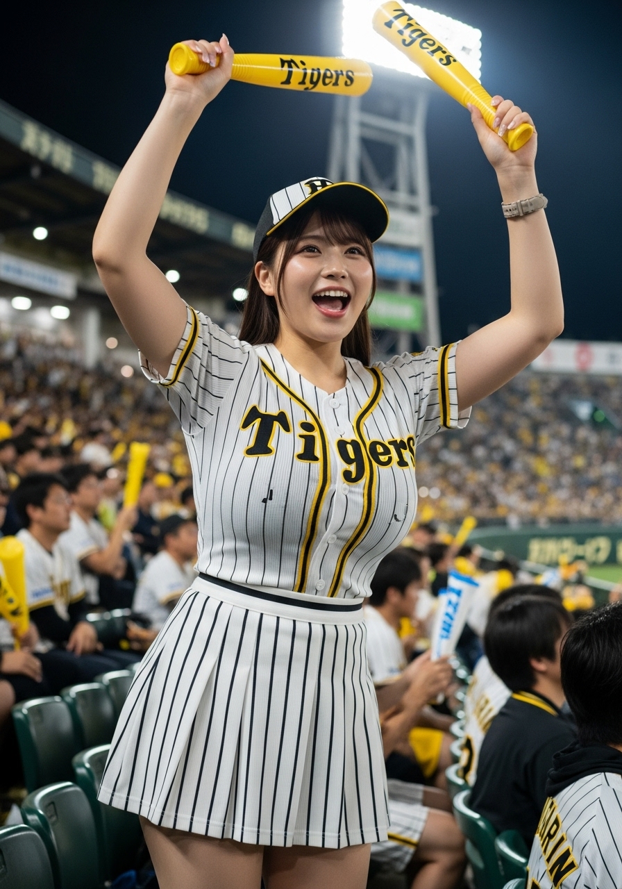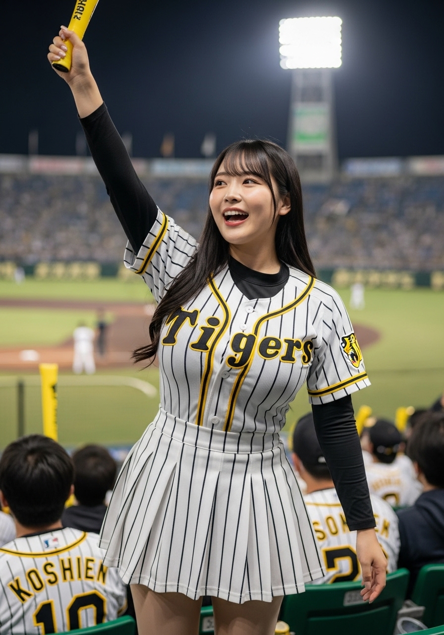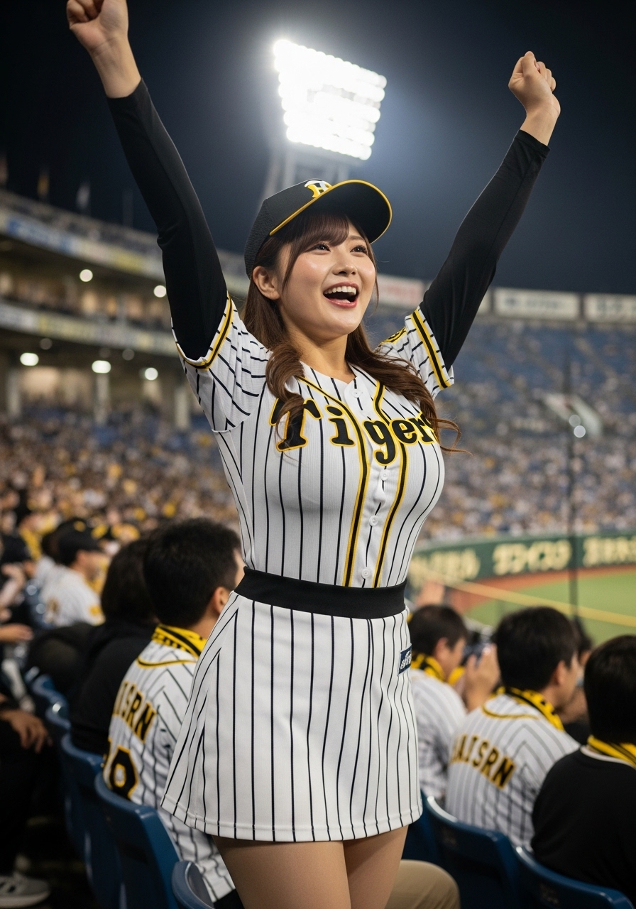 ナイター。豊かな胸元を強調するデザインの阪神タイガースの白の縦縞のユニホームと白の縦縞のミニスカートを着た豊満でグラマラスな体型の若い日本人女性が甲子園球場のスタンドでチアガールをしている