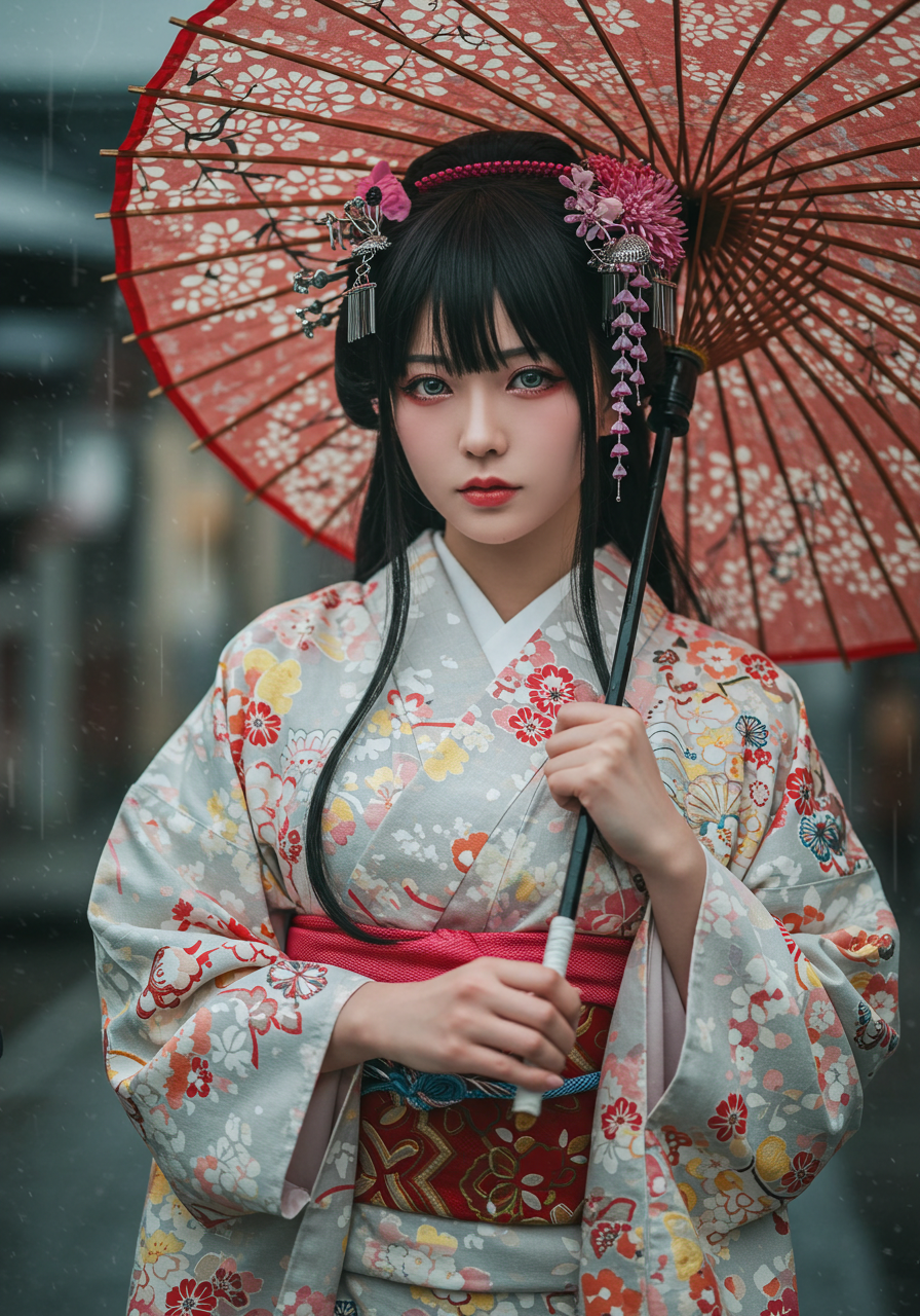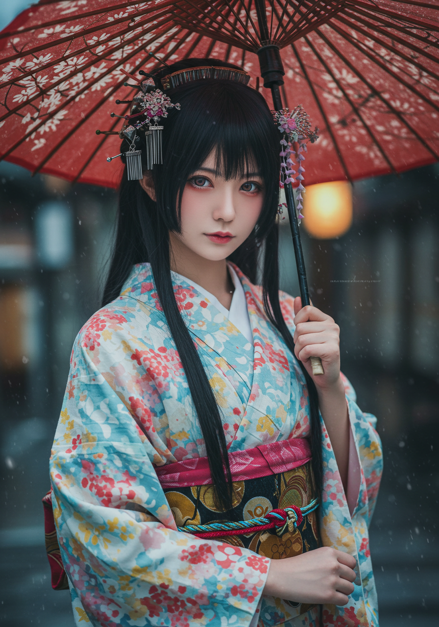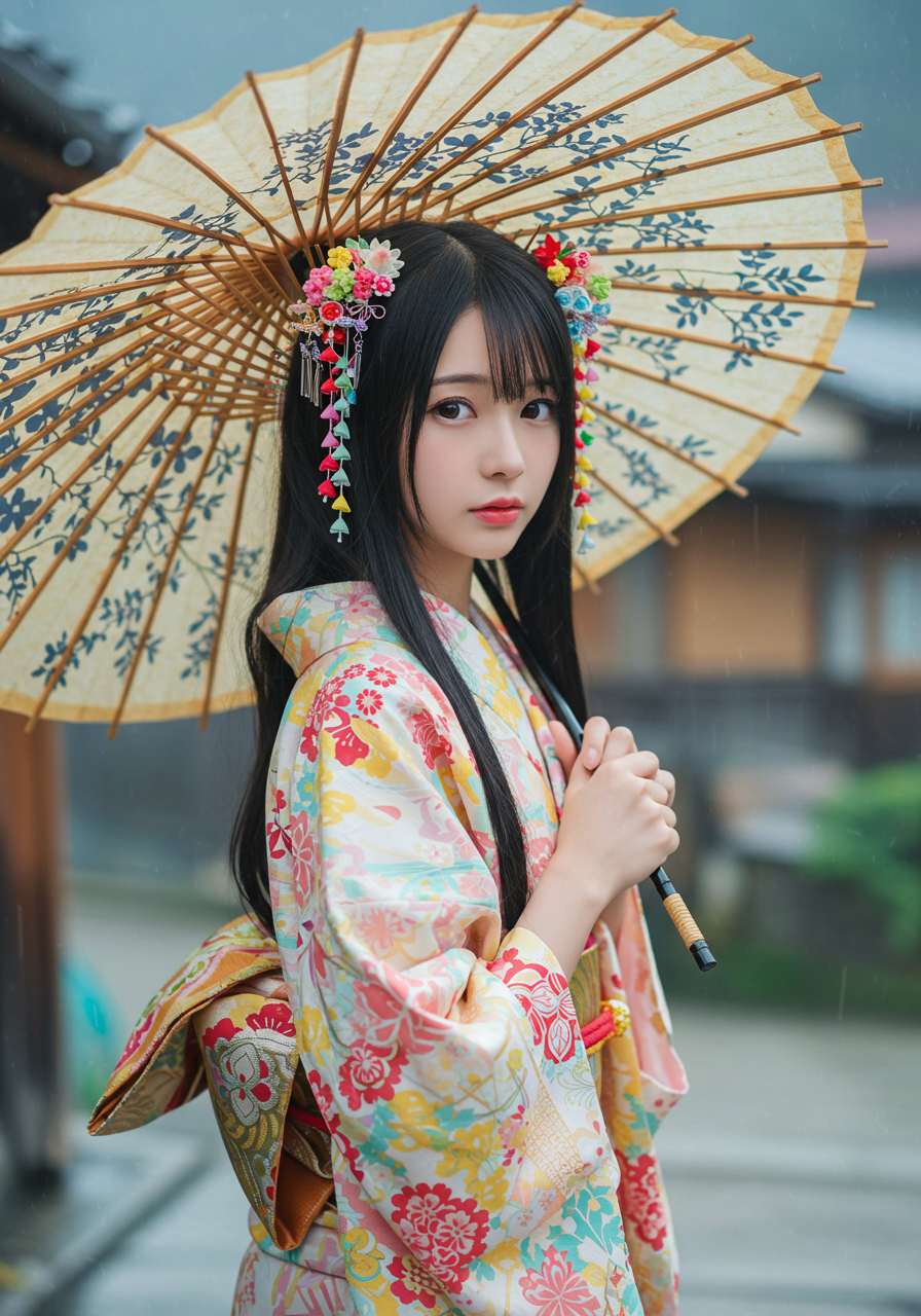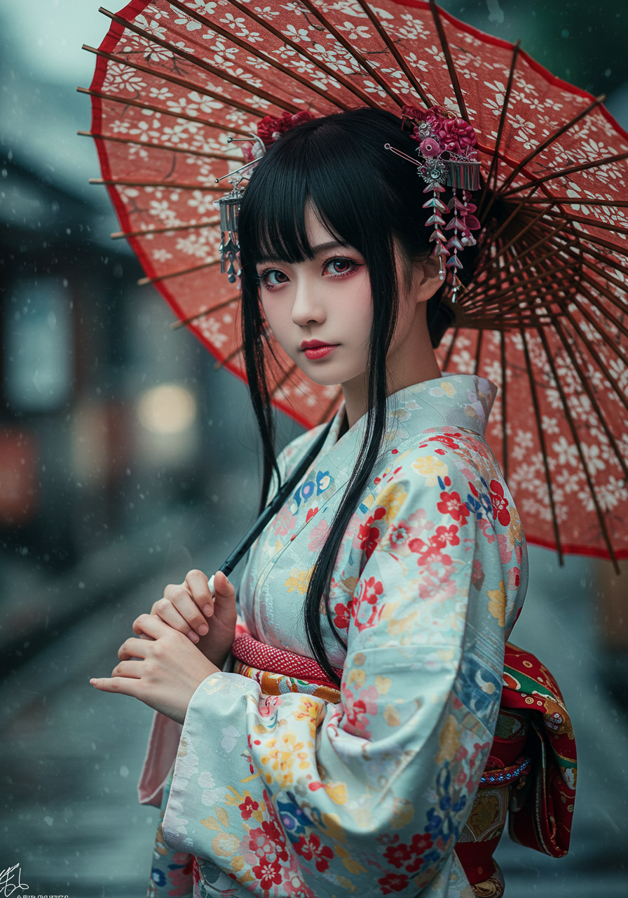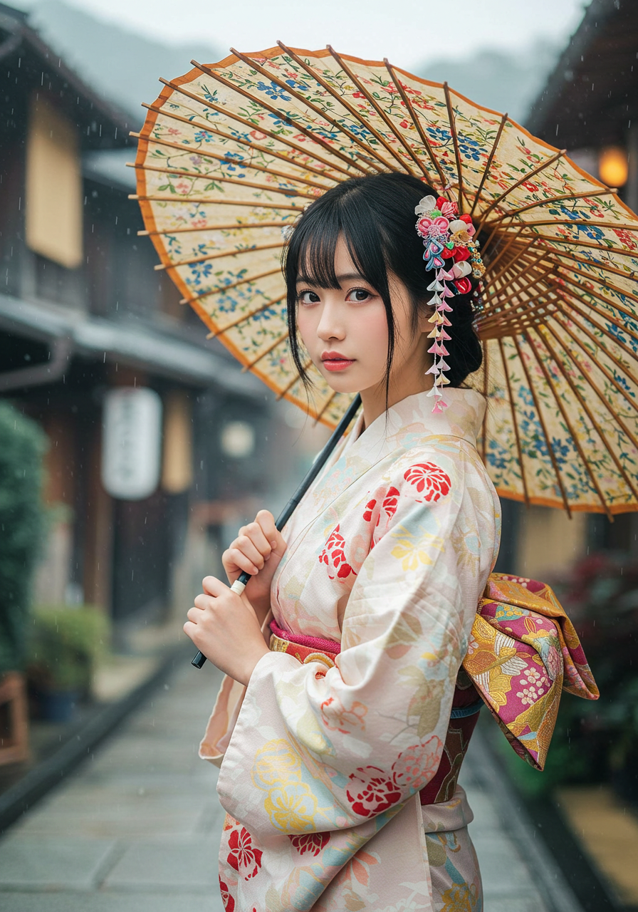 Subject: Type: 人物 Gender / Species: 女 Age / Condition: 若年成人、魅惑的 Features: 長く流れるような黒髪、繊細な優しそうな顔立ち、大きく表現力豊かな瞳、透き通るような肌、紅潮した唇、魅惑的な表情、柔らかく滑らかな肌質、装飾された日本の竹と油紙で作られた大きな番傘を持っている、頭には色鮮やかな様々なかんざしが多くきれいに飾り付けられ少女の美しさを際立たせている。 Clothing / Equipment: 柔らかく流れるような伝統的な日本の着物と帯締め、鮮やかな明るい色の水彩画のような模様。生地は透明感があり、背景と溶け込んでいるように見える。 Emotion / Pose: 見る者を見つめる魅惑的な視線、エロチシズム、落ち着きと神秘的な雰囲気を持ちながら優雅に立っている。 Setting: Location Type: 抽象的な空間 Specific Location: 江戸時代の雨が降る、古都京都の街並 Background Details: 完全に柔らかく、ぼかされ、流れるような日本家屋の背景。色がにじみ、混ざり合い、奥行きと動きを作り出している。背景には硬い線や明確な形はない。 Style: Art Style: 純粋な日本の風景 Artist / Photographer: 岡本太郎 Genre: 幻想的なポートレート Medium: 荒い紙のテクスチャ上の神秘的な写真 Lighting & Atmosphere: Lighting Type: 柔らかく、霧がかった、拡散した光、まるで優しい朝靄から差し込む光のよう Time of Day: 時間を感じさせない Color Palette: 主に柔らかい青、赤、黄、など様々な色。色は端が洗い流され、色あせているように見える Mood / Atmosphere: 穏やか、神秘的、そして優雅。雰囲気は信じられないほど柔らかく、夢のよう Composition & Angle: Shot Type: 腰から傘の先端までのポートレート Angle: 正面少し下から、彼女の顔と帯に焦点を当てる Perspective: 直接的で親密 Framing: 中央に配置し、様々な色と被写体が邪魔な要素なくフレーム全体を埋めるようにする。 Quality & Details: Resolution: 超高解像度、8K、複雑なでデジタル写真のディテール Realism: 非常にリアル、手描きされた水彩画にも見える美しいフォーム。本物の着物の染め具合のにじみやにじみ効果を微妙に示す。 Modifiers: 傑作、最高品質、超詳細、複雑なディテール、非常に装飾的、ArtStationでトレンド Negative Prompt: 角、低品質、解剖学的欠陥、奇形、醜い、ぼやけた、テキスト、透かし、署名、jpegのアーティファクト、腰から下
