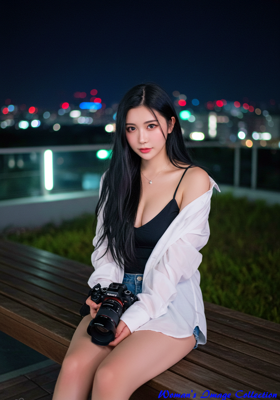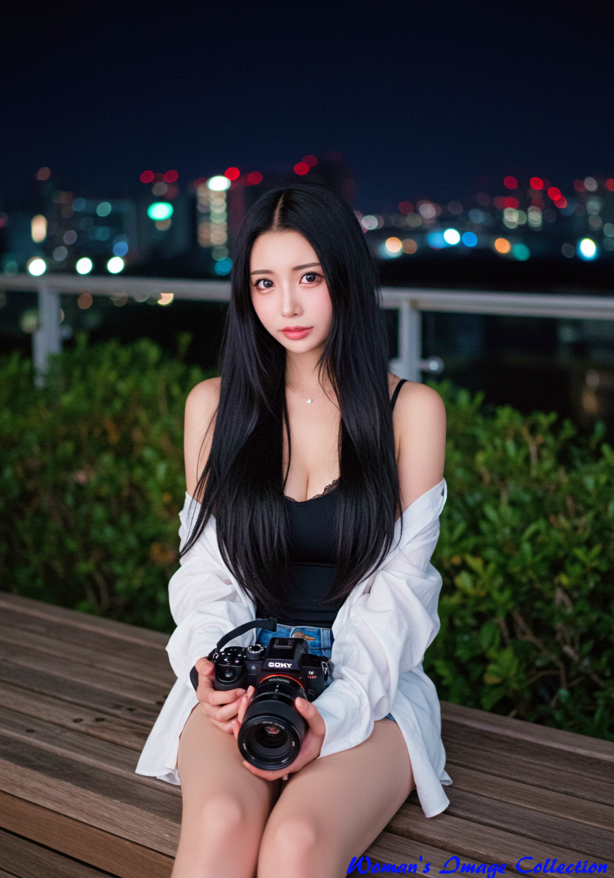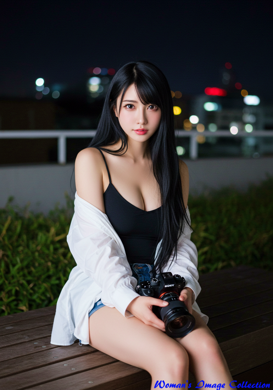 Clothing / Equipment: 黒のキャミソールまたはタンクトップ、オーバーサイズの白いシャツ(肩に羽織り、前を開けている)、薄いデニムのショートパンツ(または見えない)、手に持った一眼レフカメラ(SONYなどのプロ仕様)