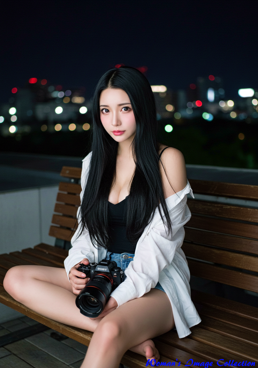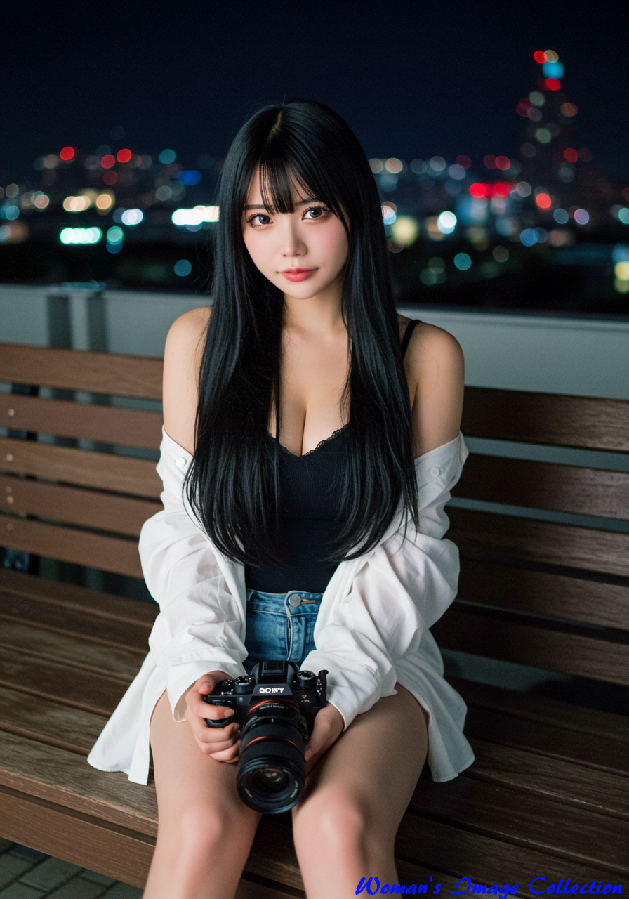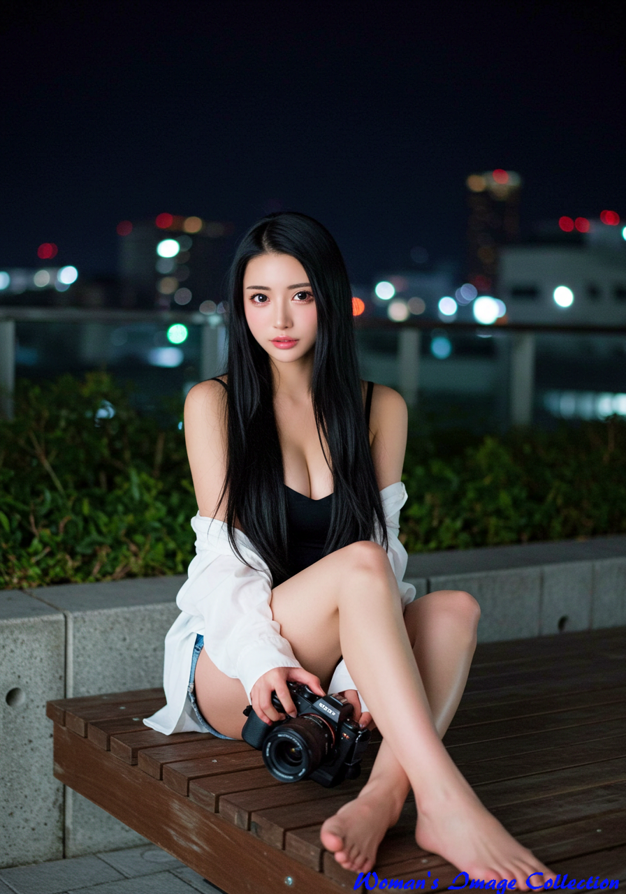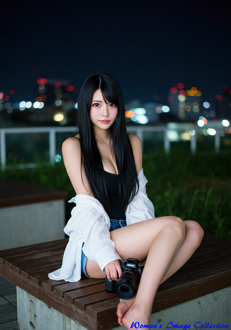 Clothing / Equipment: 黒のキャミソールまたはタンクトップ、オーバーサイズの白いシャツ(肩に羽織り、前を開けている)、薄いデニムのショートパンツ(または見えない)、手に持った一眼レフカメラ(SONYなどのプロ仕様)