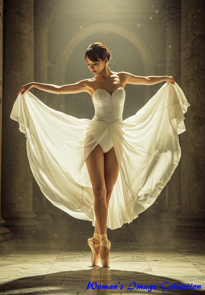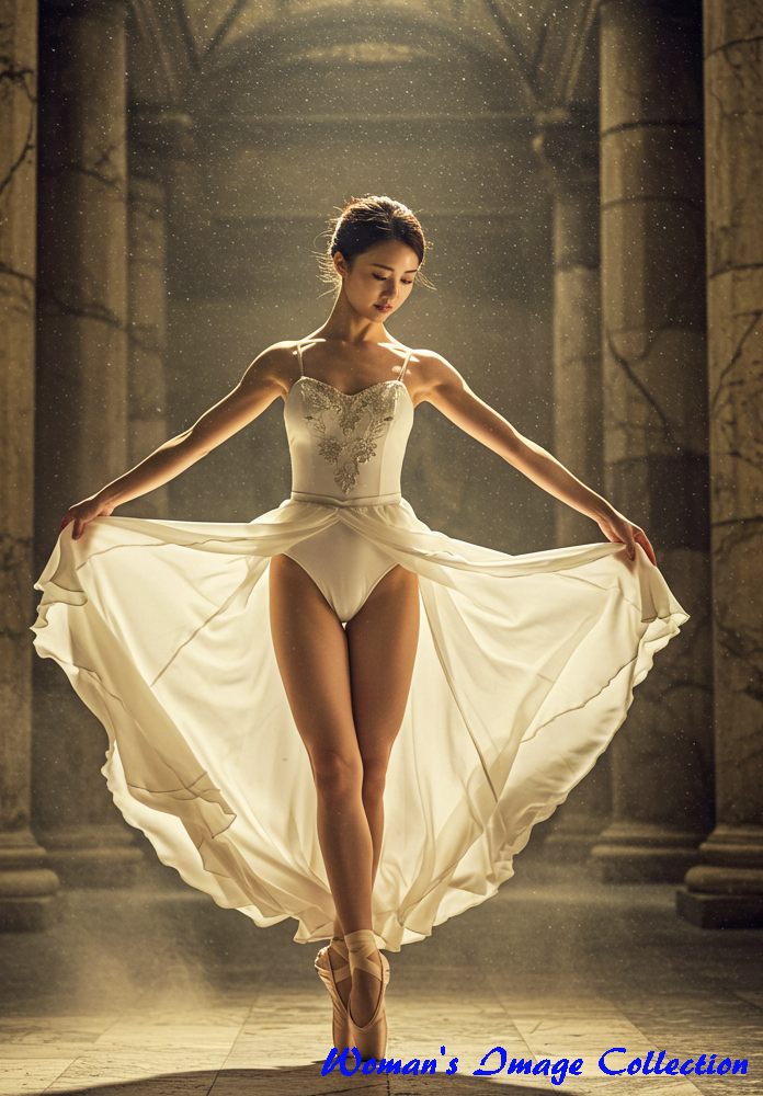 Subject: Type: 女性 Gender / Species: 足がとても長く豊満な美人な日本人女性 Age / Condition: 10代後半から20代前半、魅惑的鍛え抜かれ洗練された顔立ちと体型 Features: ダークブラウンの髪をタイトなシニヨンに結い、首筋のラインが美しい。陶器のような滑らかな肌、真剣で内省的な表情。 Clothing / Equipment: 胸元に繊細な刺繍が入った光沢のある白のビスチェ型レオタード。腰にはシアーでフリル状の白いチュチュ(スカート)を巻きつけている。スカートは動きに合わせて大きく広がり、透明感と柔らかさが感じられる。白いサテンのリボンで編み上げられたトウシューズ。 Emotion / Pose: 両腕を水平に広げ、スカートの端を指先で軽やかに持ち上げている瞬間。クロワゼ(交差した)の足元、頭を下に傾け、光と影の中でポーズを決めている。 Setting: Location Type: 屋内、歴史的建造物 Specific Location: 古代ローマやギリシャの神殿のような、崩れかけた石造りのホール。 Background Details: 重厚な茶色の石柱が左右にそびえ立ち、上部は崩れ落ちている。床は薄汚れた大理石または石畳で、光を反射し、水たまりや湿り気の質感が感じられる。空間全体に埃や霧状の粒子が漂っている。 Style: Art Style: 超写実的な超接写ポートレート写真、ファインアート・フォトグラフィー、ルネサンス絵画の光と影 Artist / Photographer: Annie Leibovitz (ドラマティックな構成), Helmut Newton (強いコントラスト), バレエ専門の舞台写真家 Genre: ダンス、ドラマティックアート、ファンタジー Medium: 高解像度デジタル写真 Lighting & Atmosphere: Lighting Type: 劇的な上方からのスポットライト(シアター照明)。光は黄色がかった暖色で、上部から差し込み、床に長い影を作る。逆光が被写体の輪郭を強く縁取る。 Time of Day: 夜、または劇場の舞台上 Color Palette: 光に照らされた白とゴールド、背景の深い茶色と黒のシャドウ。強いコントラスト。 Mood / Atmosphere: 荘厳、神秘的、ドラマティック、感情的、優雅。空気中に漂う光の粒子が雰囲気を強調している。 Composition & Angle: Shot Type: 上半身ショット Angle: アイレベルまたはごくわずかなローアングルで、被写体の高貴さと優雅さを強調。 Perspective: 極めて浅い被写界深度で、背景の柱は大きくぼかし、バレリーナにのみシャープな焦点を合わせる。 Framing: 垂直構図。周りの空間は狭く構図全体にバレリーナを配置する。 Quality & Details: Resolution: 超高解像度、16K、プロ仕様のデジタル一眼レフで撮影されたような本物の写真のディテール Realism: 超リアル、フォトグラフィック、肌の質感、衣装の織り目、汗の微細な光沢まで再現。 Modifiers: 傑作、最高品質、映画のワンシーンのような、複雑なディテール、超精密な描写、完璧なライティングと構図、ヴォリュームのある光(Volumetric Light) Negative Prompt:低画質、ぼやけた、奇形、不自然な手、変なポーズ、変な顔、変な目、ブレている、不自然なポーズ、余分な指や手、歪んだ顔、汚れ 、裸体、子供、アニメ、漫画、3D