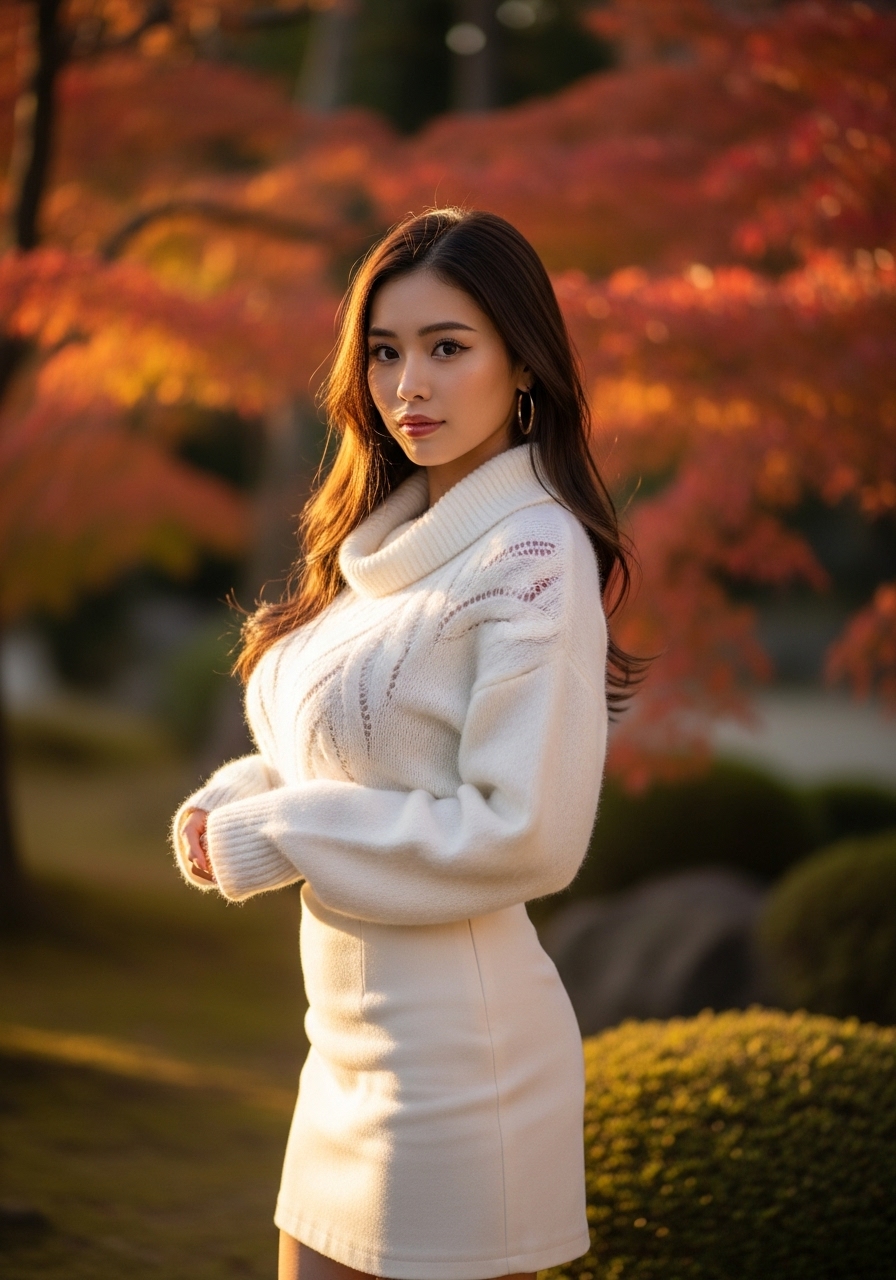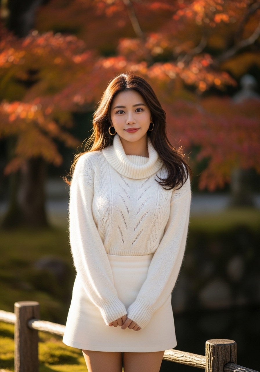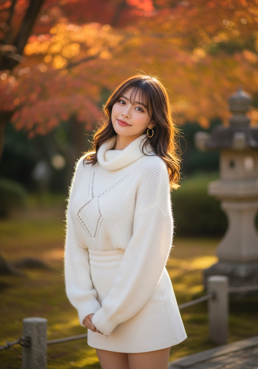 Subject (被写体): Type: 人物 Gender / Species: 日本人女性 Age / Condition: 10代後半から20代前半。清楚で愛らしい幼さを残した日本人らしい顔立ち。 Features: 豊満でグラマラスな体型、キラキラした瞳を持つ妖精のような美しさ、健康的な輝きのある肌。かわいい笑顔が美しい女性。 Clothing / Equipment: バズる白い秋服。上質なふわふわの白いニットまたはカシミヤのタートルネック。豊かな胸元を強調するデザイン。耳元にはゴールドのシンプルなフープピアス。ミニスカート。 Emotion / Pose: 見ている人を笑顔にする、最高の純粋で可愛い、日本人女性特有の柔らかな笑顔。首筋をわずかに傾けた優雅な立ポーズ。 メイク: 繊細でナチュラルなメイクの美しい女性。ふっくらとしたやや膨らんだ唇に、くっきりとしたキューピッドボウ。自然なピーチピンクのリップスティックが唇を彩る。豊かな瞳は優しいアイライナーとソフトなブラウンのアイシャドウで強調されている。Setting (場所・背景): Location Type: 屋外、秋の自然風景 Specific Location: 朝日の当たる美しい紅葉の公園。または陽光が差し込む、落ち着いた雰囲気の日本庭園。 Background Details: 白い服とベストマッチする、目立つ暖色系の秋の自然背景。鮮やかな紅葉の赤、オレンジ、黄色のグラデーション。または、緑がかった苔と石灯籠が見える日本の伝統的な風景。Style (スタイル・画風): Art Style: フォトリアリスティック。Pinterestのトップトレンドのような、温かみのある高解像度ポートレート。 Artist / Photographer: 現代の日本人ライフスタイル・ファッションフォトグラファー、ソフトフォーカスを巧みに使うポートレートアーティスト。 Genre: ファッションポートレート、ライフスタイル、秋の風景。 Medium: 超高精細デジタル写真。Lighting & Atmosphere (光・雰囲気): Lighting Type: 強烈なリムライト 、劇的なサイドライティング 、柔らかく温かいゴールデンアワーのような自然光。肌の透明感と美しさを最大限に引き出すライティング。 Time of Day: 日中の暖かい光。 Color Palette: 白と対比する温かい茶色、オレンジ、ゴールドの秋の自然色彩。 Mood / Atmosphere: 魅惑的、温かい、リラックスした、圧倒的に可愛い、居心地の良い、立体的に浮き上がる。Composition & Angle (構図・アングル): Shot Type: 全身写真。ニットの質感と豊かな表情に焦点を当てる。 Angle: わずかなローアングルで、可愛らしさと柔らかい雰囲気を強調する。 Perspective: 非常に浅い被写界深度 。白い服を背景から浮き立たせる。 Framing: 豊満な美しさと柔らかな雰囲気にフォーカスしたクローズアップ構図。Quality & Details (品質・詳細): Resolution: 超高解像度、8k。肌、髪、ニットの編み目の質感、メイクのディテールを究極まで再現。 Realism: 超リアル、プロ中のプロが撮影した最高級の写真レベル、3Dレンダリングのように浮き上がる表現。 Modifiers: 傑作、最高品質、非常に詳細、絶対バズる、Pinterestで大人気、芸術的、温かみのある、ボリュームのある光、クレイロスクーロ。Negative Prompt: 低画質、ぼやけた、奇形、低解像度、アーティファクト、醜い、老けて見える、子供の顔、不自然なポーズ、脚、ウエストライン以下の要素、夏の服装、寒色の背景、ピンタレストの禁止用語、暗い、汚い、西洋的な顔立ち。