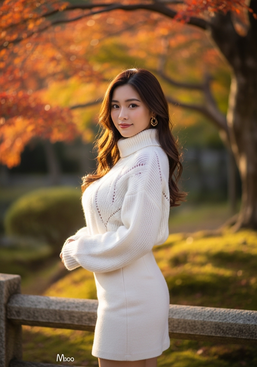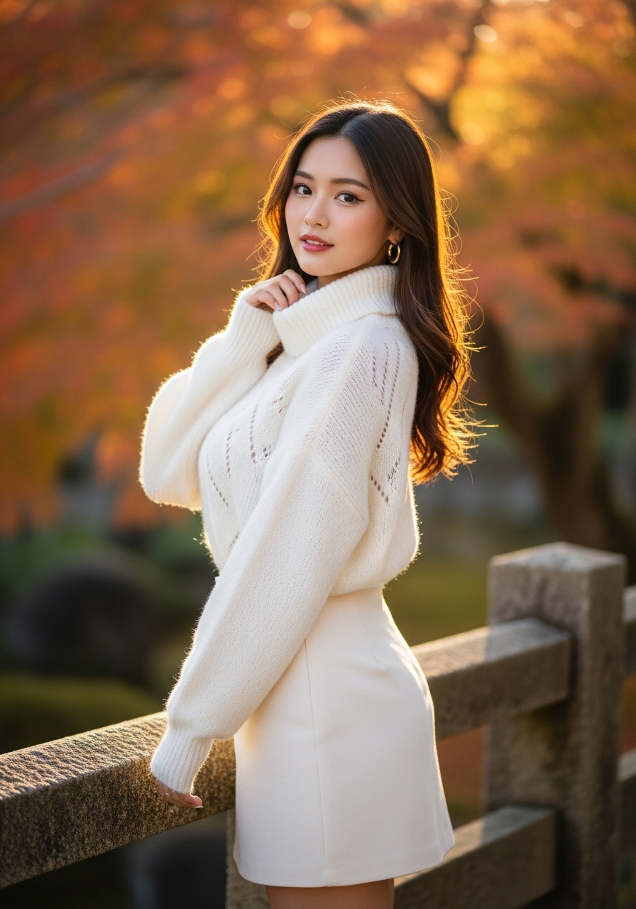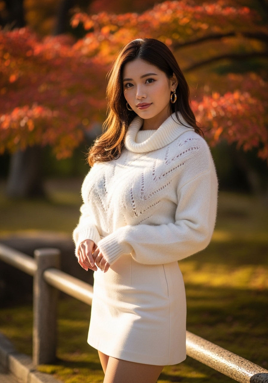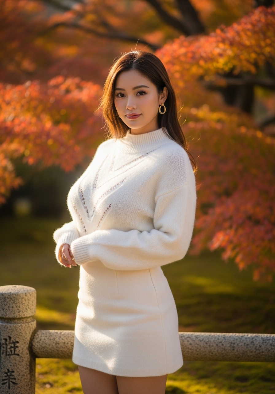 Subject (被写体): Type: 人物 Gender / Species: 日本人女性 Age / Condition: 10代後半から20代前半。清楚で愛らしい幼さを残した日本人らしい顔立ち。 Features: 豊満でグラマラスな体型、キラキラした瞳を持つ妖精のような美しさ、健康的な輝きのある肌。かわいい笑顔が美しい女性。 Clothing / Equipment: バズる白い秋服。上質なふわふわの白いニットまたはカシミヤのタートルネック。豊かな胸元を強調するデザイン。耳元にはゴールドのシンプルなフープピアス。ミニスカート。 Emotion / Pose: 見ている人を笑顔にする、最高の純粋で可愛い、日本人女性特有の柔らかな笑顔。首筋をわずかに傾けた優雅な立ポーズ。 メイク: 繊細でナチュラルなメイクの美しい女性。ふっくらとしたやや膨らんだ唇に、くっきりとしたキューピッドボウ。自然なピーチピンクのリップスティックが唇を彩る。豊かな瞳は優しいアイライナーとソフトなブラウンのアイシャドウで強調されている。Setting (場所・背景): Location Type: 屋外、秋の自然風景 Specific Location: 朝日の当たる美しい紅葉の公園。または陽光が差し込む、落ち着いた雰囲気の日本庭園。 Background Details: 白い服とベストマッチする、目立つ暖色系の秋の自然背景。鮮やかな紅葉の赤、オレンジ、黄色のグラデーション。または、緑がかった苔と石灯籠が見える日本の伝統的な風景。Style (スタイル・画風): Art Style: フォトリアリスティック。Pinterestのトップトレンドのような、温かみのある高解像度ポートレート。 Artist / Photographer: 現代の日本人ライフスタイル・ファッションフォトグラファー、ソフトフォーカスを巧みに使うポートレートアーティスト。 Genre: ファッションポートレート、ライフスタイル、秋の風景。 Medium: 超高精細デジタル写真。Lighting & Atmosphere (光・雰囲気): Lighting Type: 強烈なリムライト 、劇的なサイドライティング 、柔らかく温かいゴールデンアワーのような自然光。肌の透明感と美しさを最大限に引き出すライティング。 Time of Day: 日中の暖かい光。 Color Palette: 白と対比する温かい茶色、オレンジ、ゴールドの秋の自然色彩。 Mood / Atmosphere: 魅惑的、温かい、リラックスした、圧倒的に可愛い、居心地の良い、立体的に浮き上がる。Composition & Angle (構図・アングル): Shot Type: 全身写真。ニットの質感と豊かな表情に焦点を当てる。 Angle: わずかなローアングルで、可愛らしさと柔らかい雰囲気を強調する。 Perspective: 非常に浅い被写界深度 。白い服を背景から浮き立たせる。 Framing: 豊満な美しさと柔らかな雰囲気にフォーカスしたクローズアップ構図。Quality & Details (品質・詳細): Resolution: 超高解像度、8k。肌、髪、ニットの編み目の質感、メイクのディテールを究極まで再現。 Realism: 超リアル、プロ中のプロが撮影した最高級の写真レベル、3Dレンダリングのように浮き上がる表現。 Modifiers: 傑作、最高品質、非常に詳細、絶対バズる、Pinterestで大人気、芸術的、温かみのある、ボリュームのある光、クレイロスクーロ。Negative Prompt: 低画質、ぼやけた、奇形、低解像度、アーティファクト、醜い、老けて見える、子供の顔、不自然なポーズ、脚、ウエストライン以下の要素、夏の服装、寒色の背景、ピンタレストの禁止用語、暗い、汚い、西洋的な顔立ち。