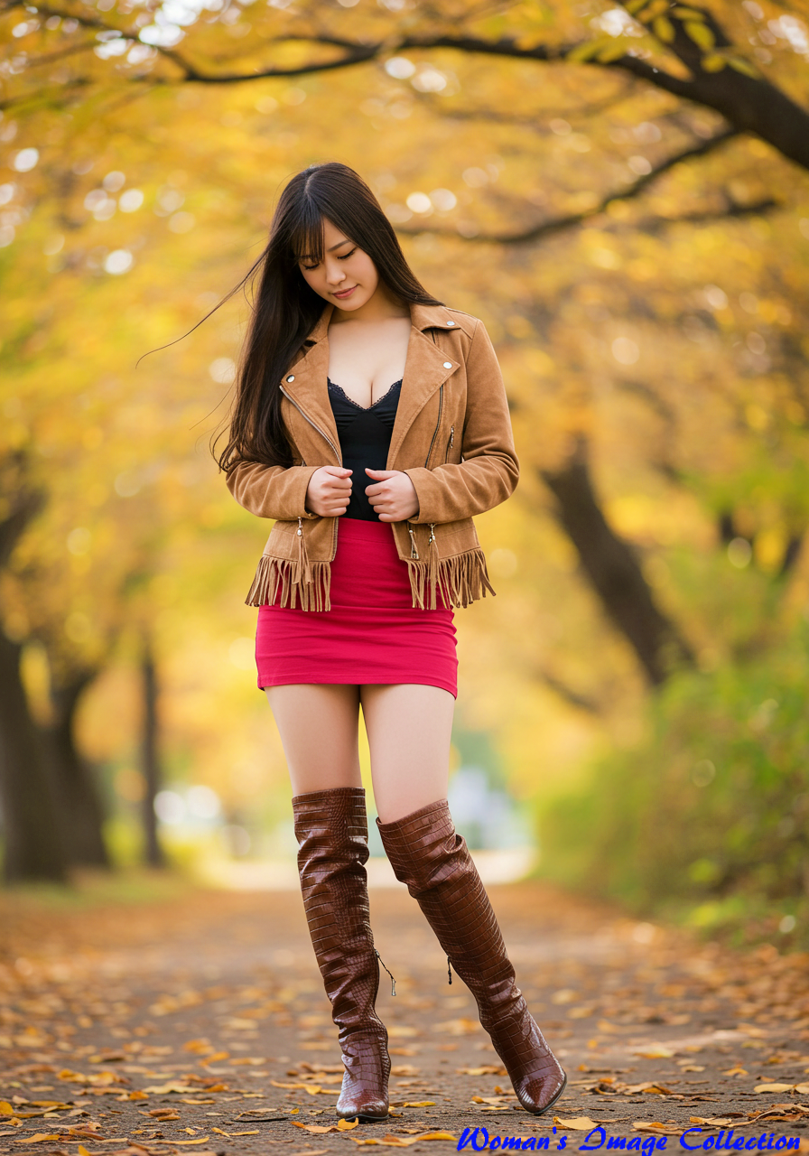 キャミソールとミニスカとの上にキャメル色のライダースジャケット、ニーハイブーツの女性のプロンプト。秋の紅葉の中に立たせて、赤系の服を着せてみました。秋らしいいいい感じが出ていると思います。