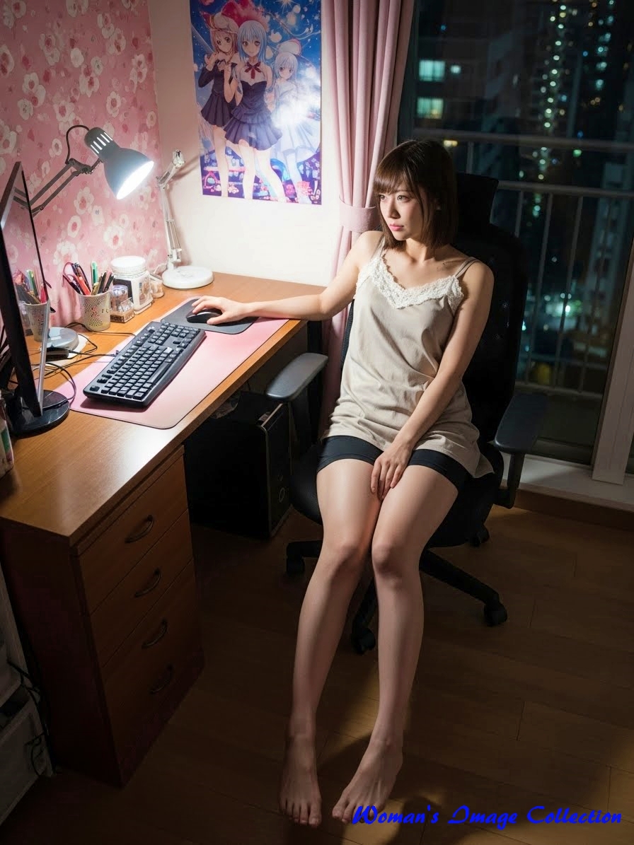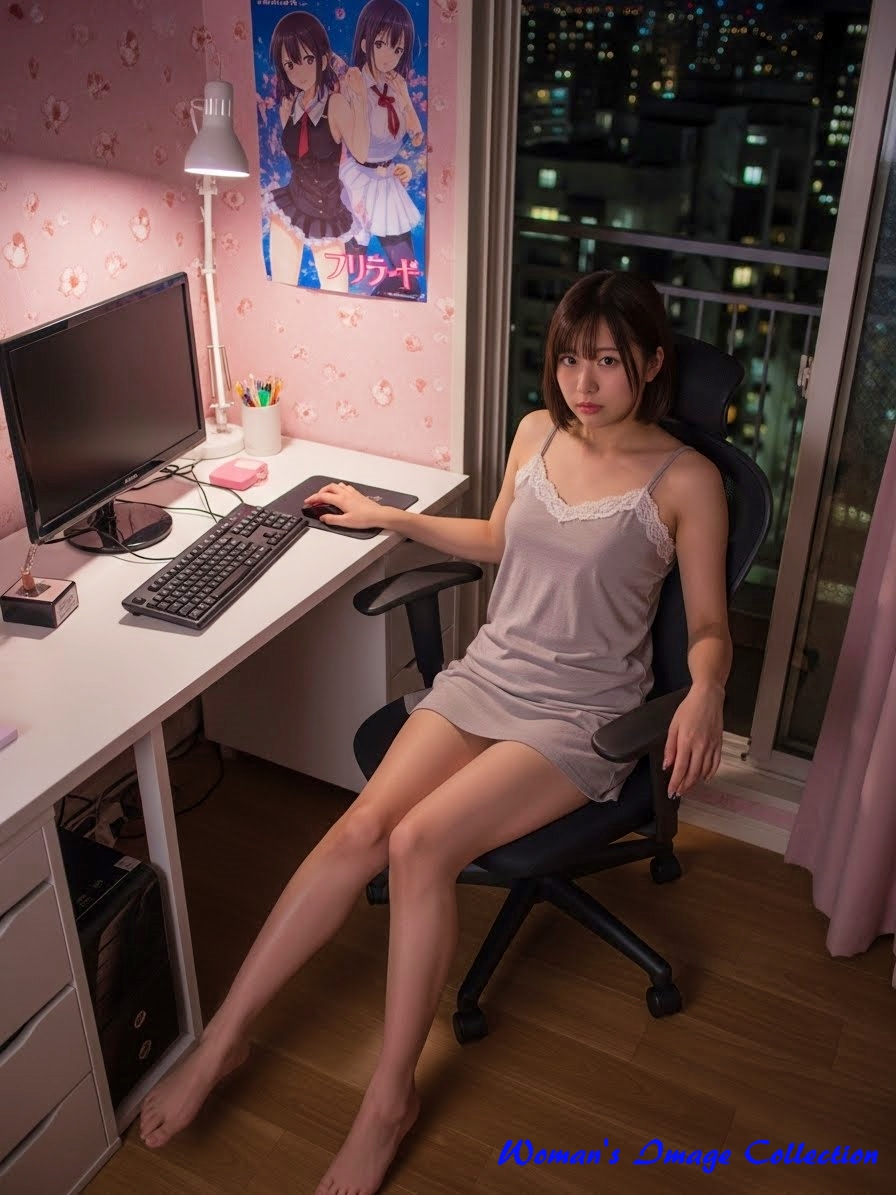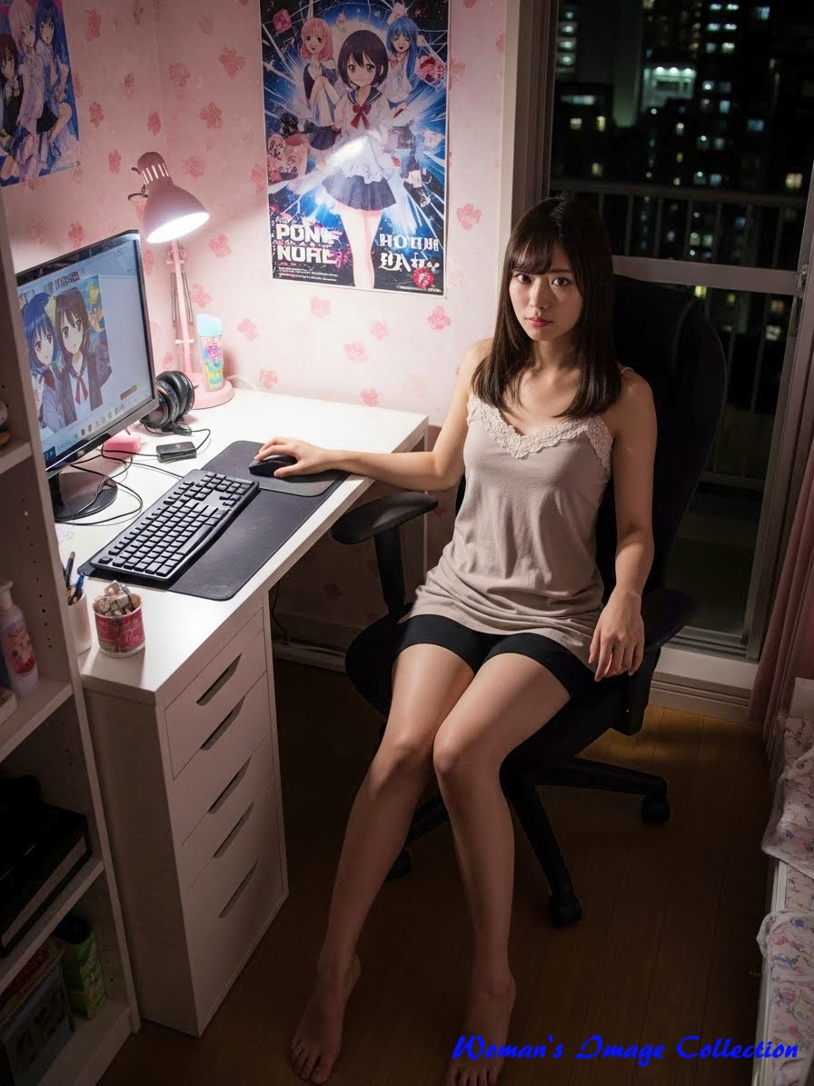 今回は、自宅でパソコンをしている女性のプロンプトです。