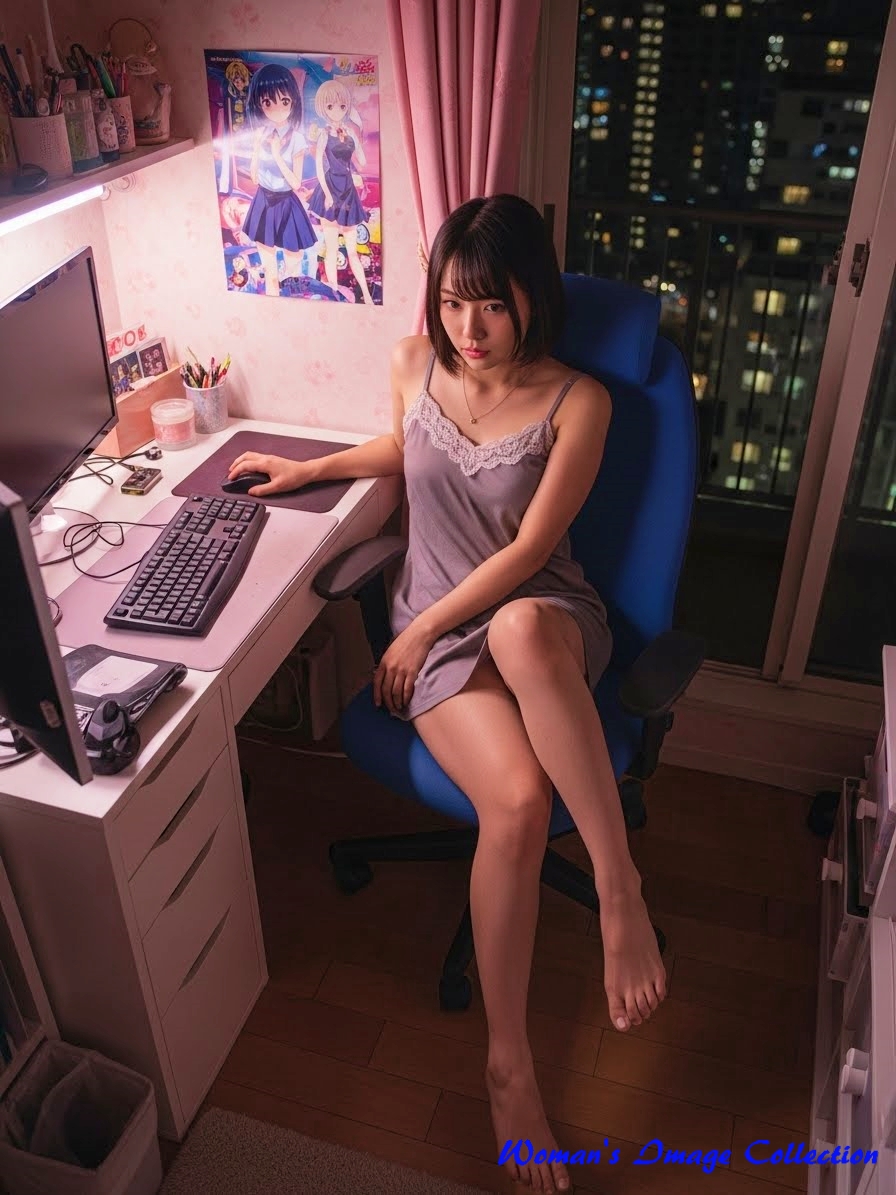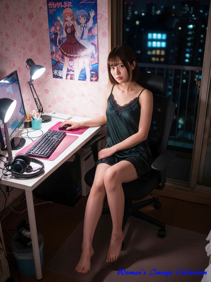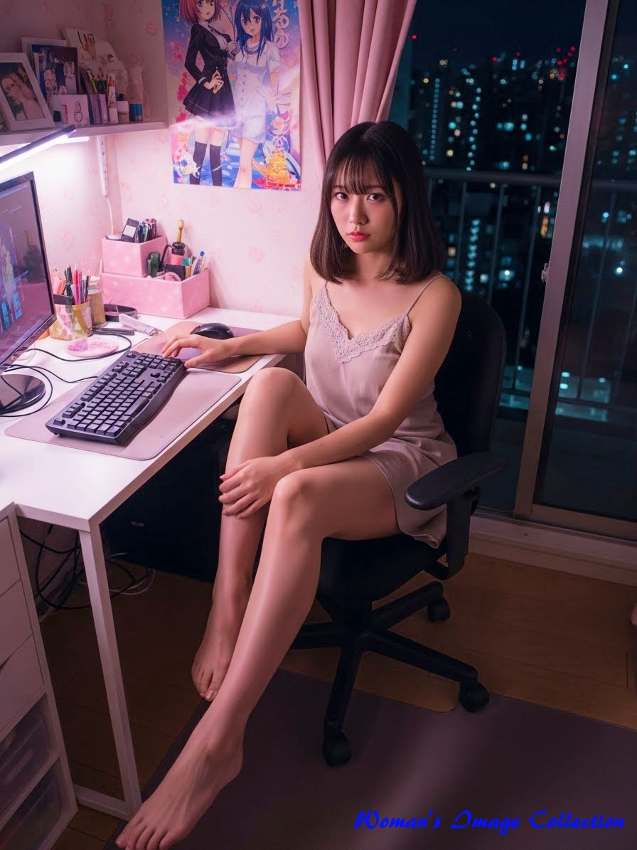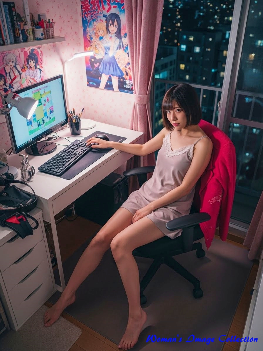 今回は、自宅でパソコンをしている女性のプロンプトです。