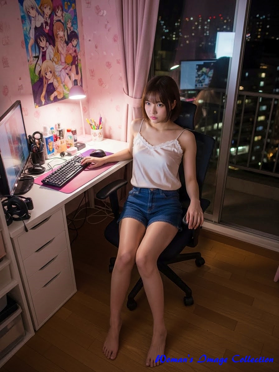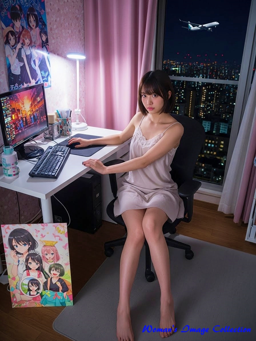 背景 (机, 椅子, アニメのポスター, ピンクの壁紙, 窓から見えるビルの夜景),