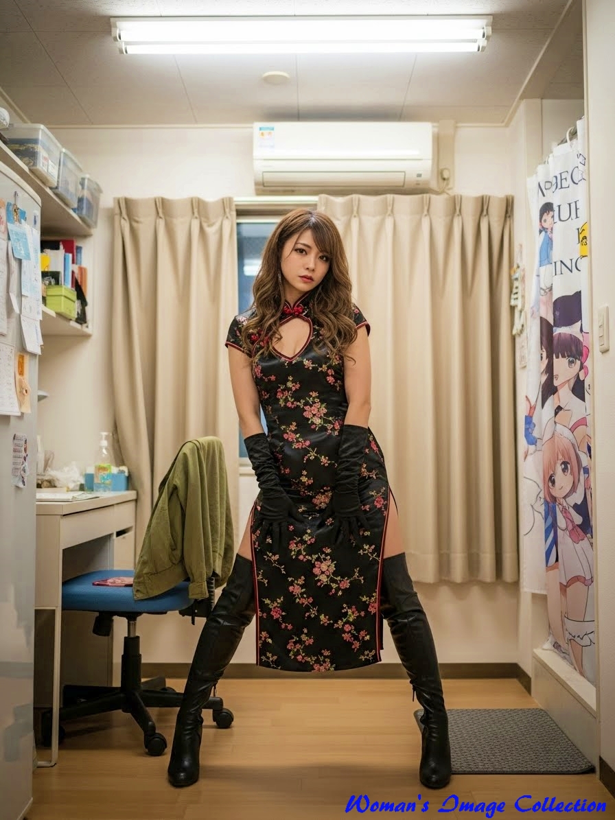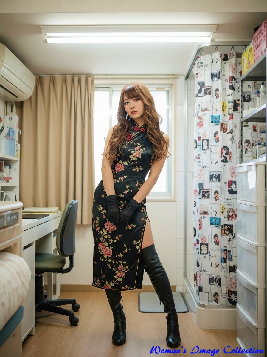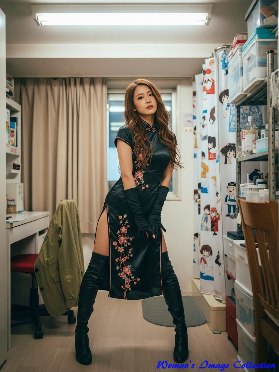 服装 (黒いチャイナドレス, 花柄刺繍, 深いスリット, 黒いサイハイブーツ, 黒い手袋),