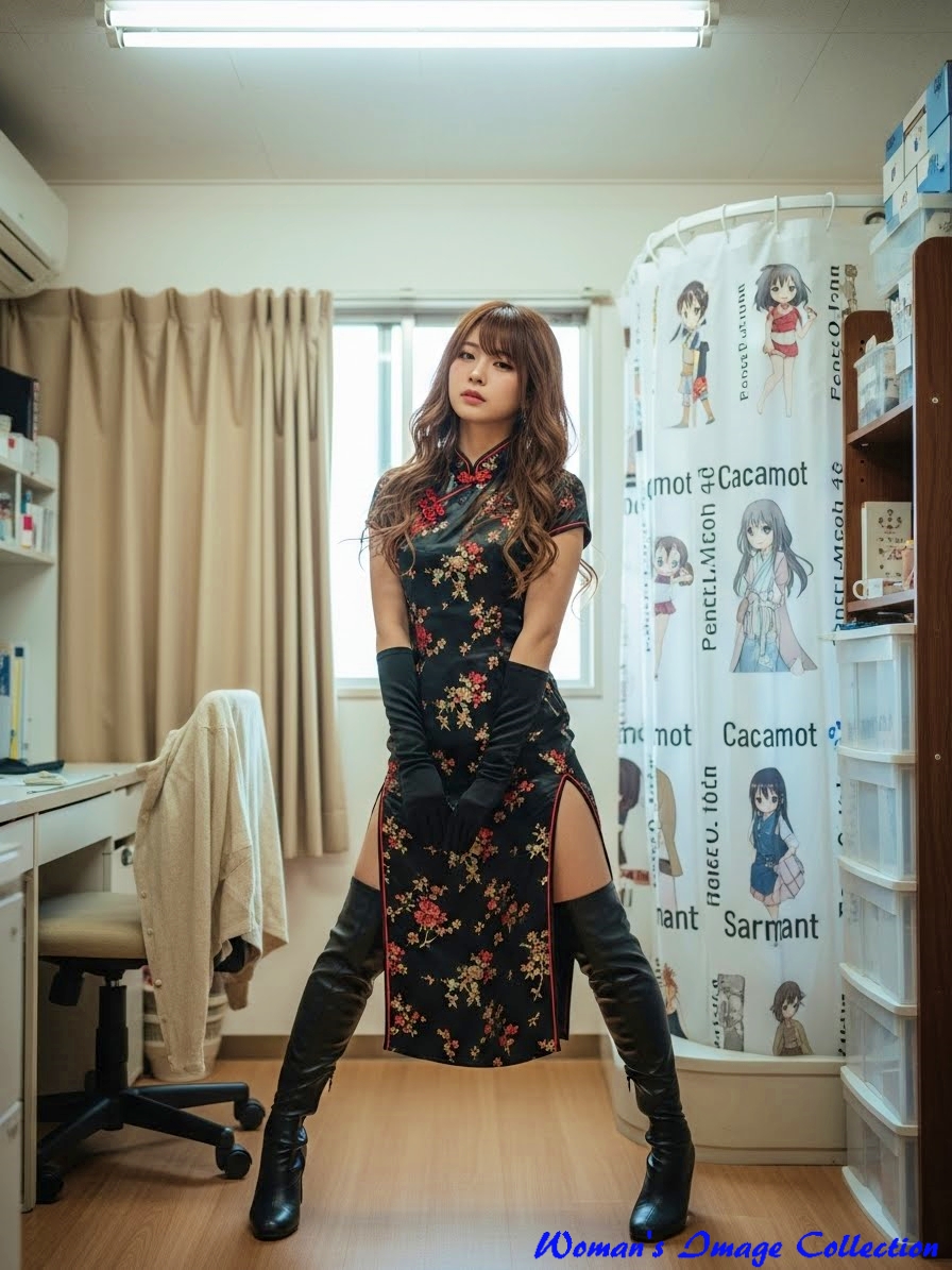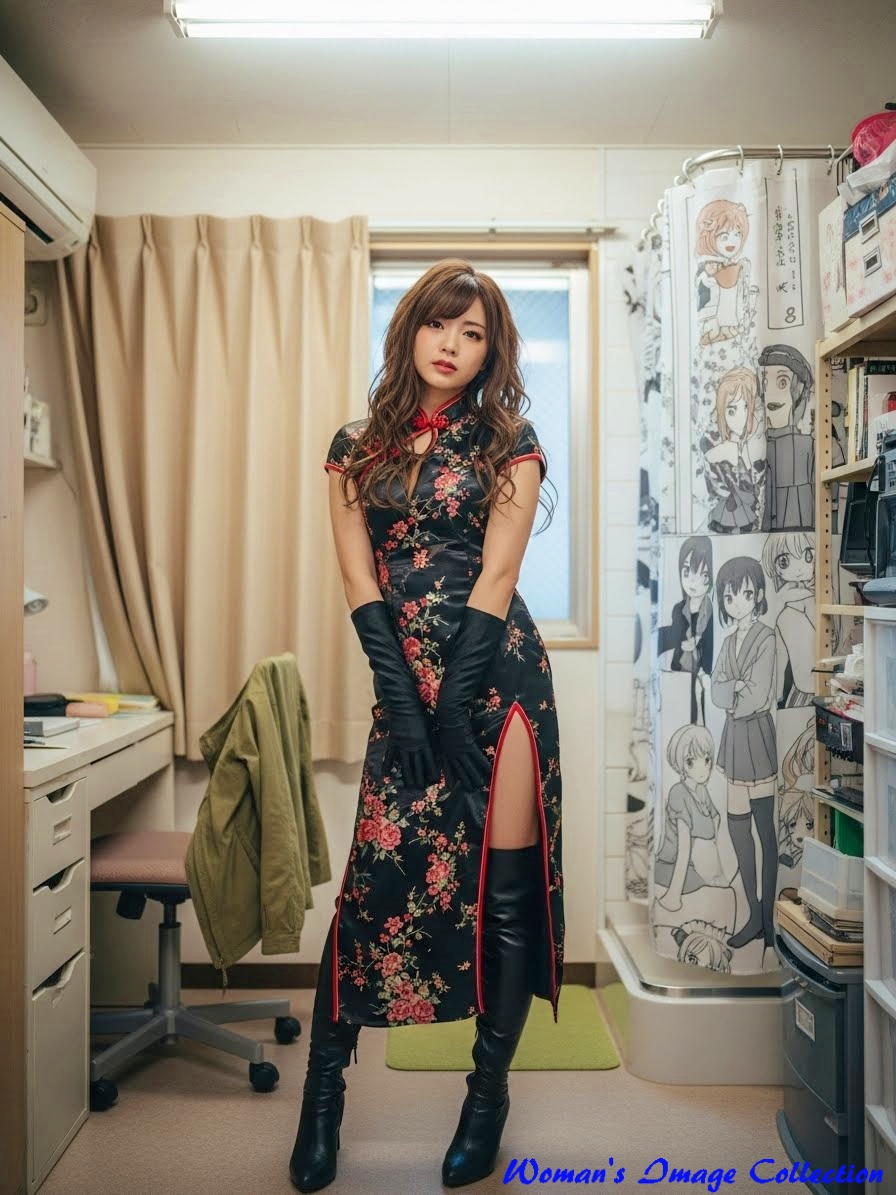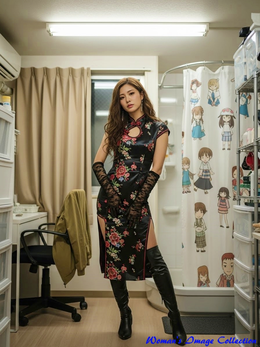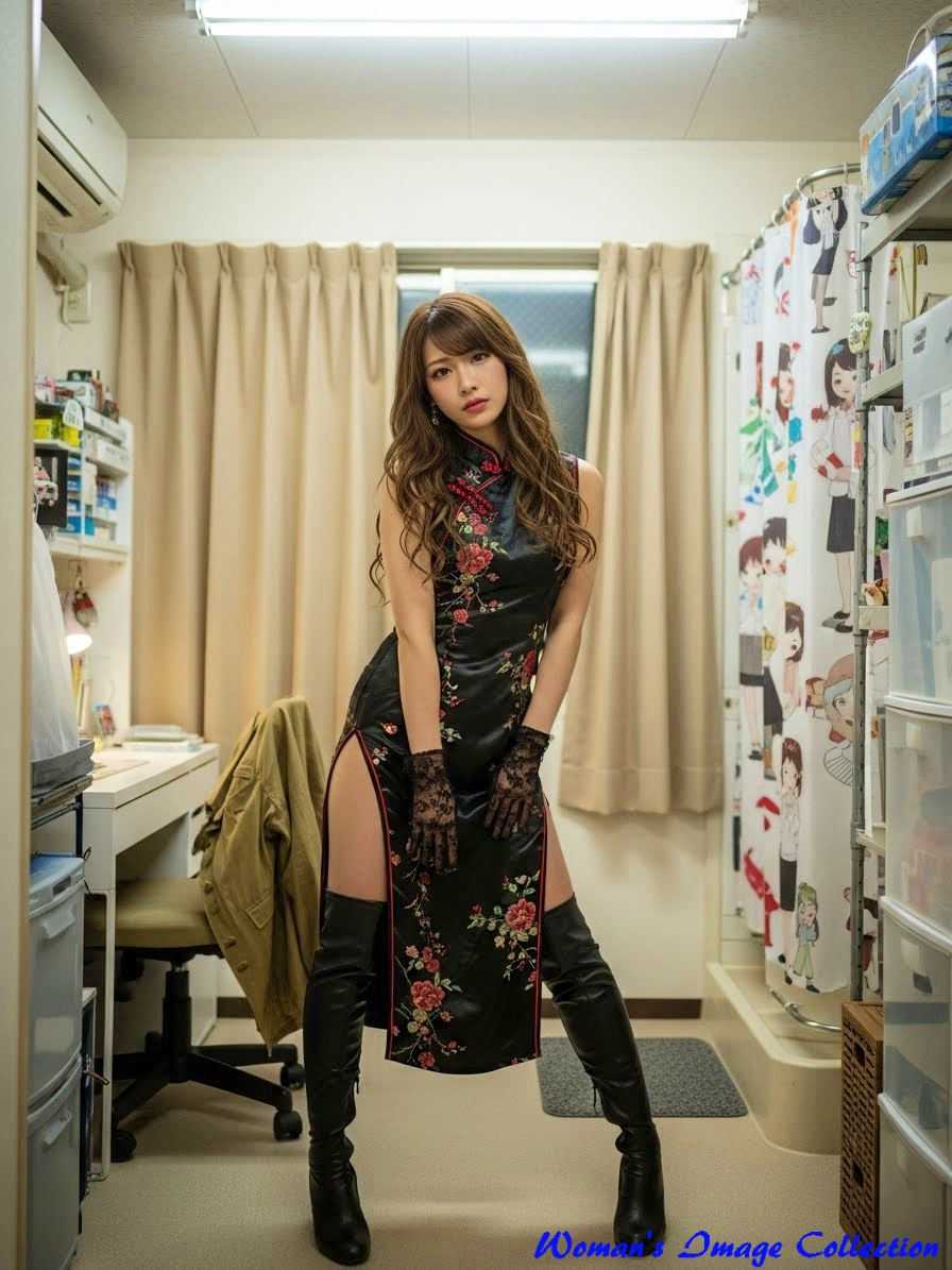 服装 (黒いチャイナドレス, 花柄刺繍, 深いスリット, 黒いサイハイブーツ, 黒い手袋),
