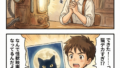 背景 (自室のコンパクトで生活感のある部屋, ベージュのカーテン, 机と椅子, 収納棚, キャラクター柄のシャワーカーテン, 雑然として温かみのある空間),