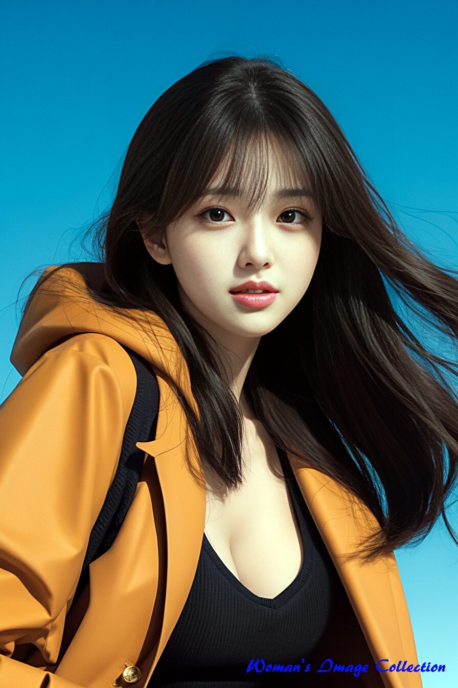 この画像は、自然体の魅力と躍動感に満ちた、美しいポートレートです。ファッション、背景、そしてモデルの表情が絶妙に調和し、シンプルでありながらも心を惹きつける一枚に仕上がっています。特にオレンジのアウターと青空のコントラスト、風に吹かれた髪の動きは、リアルな美しさと爽やかさを引き立てる重要な要素です。